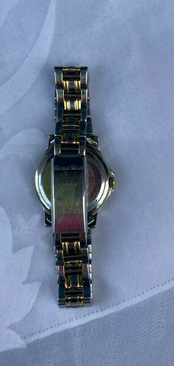 Vintage Women's Hugo Max Silver Tone & 18KT Gold Plate Watch~Black & Silver Face