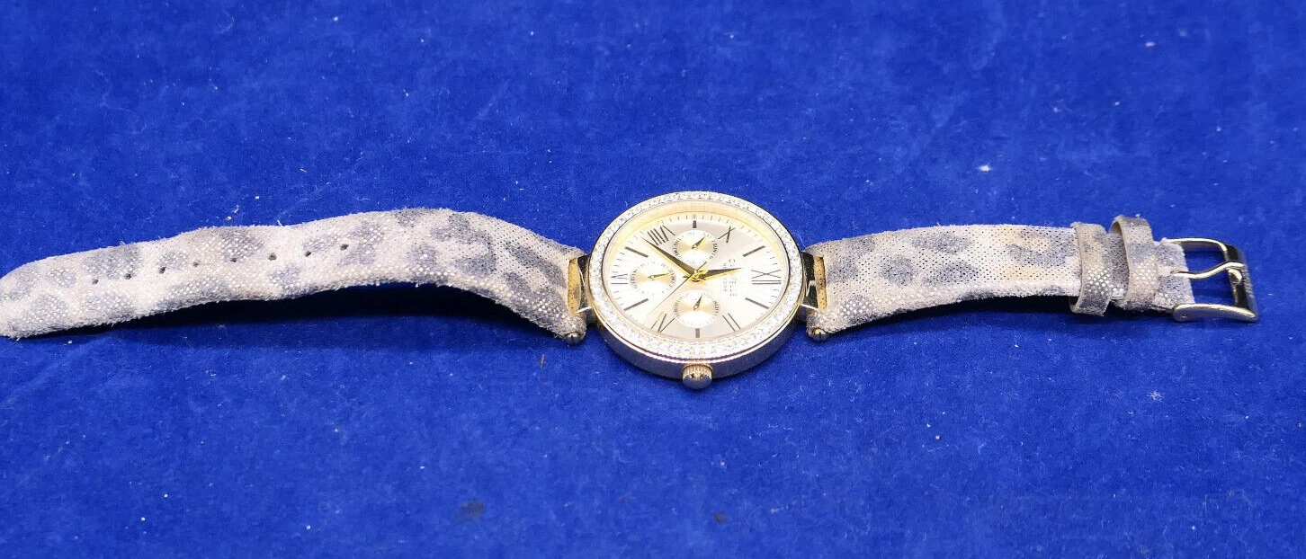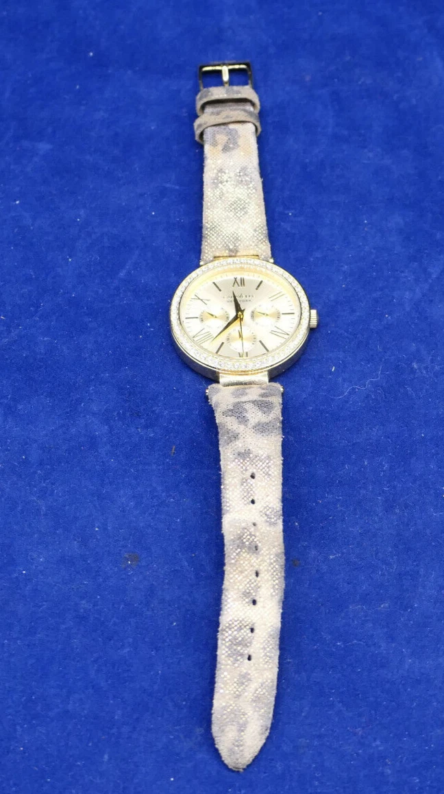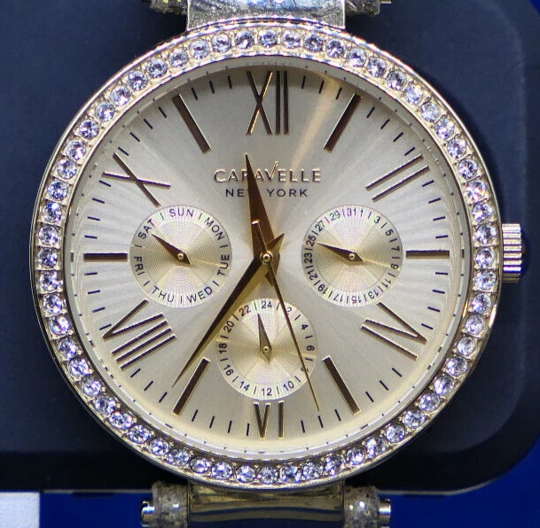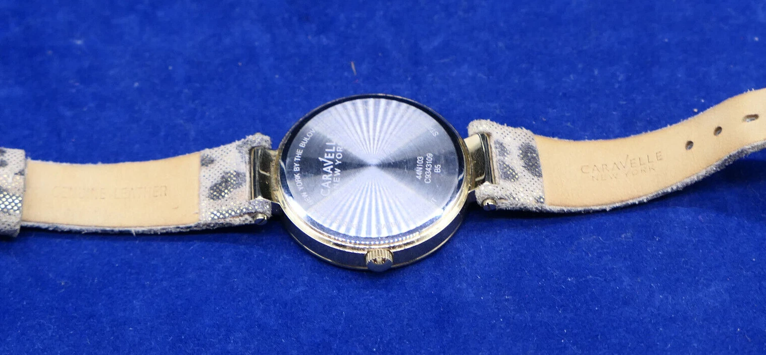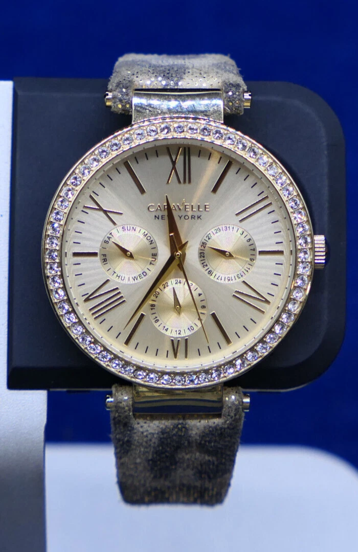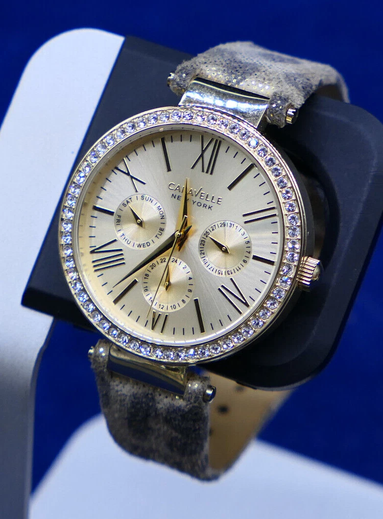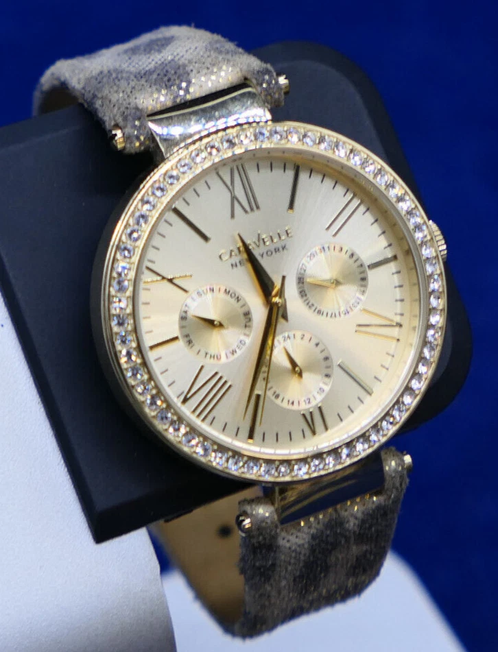 Caravelle New York 44N103 Women's Round Gold Tone Leopard Analog Day Date Watch