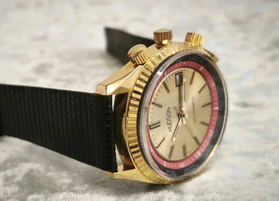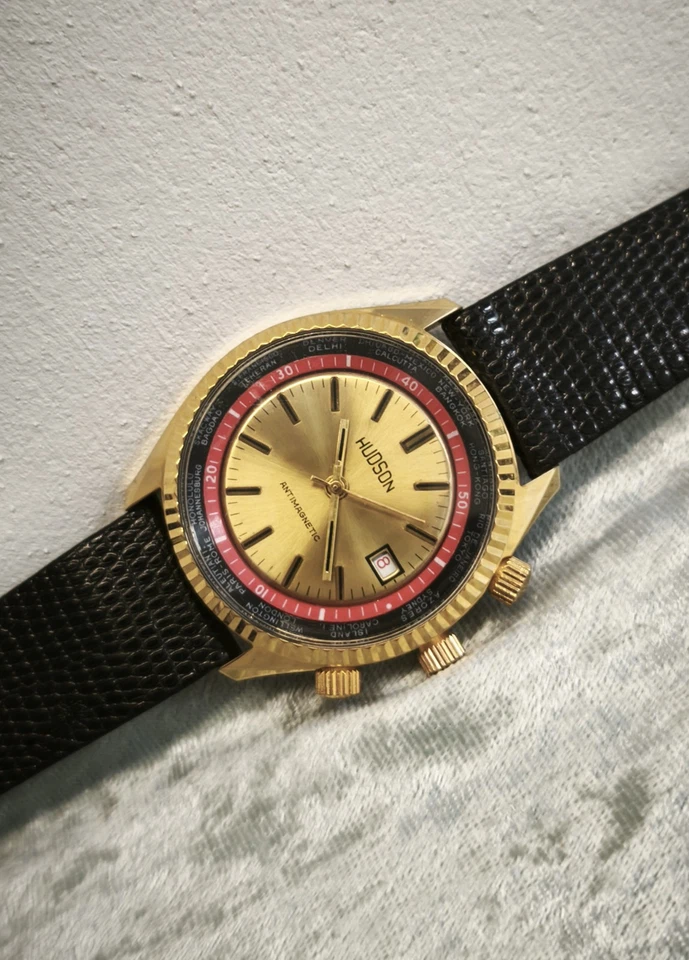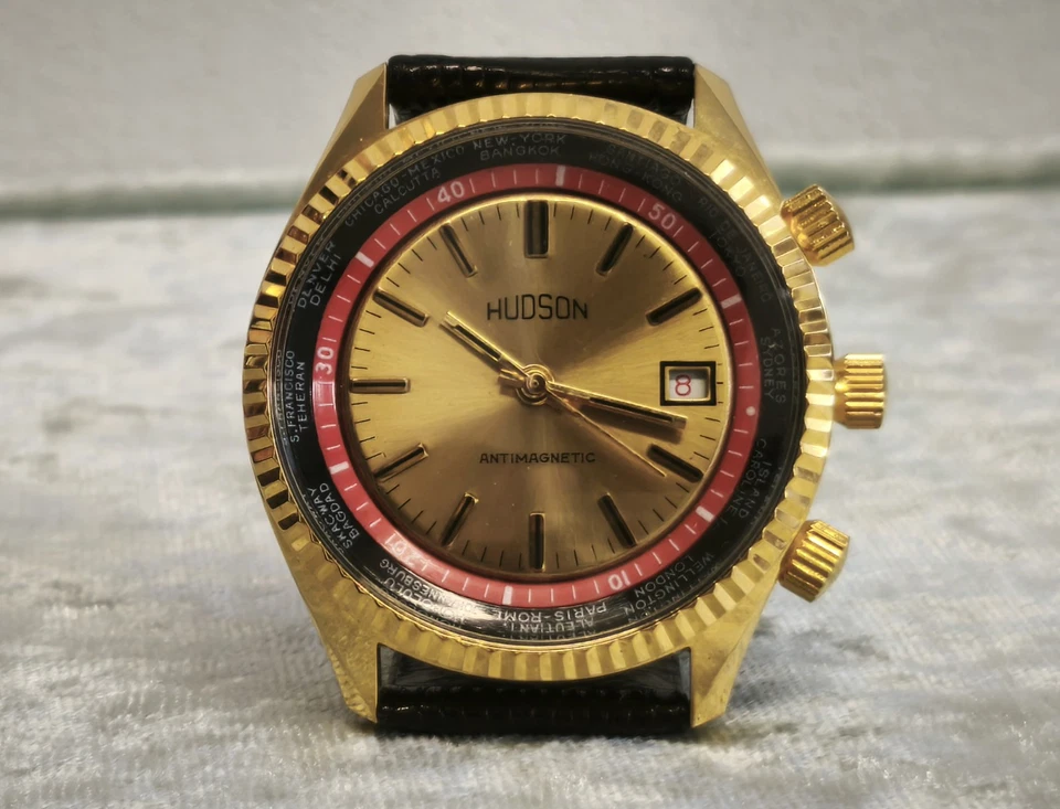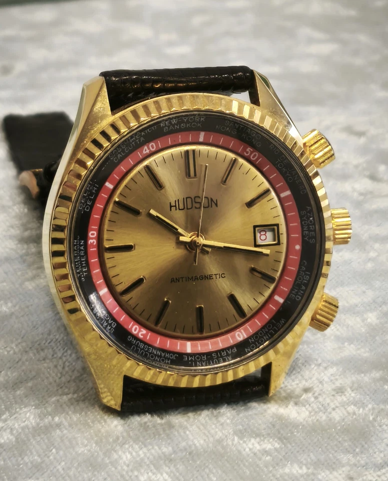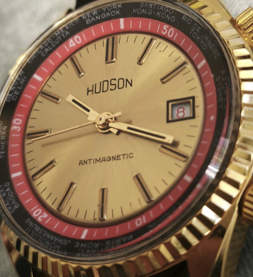 RARE VINTAGE NEW OLD STOCK "HUDSON" GMT SWISS MADE WRIST WATCH, FROM 1970 WORKS!