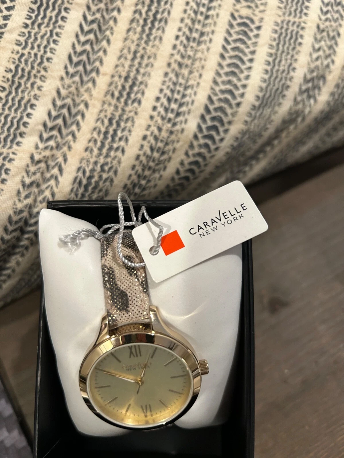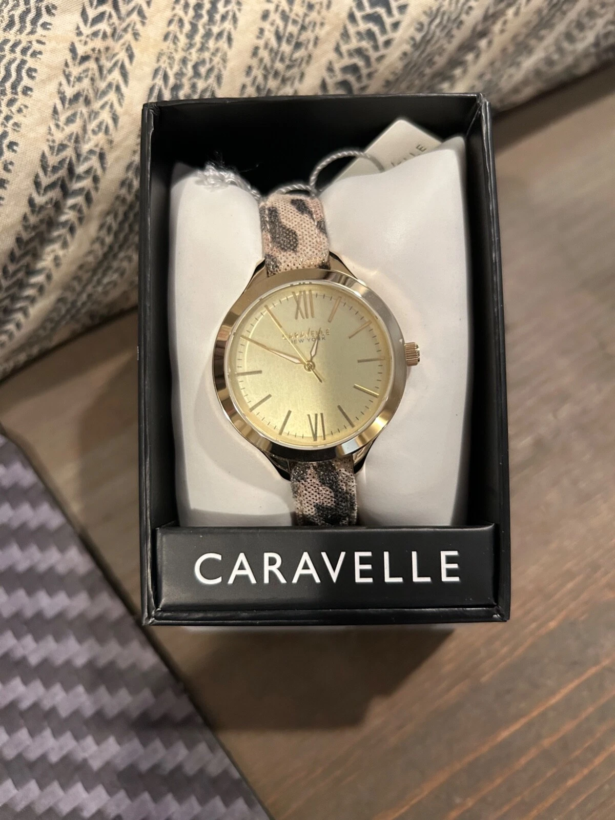 Caravelle New York Gold Bezel Watch with Leopard Band