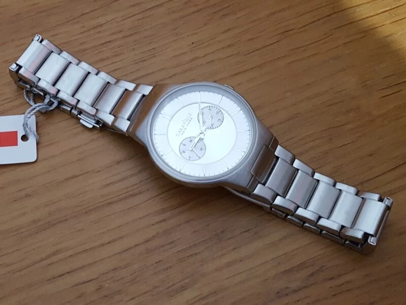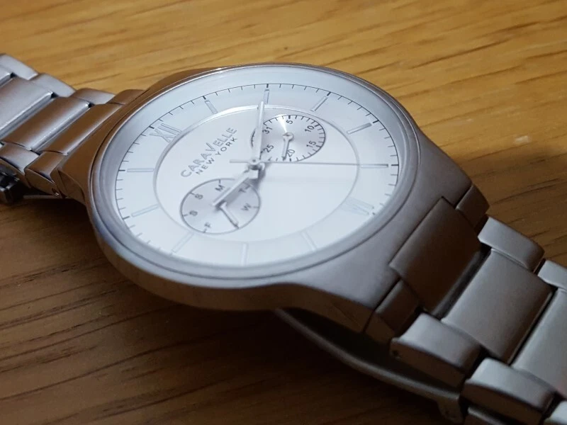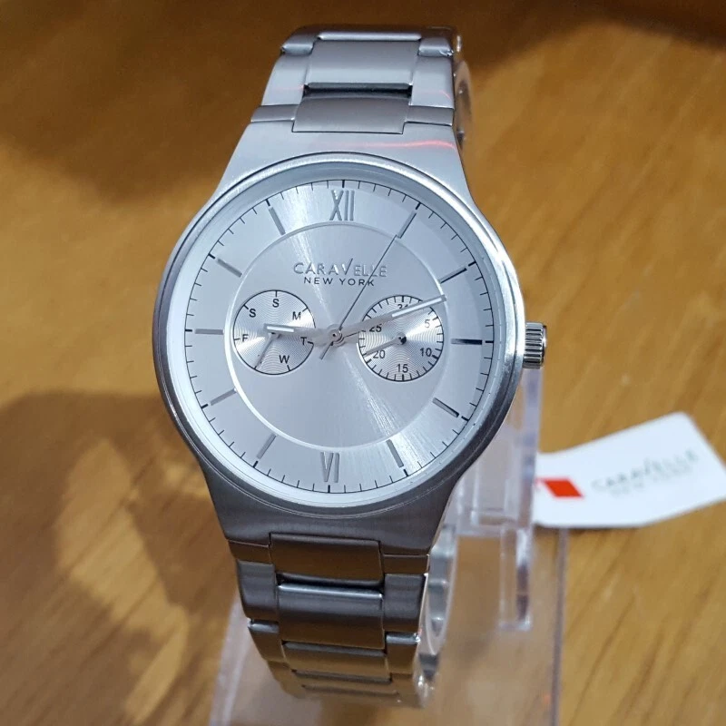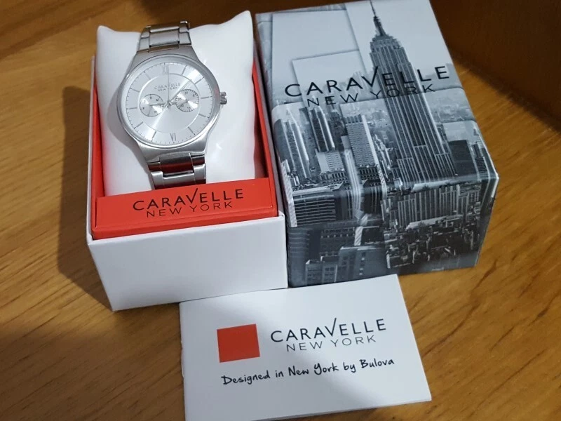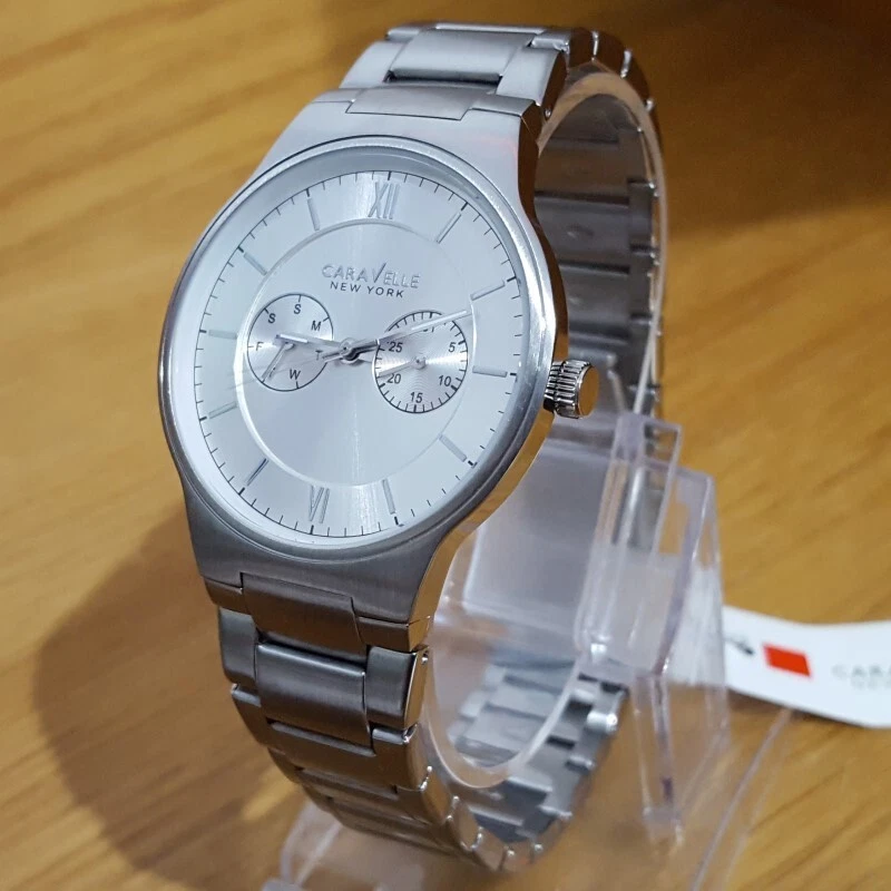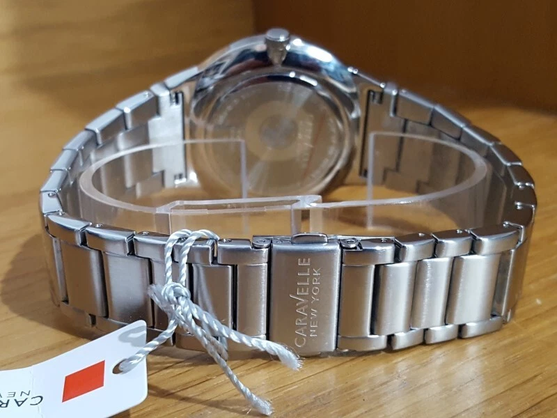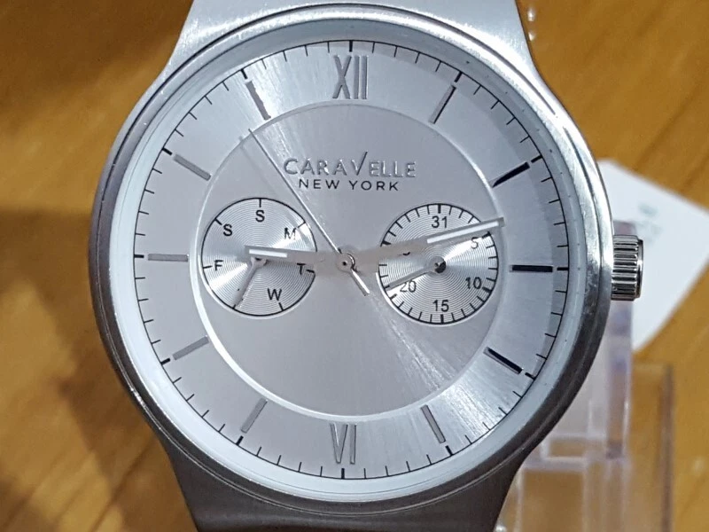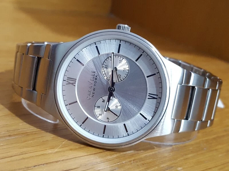 Mens Silver Bracelet Slim Bulova Caravelle Day Date Suit Watch 43A134 New In Box