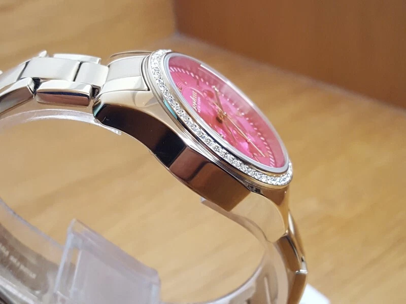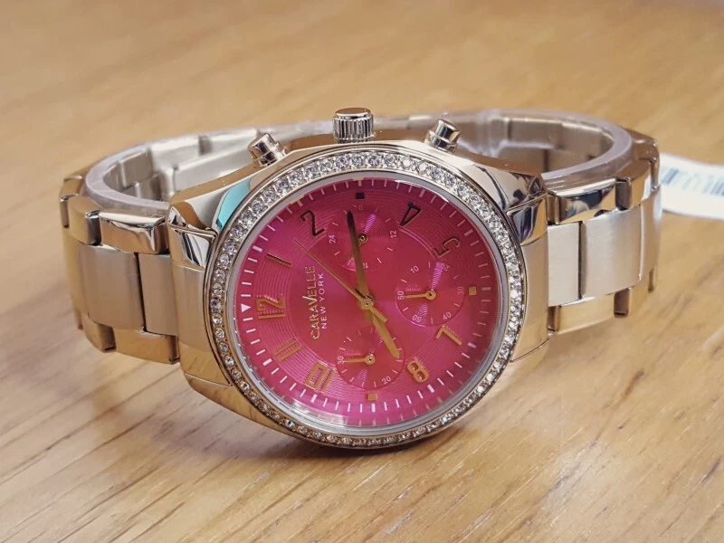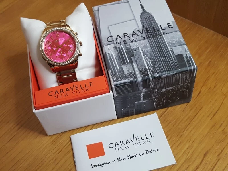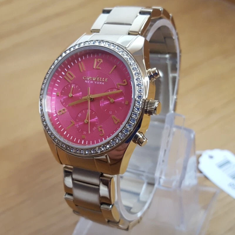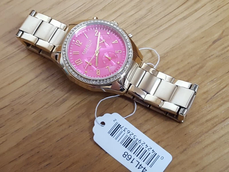 Ladies Gold Bulova Caravelle Melissa Pink Chrono Glitz Watch 44L168 New In Box