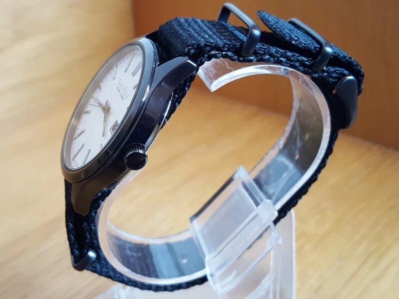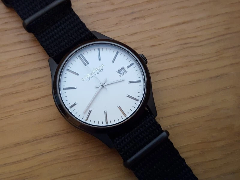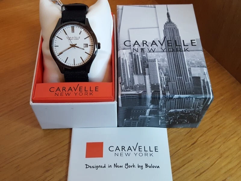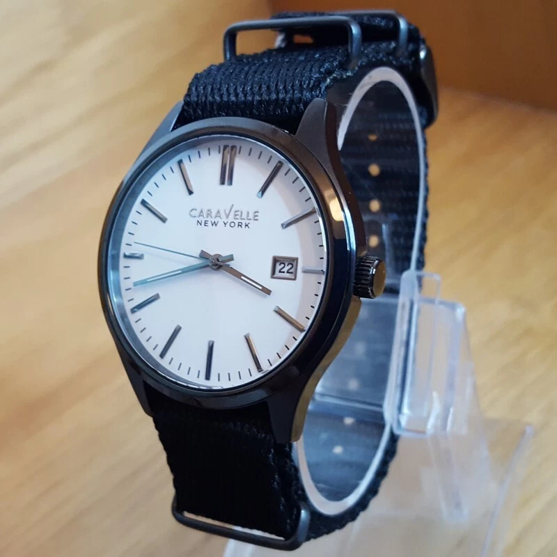 Mens Black Textile Strap Bulova Caravelle White Military Style Watch 45B142 NEW