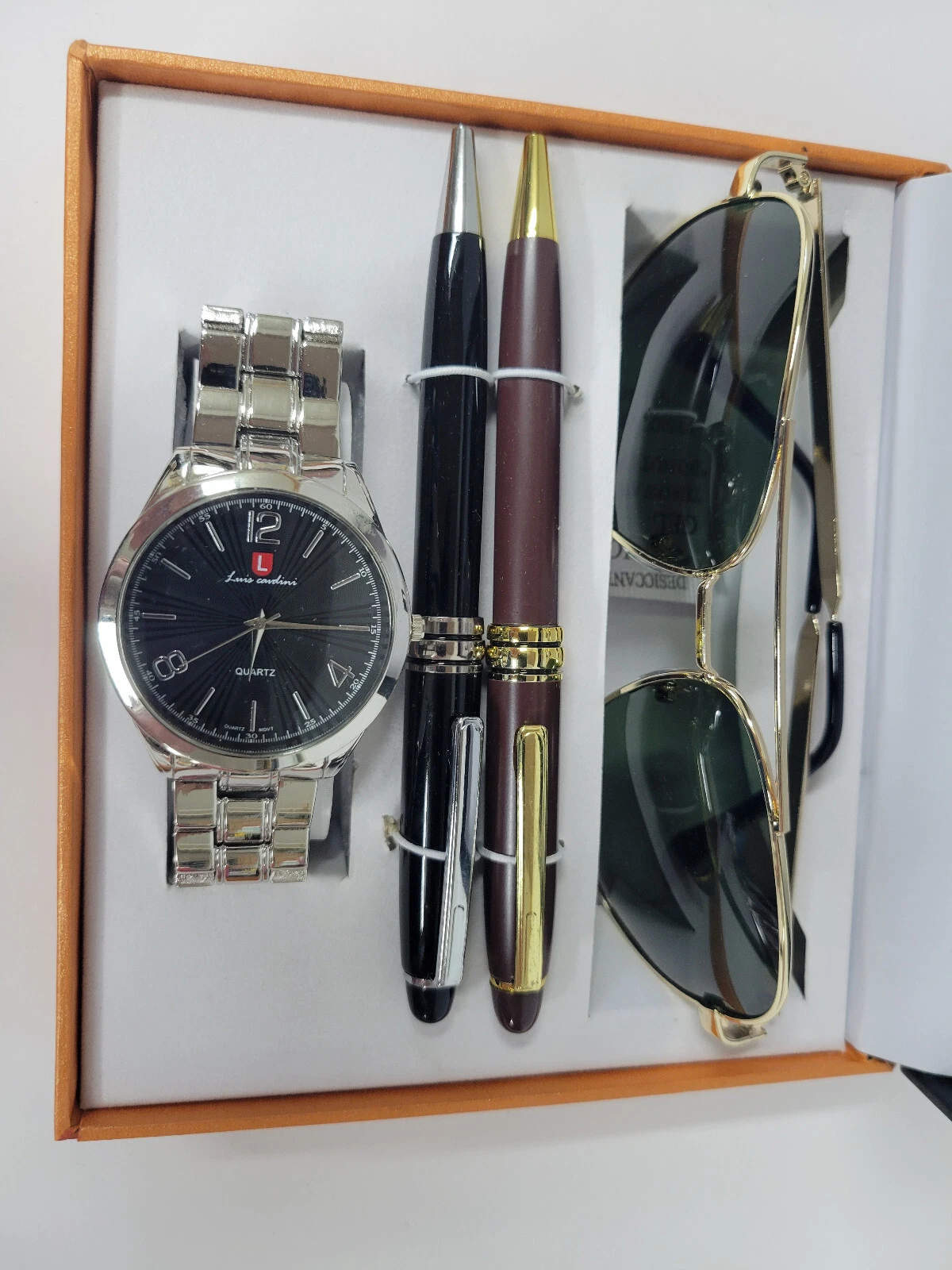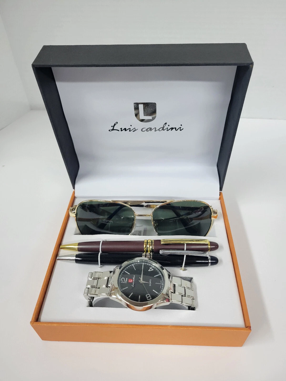 NEW Luis Cardini Stainless Steel Mens Quartz Watch w/2 pens and Sunglasses Set