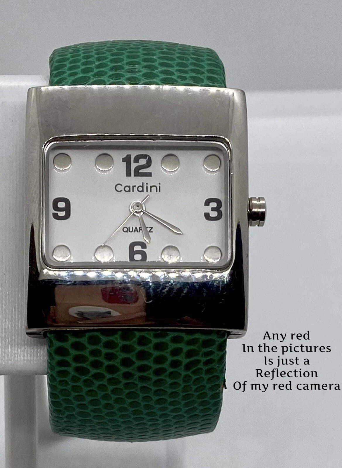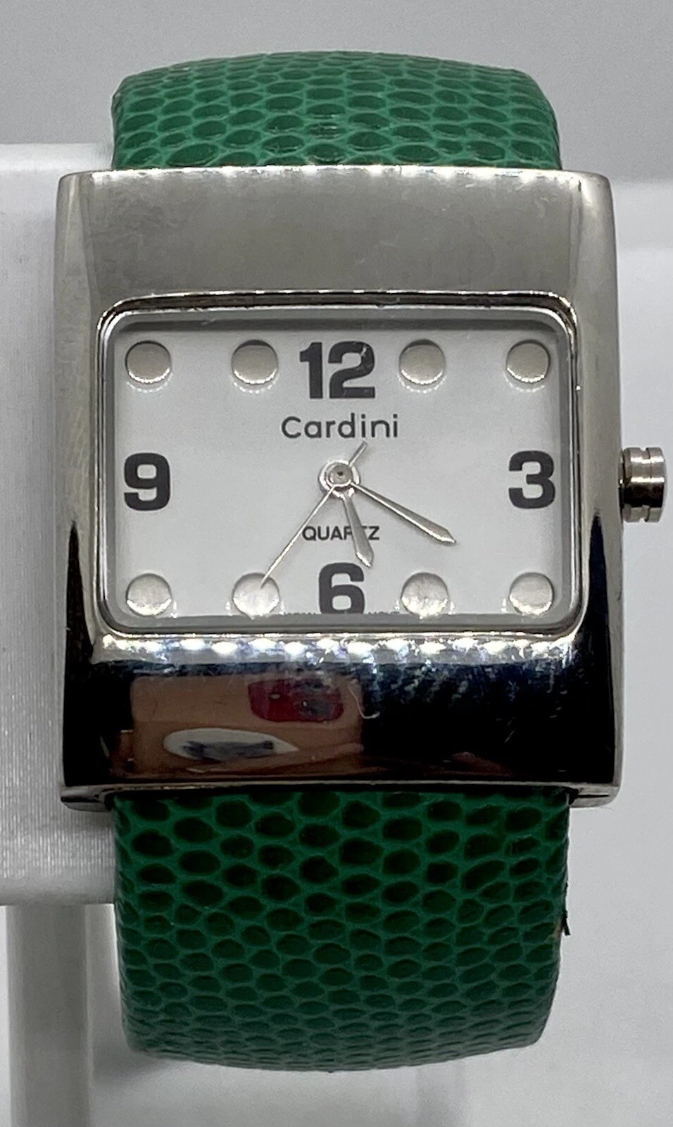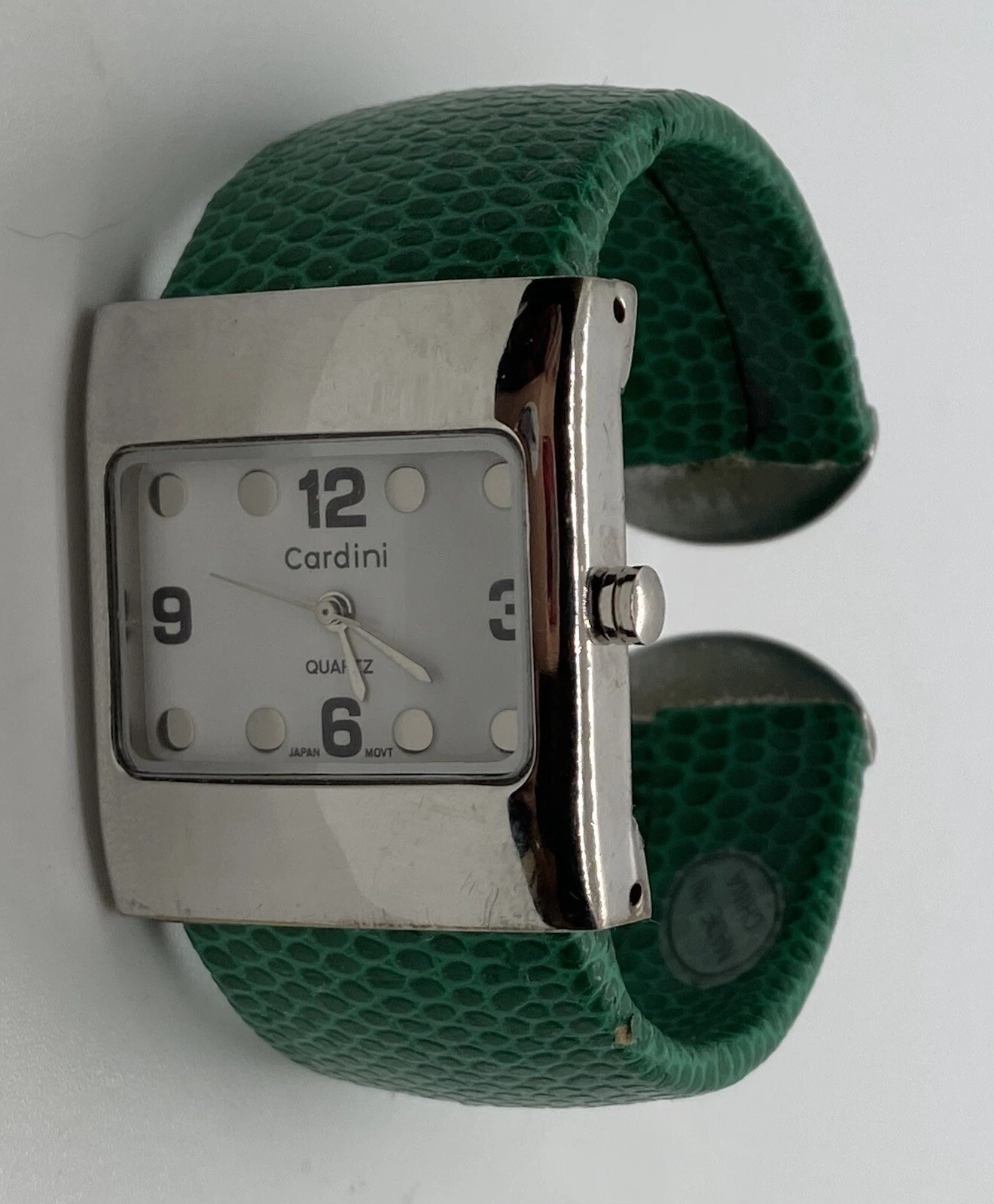 CARDINI Ladies Watch SILVER CASE EMBOSSED GREEN Wide Hinged Cuff Bangle 6” Wrist
