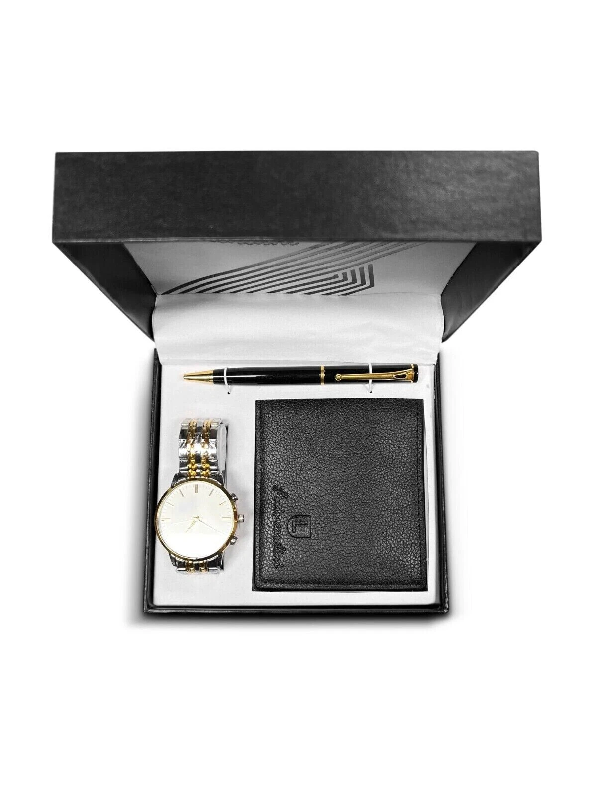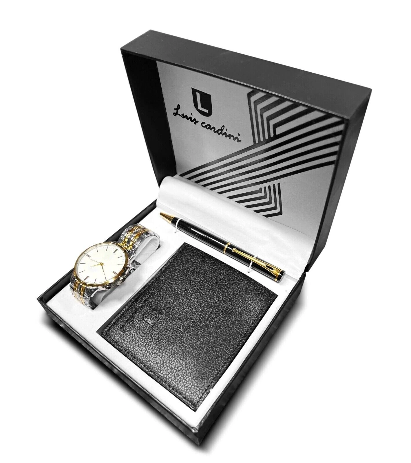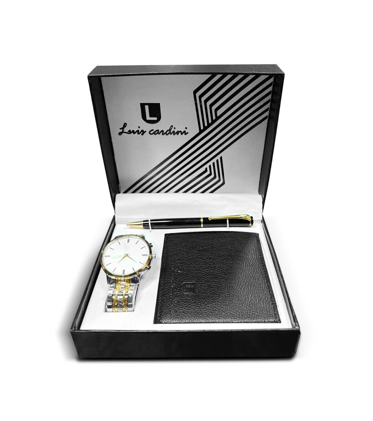 Luis Cardini 15218 Stainless Steel Mens Quartz Watch with Pen & Wallet (Silver)
