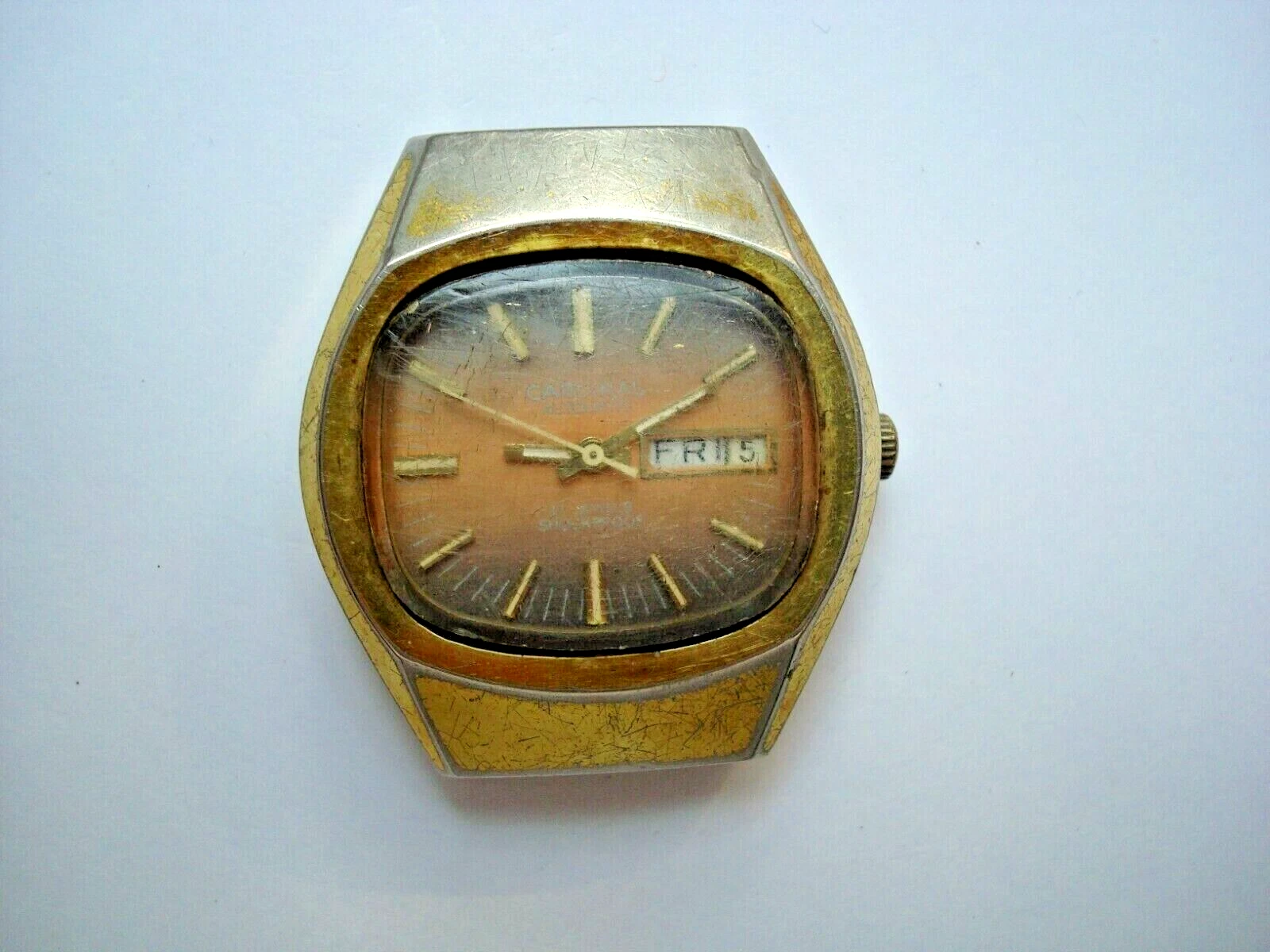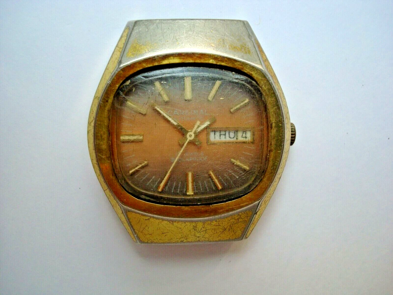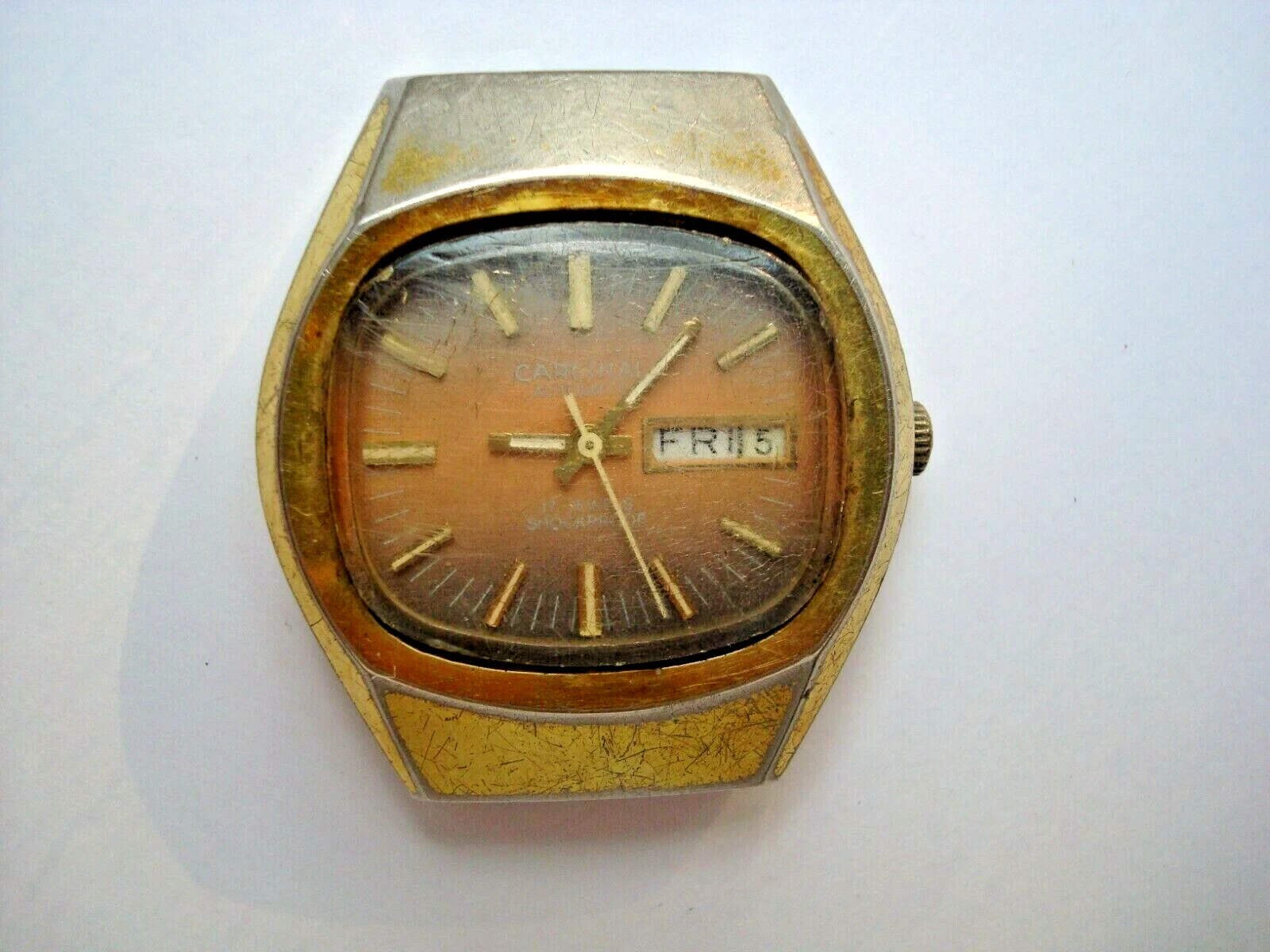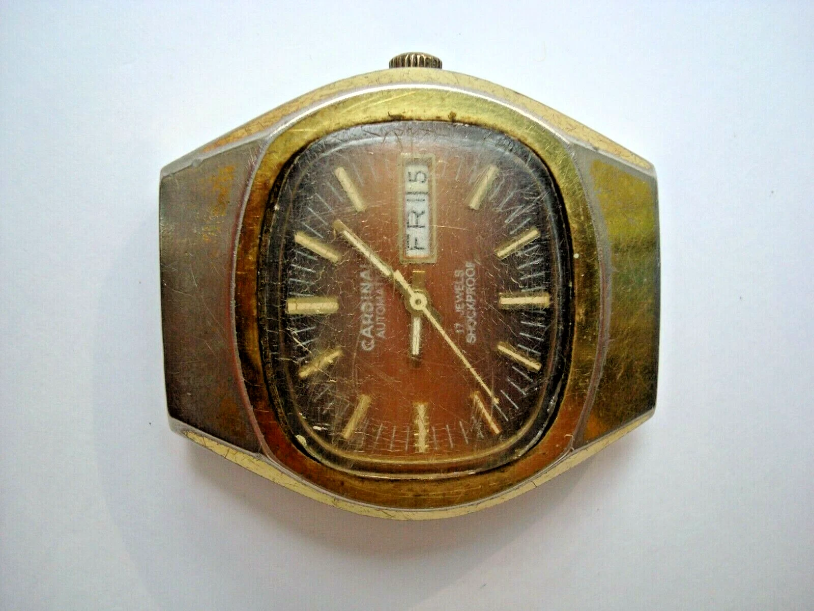 CARDINAL MENS AUTOMATIC WATCH TV Shape 17Jewels DAY DATE 2 tone Brown Dial RUNS