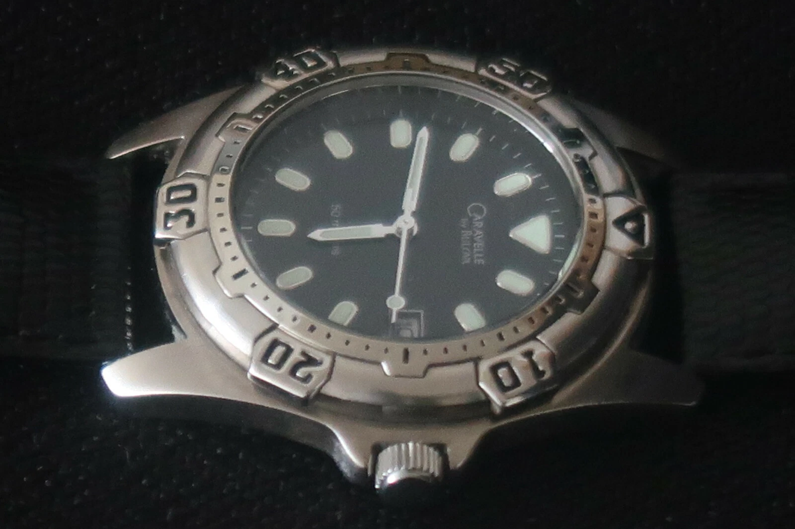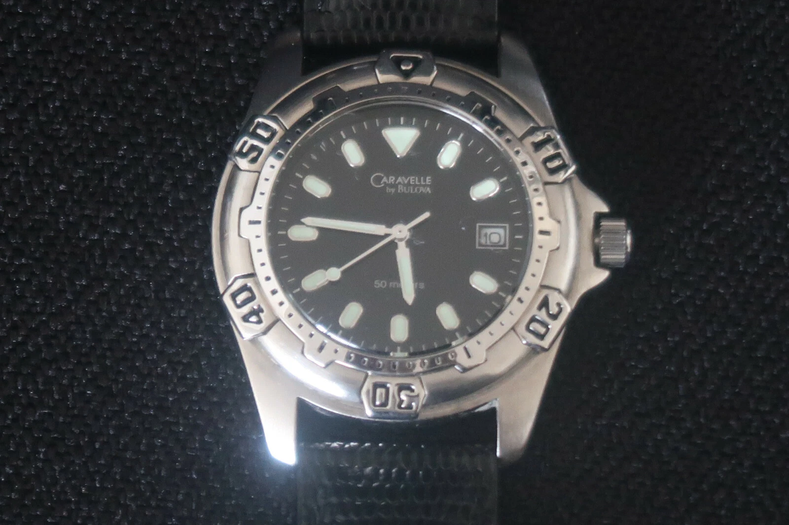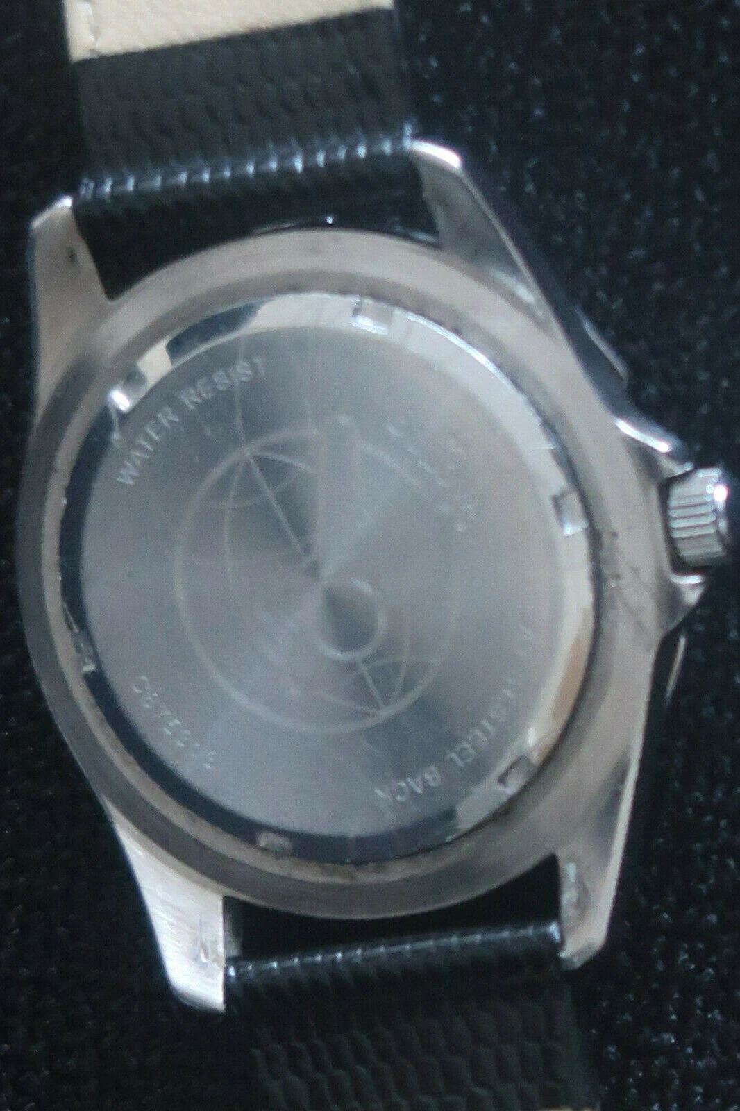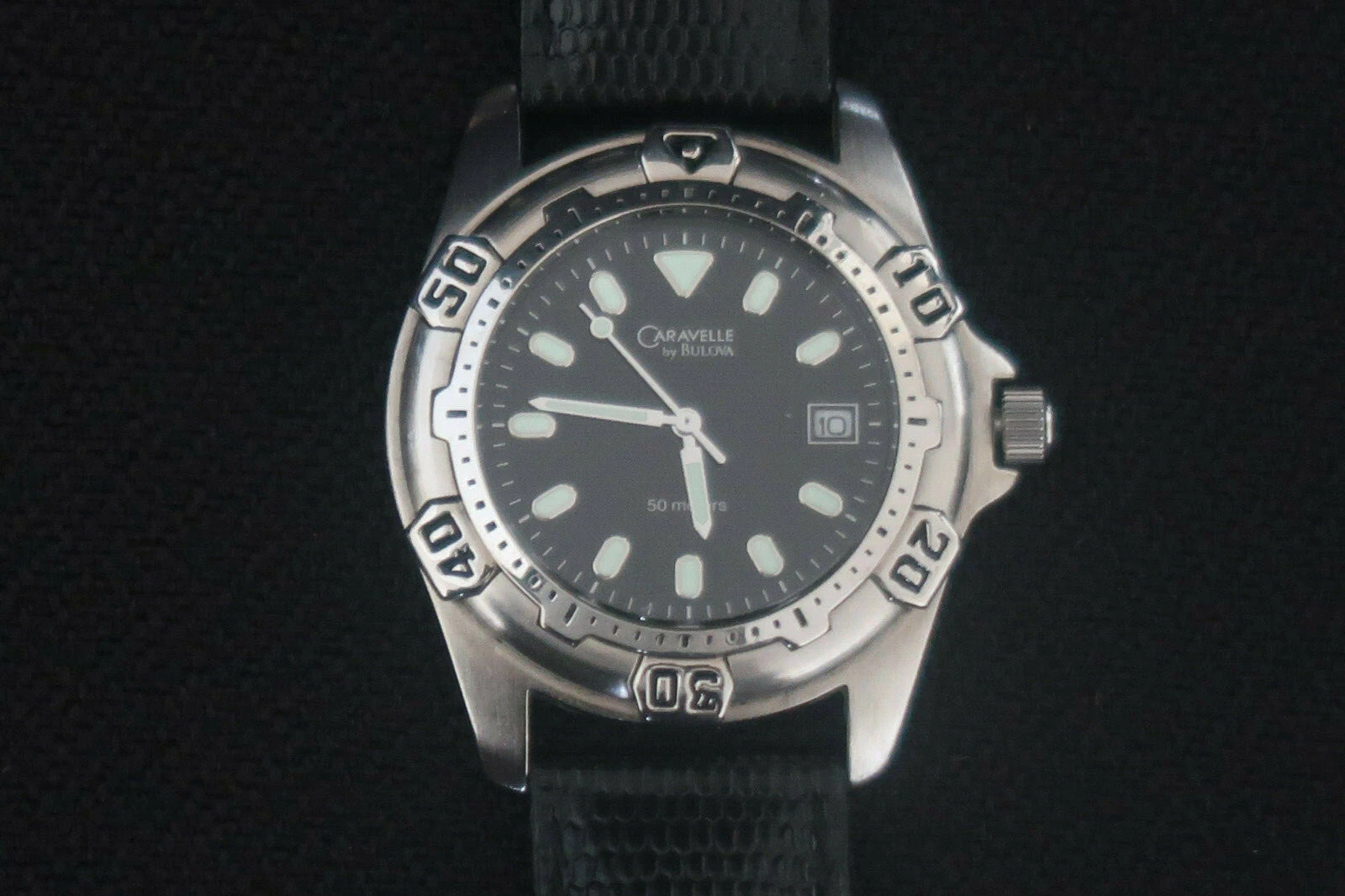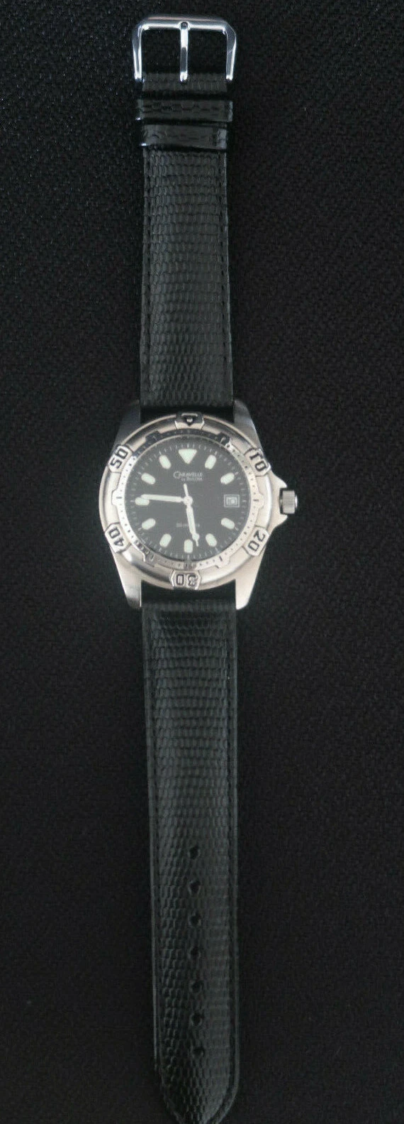 CARAVELLE BULOVA WATCH MENS QUARTZ CHROME WITH BLACK DIAL & BLACK LEATHER STRAP
