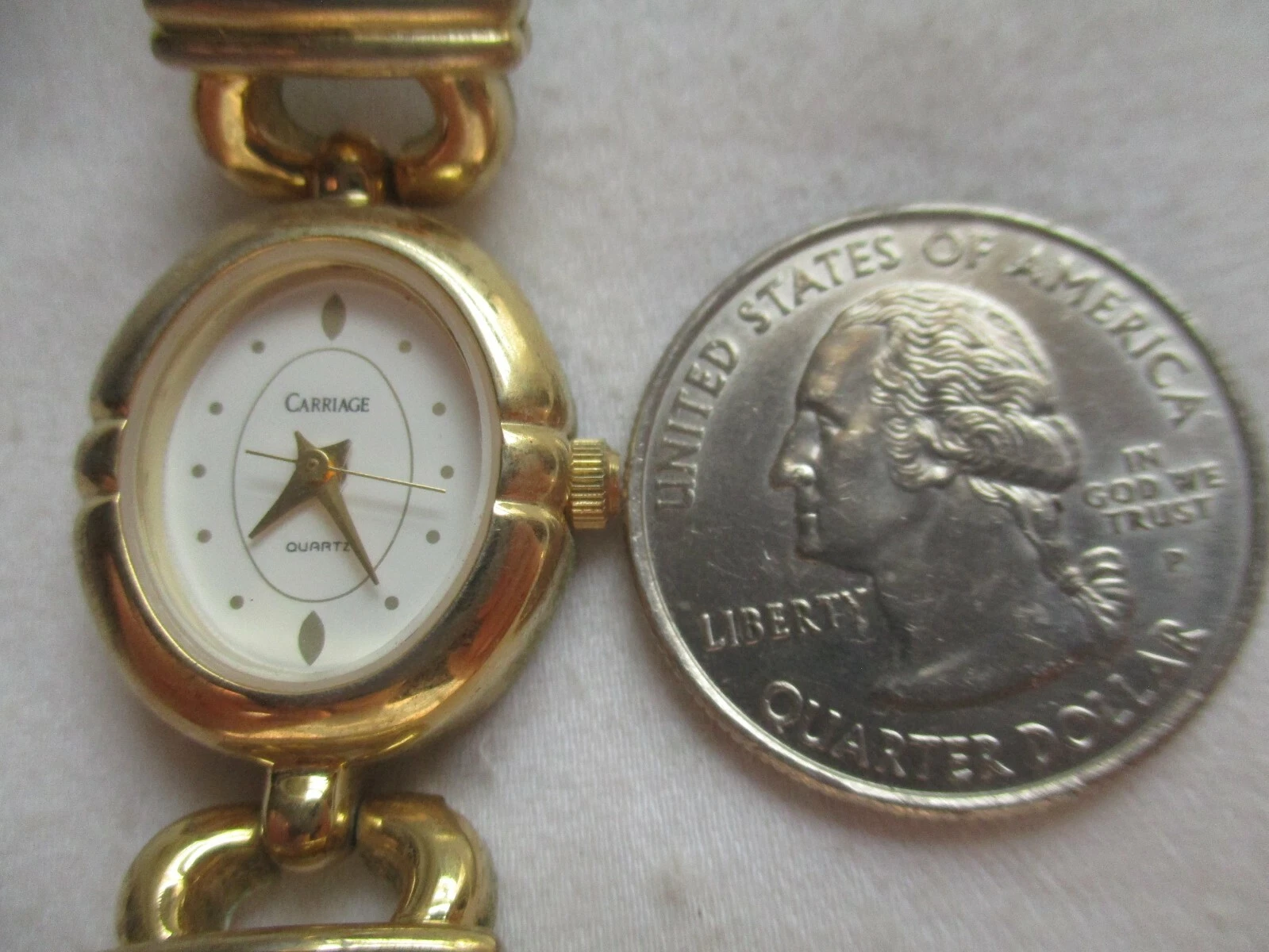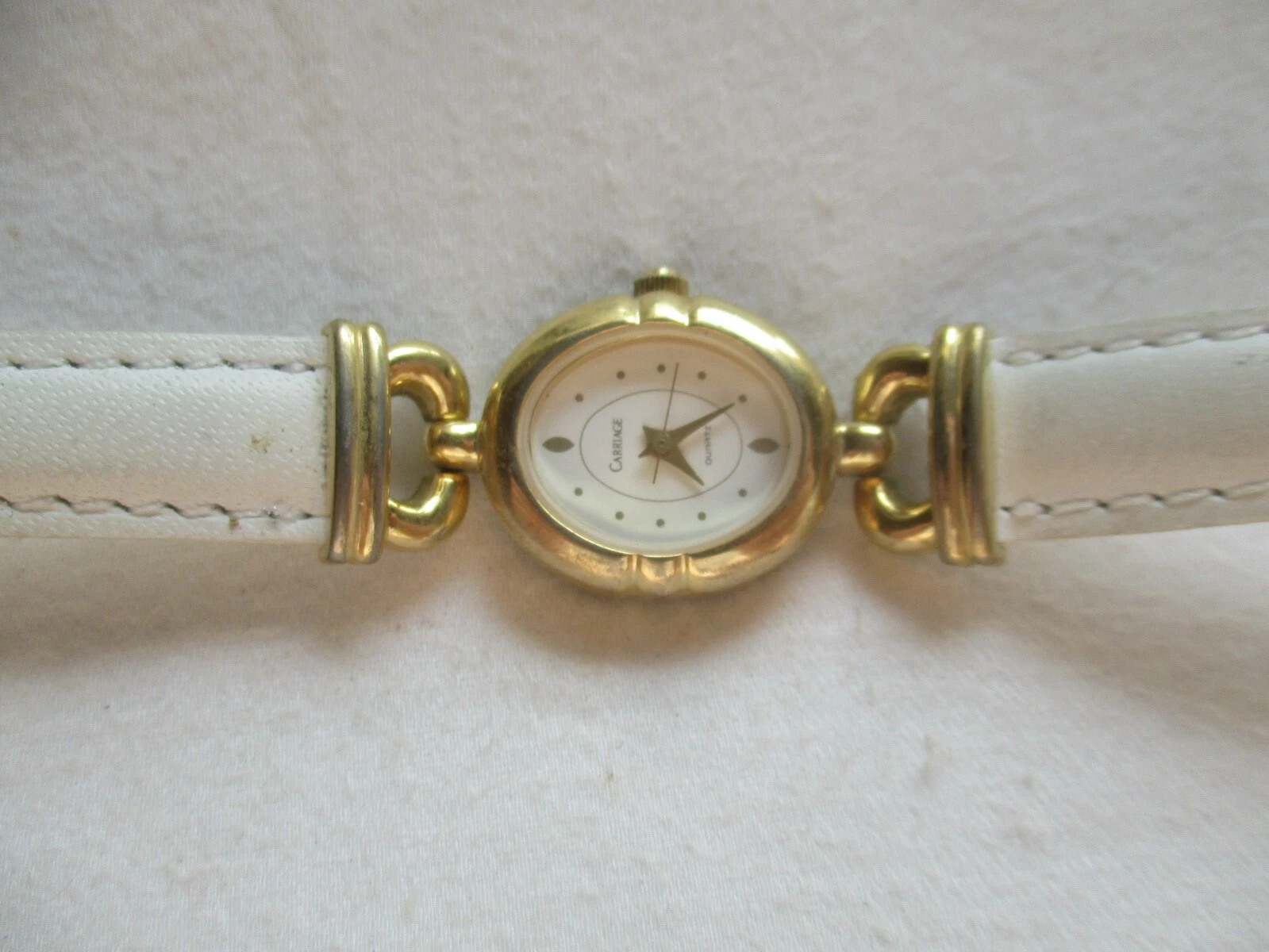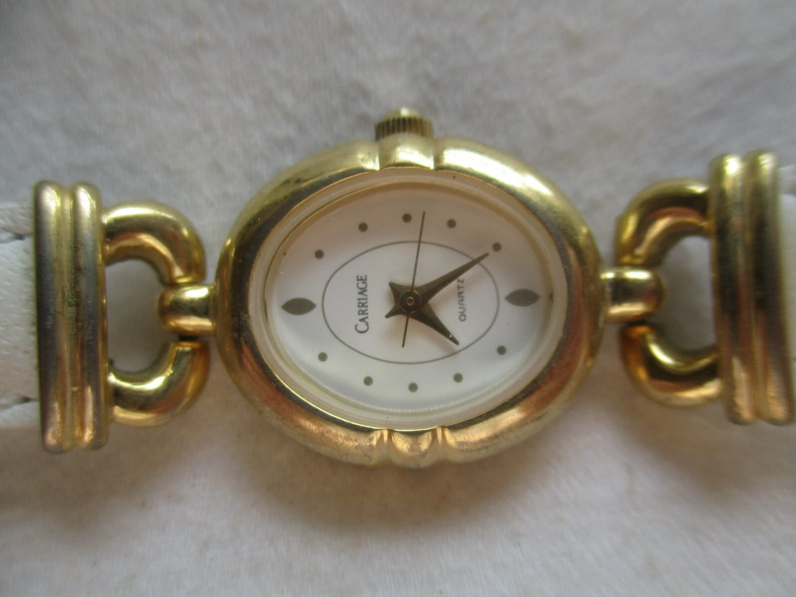 Carriage Analog Wristwatch White Buckle Band Oval Shaped Face Gold Tone