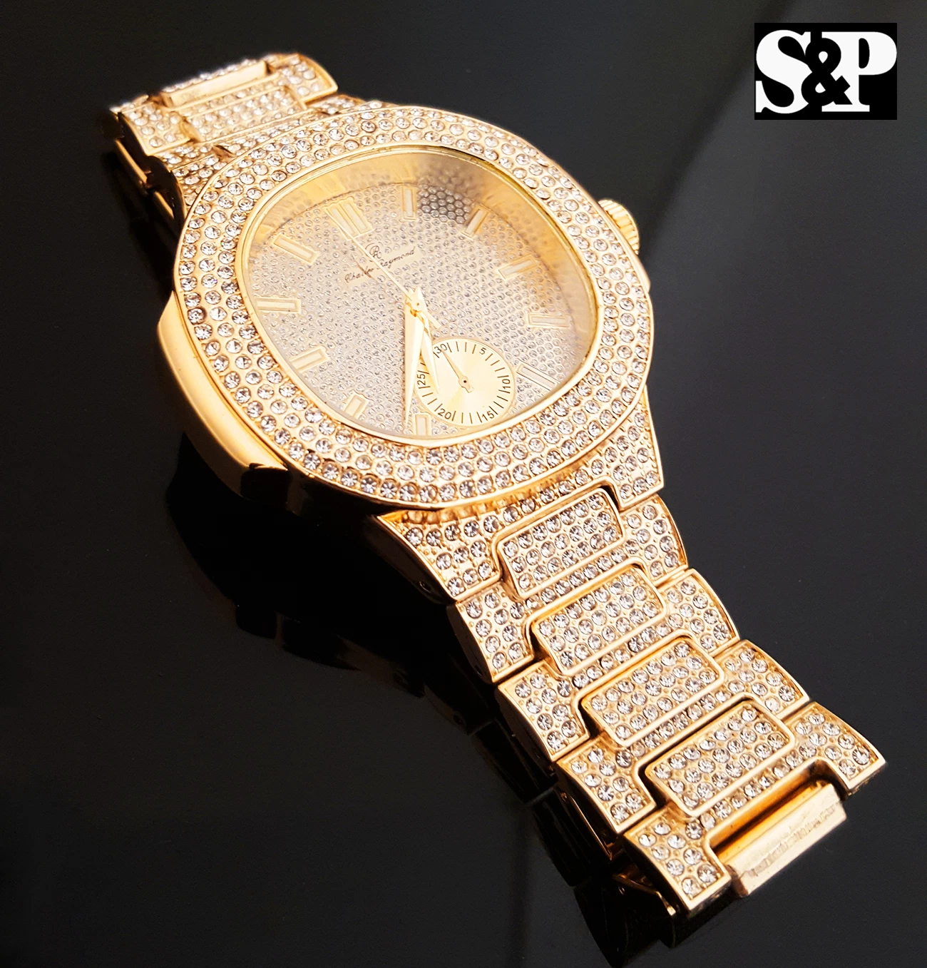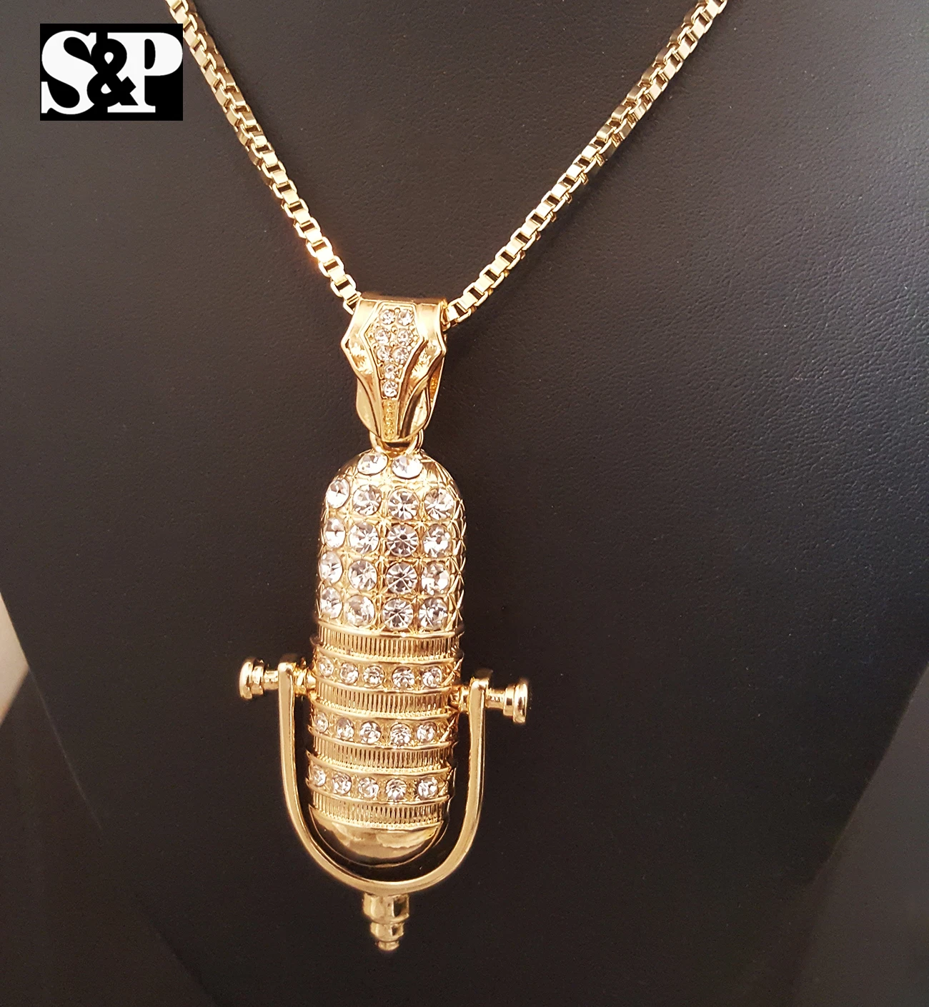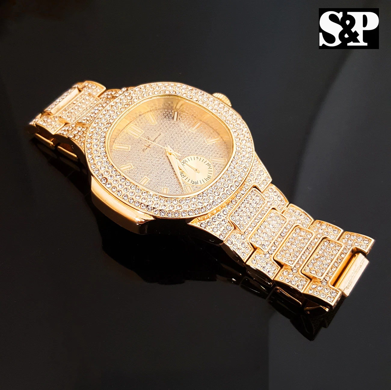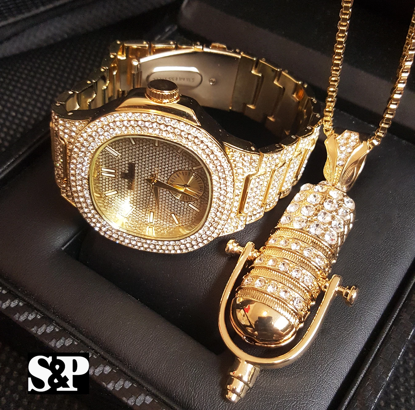 MEN ICED HIP HOP GOLD PT QUAVO WATCH & MIC MICROPHONE NECKLACE BLING COMBO SET