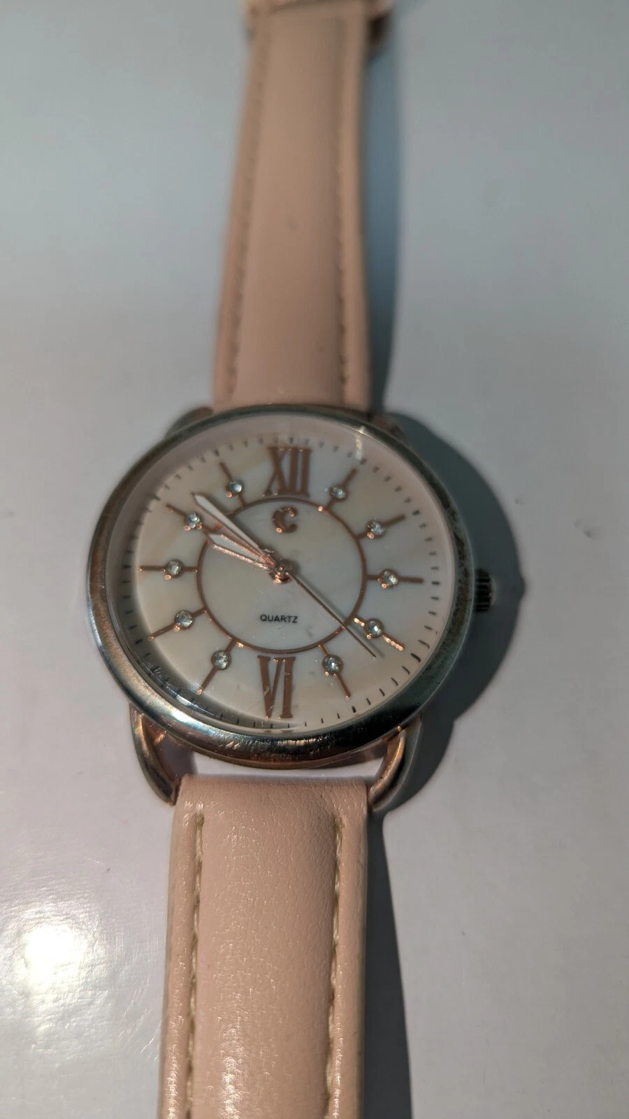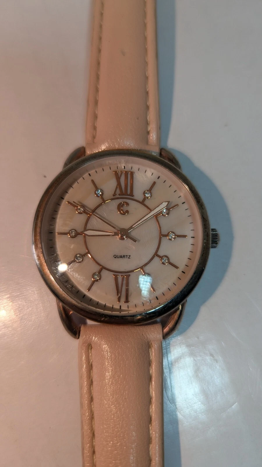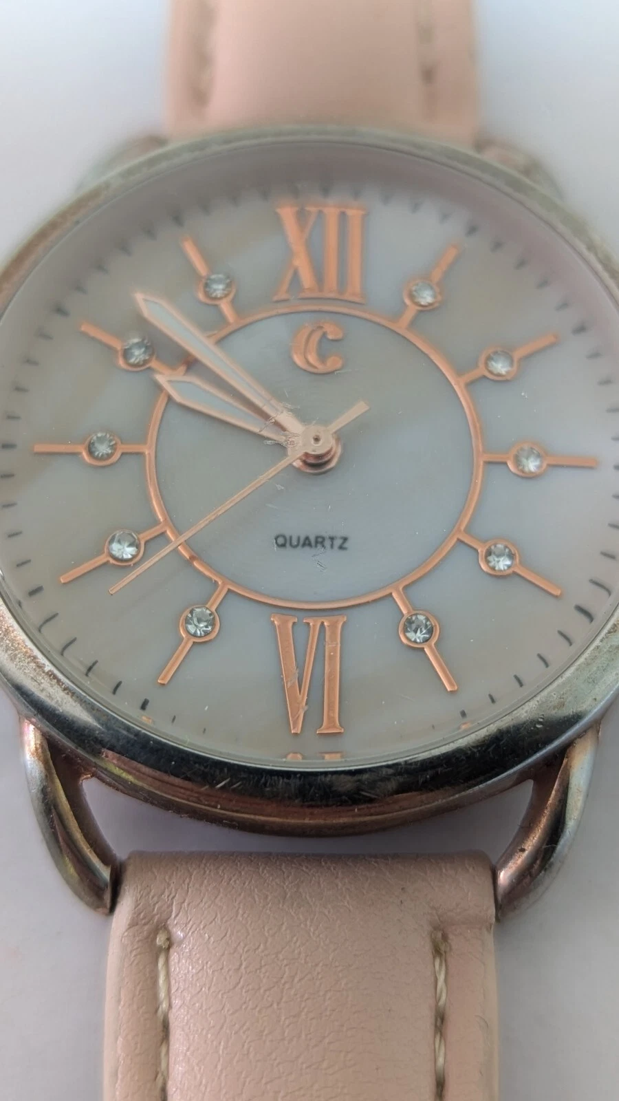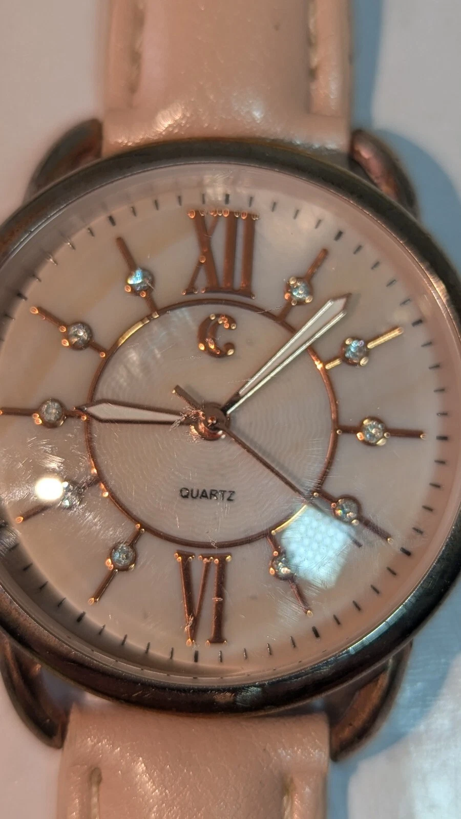 Charming Charlie Gold Tone Pearl Dial Pink Band Women’s Quartz Watch New Battery