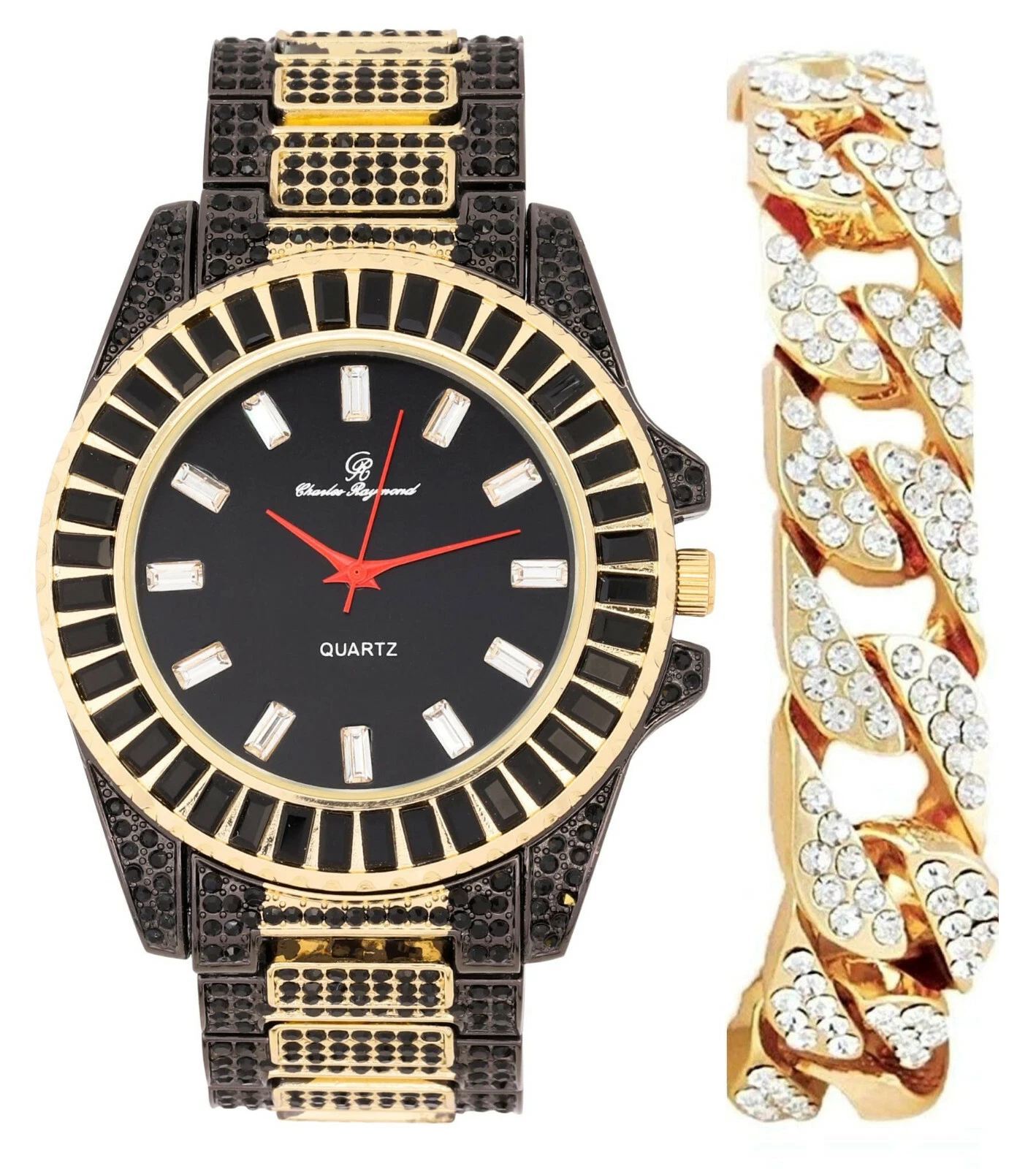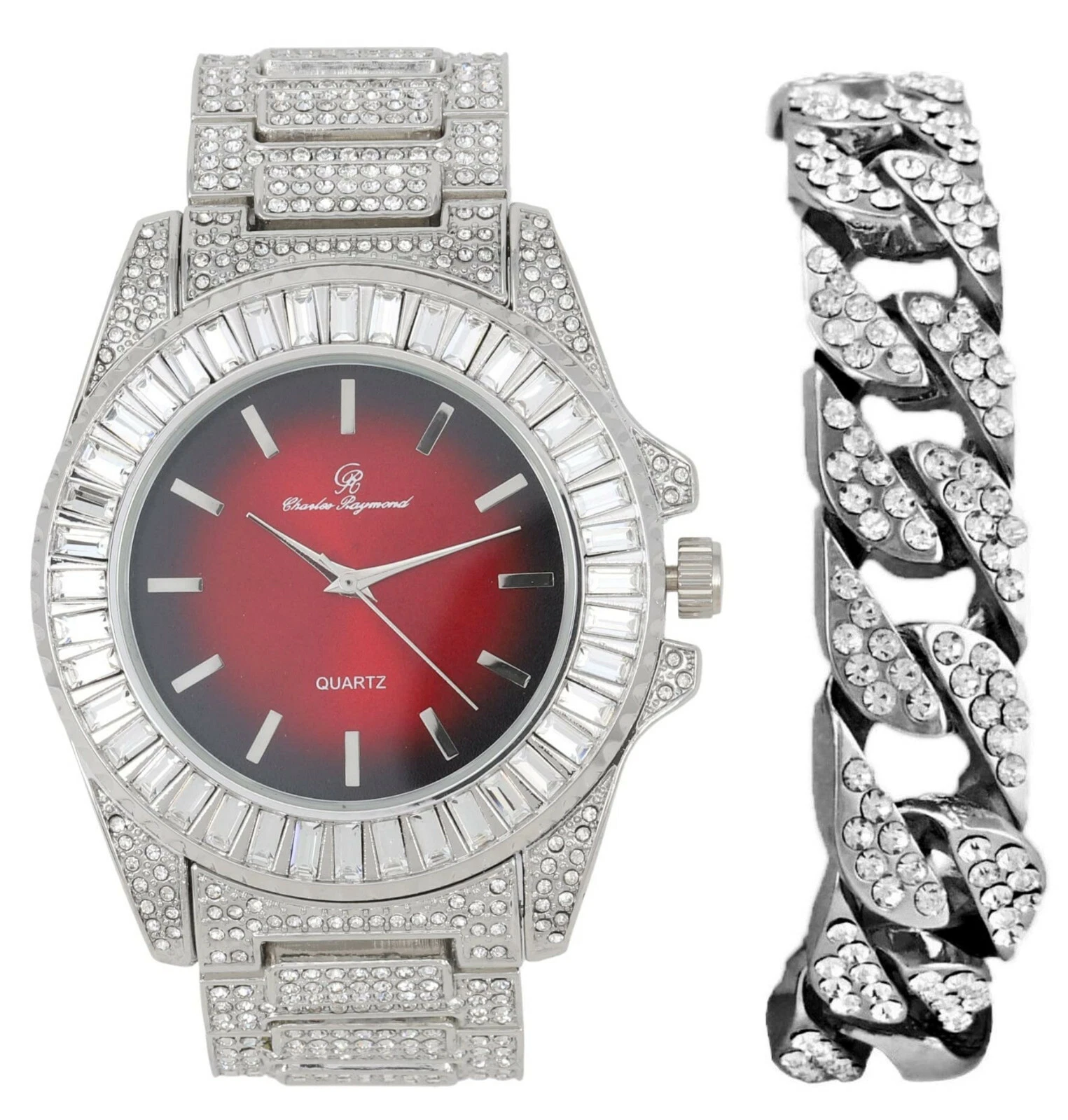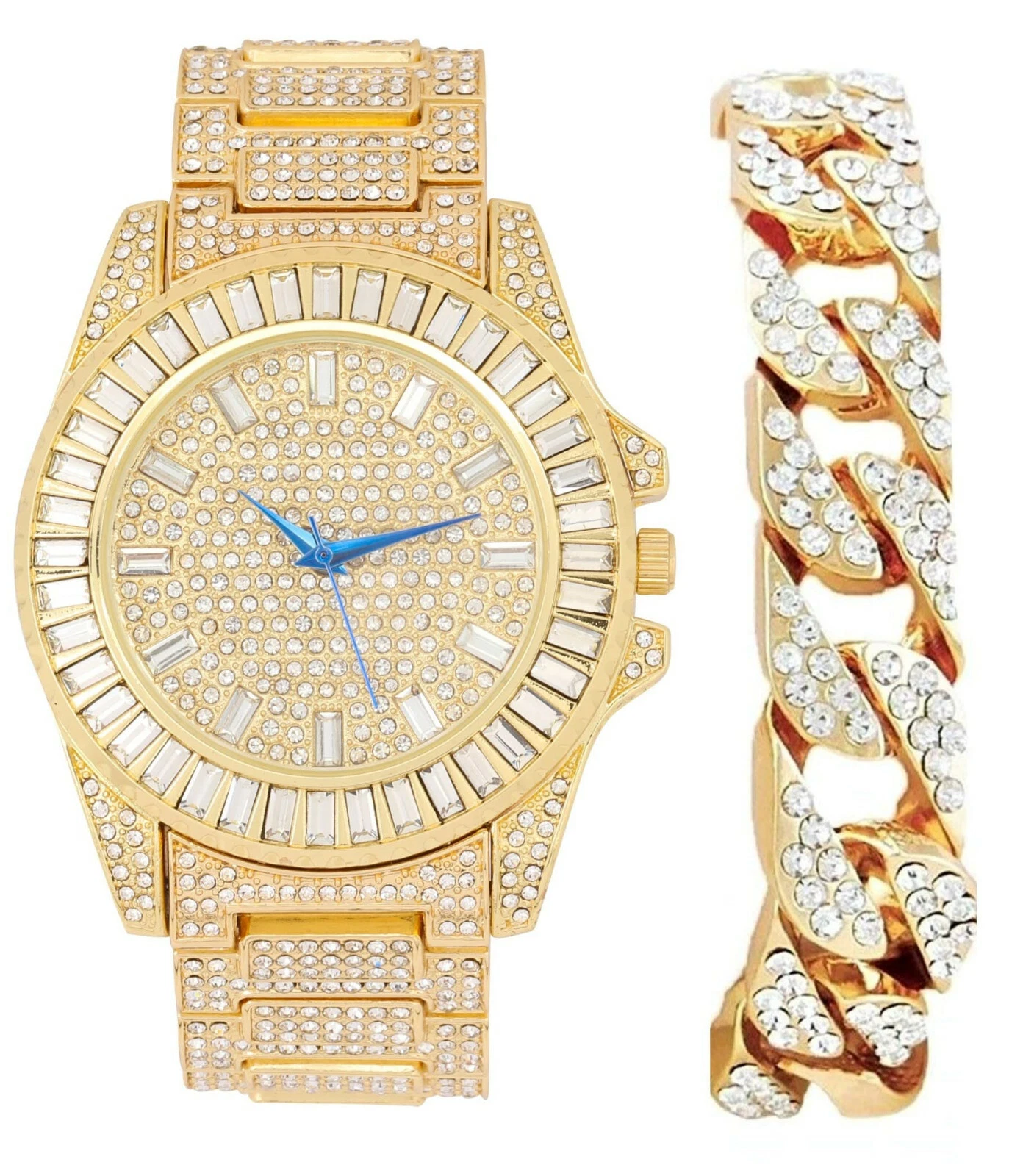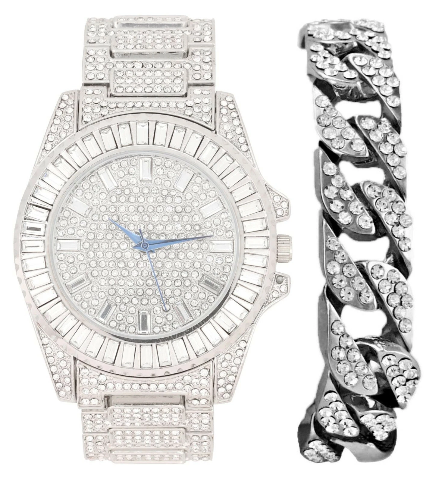 Baguette Cut Diamond Crystal Blinged Mens Watch and Cuban Bracelet - ST10372C