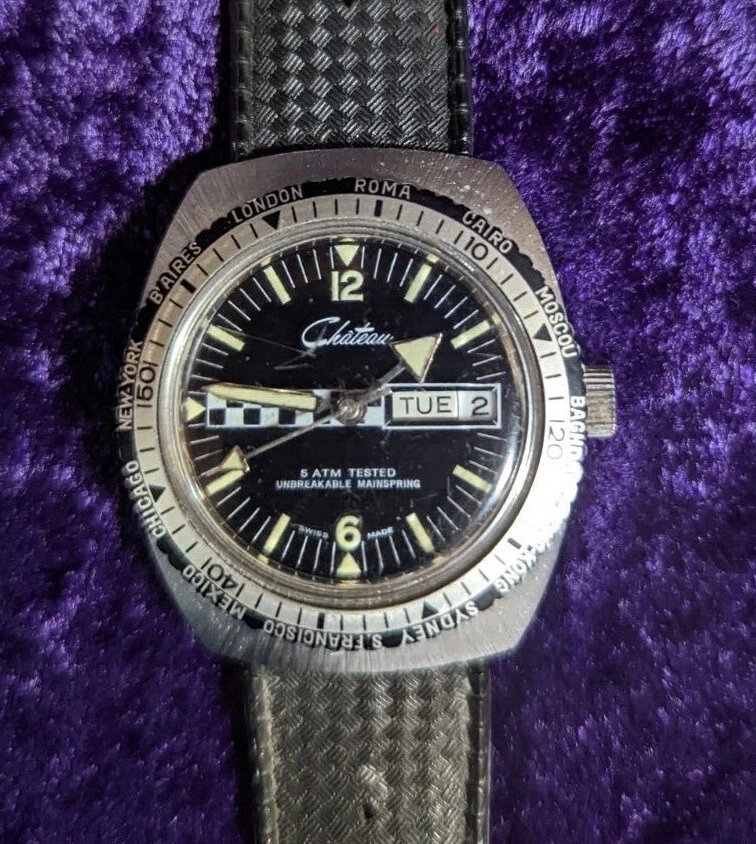 Vintage 1960s Chateau Calendar World Time Race Dive Watch 5 Atm Diver Day Date
