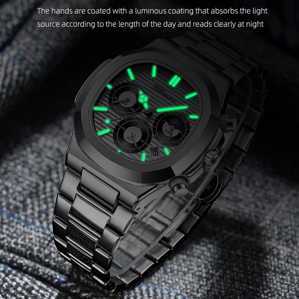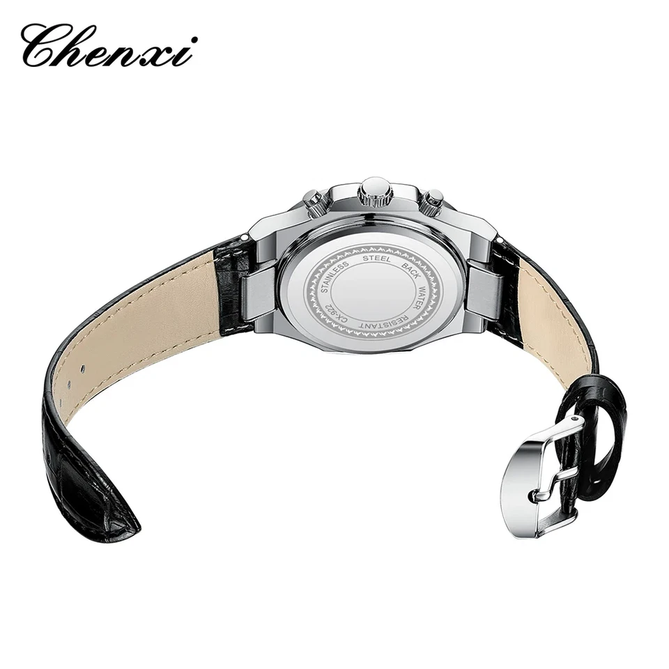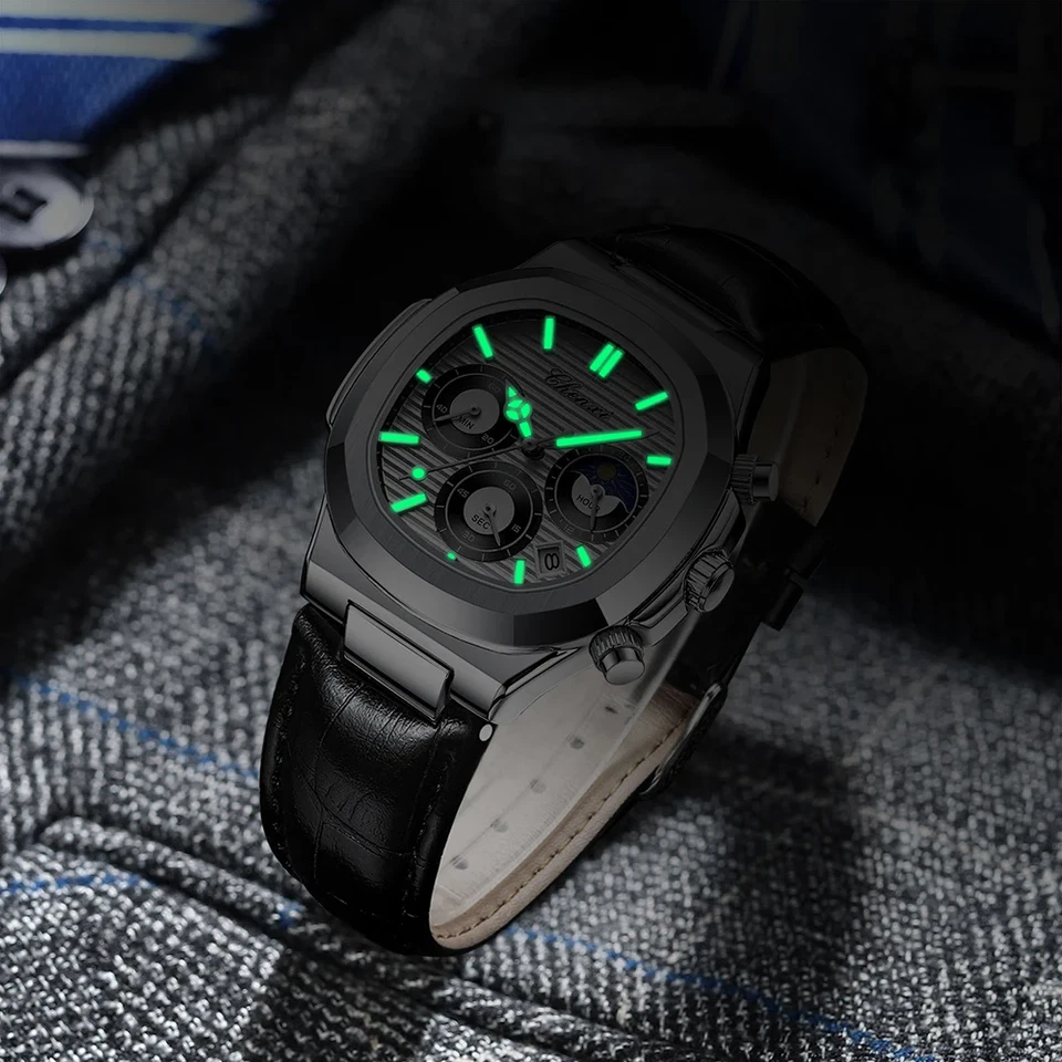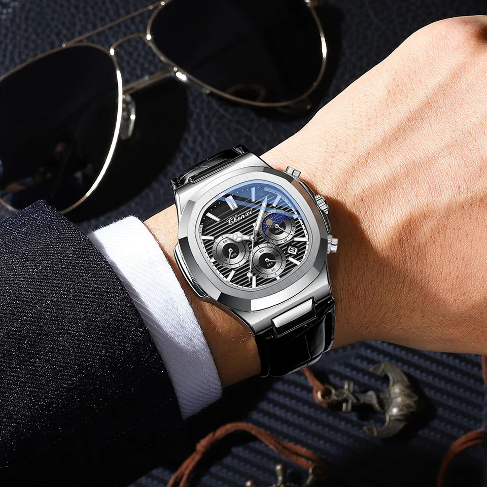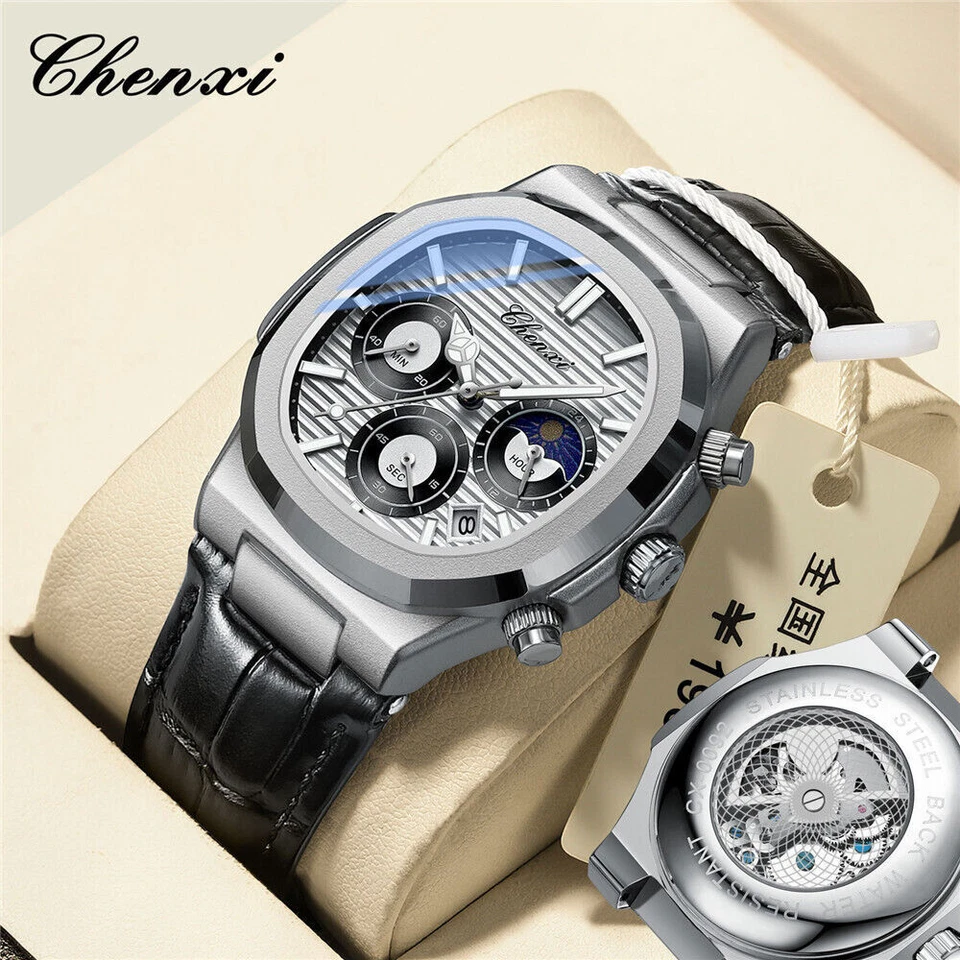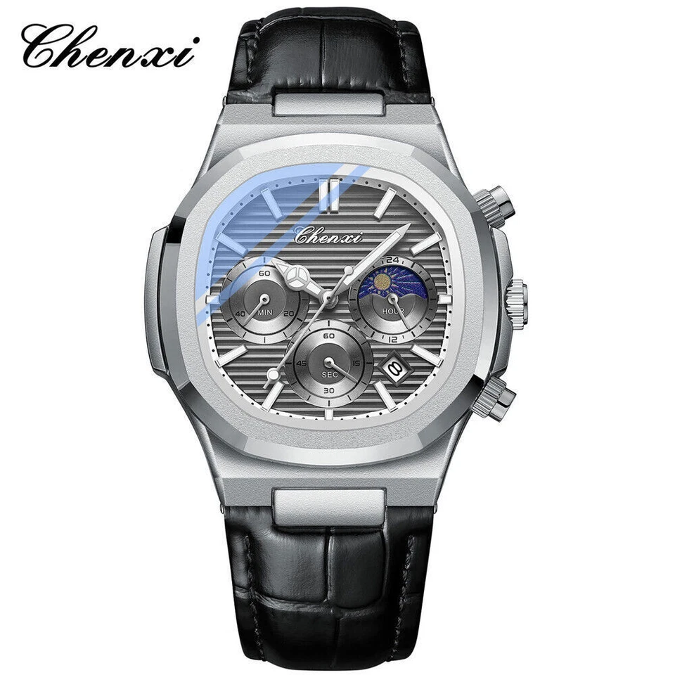 CHENXI Men Watch Moon Phase Chronograph Quartz Luminous Male Leather Wristwatch