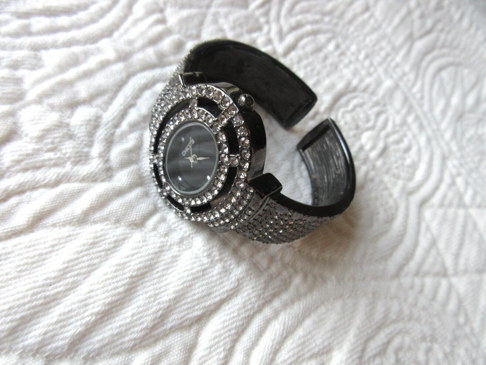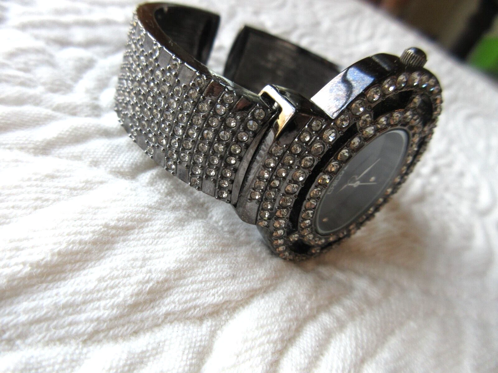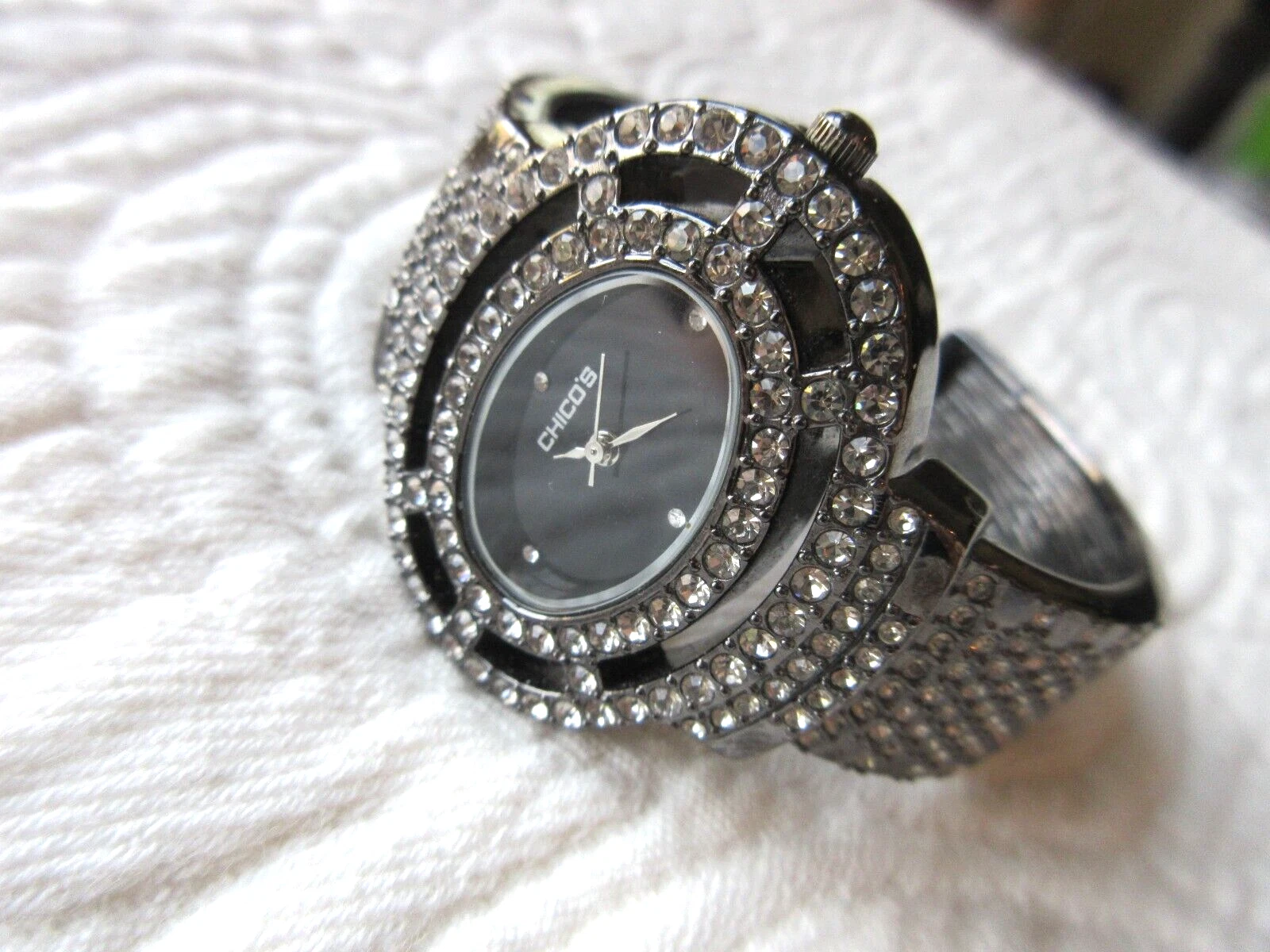 CHICO'S VTG BLACK OVAL CRYSTAL WATCH JAPAN MOVEMENT FLEXIBLE CUFF STAINLESS BACK