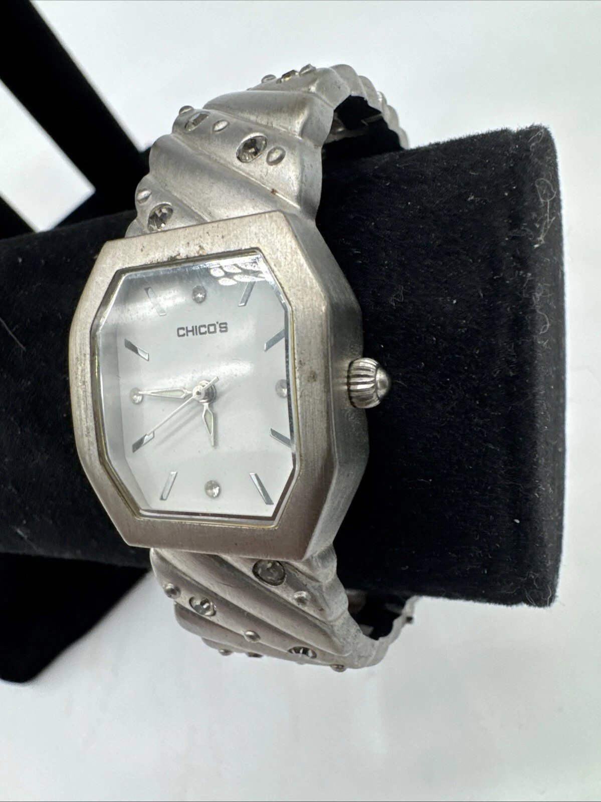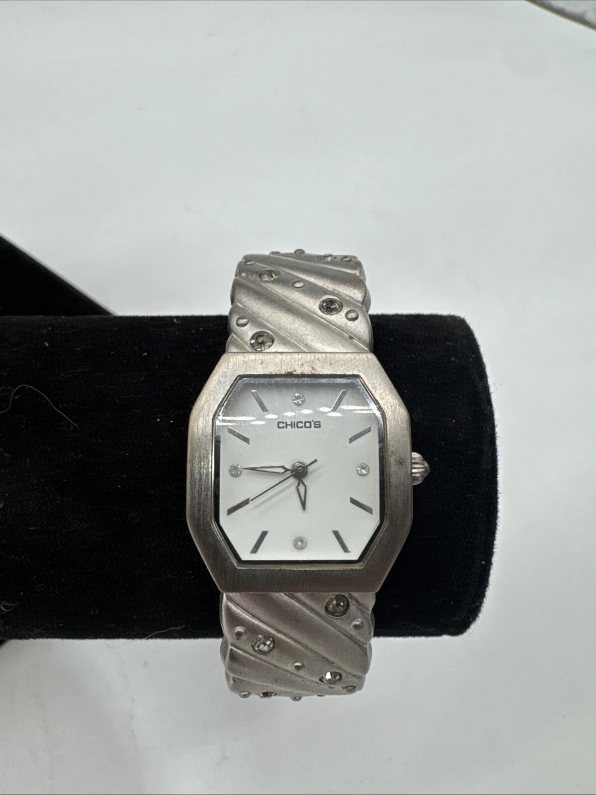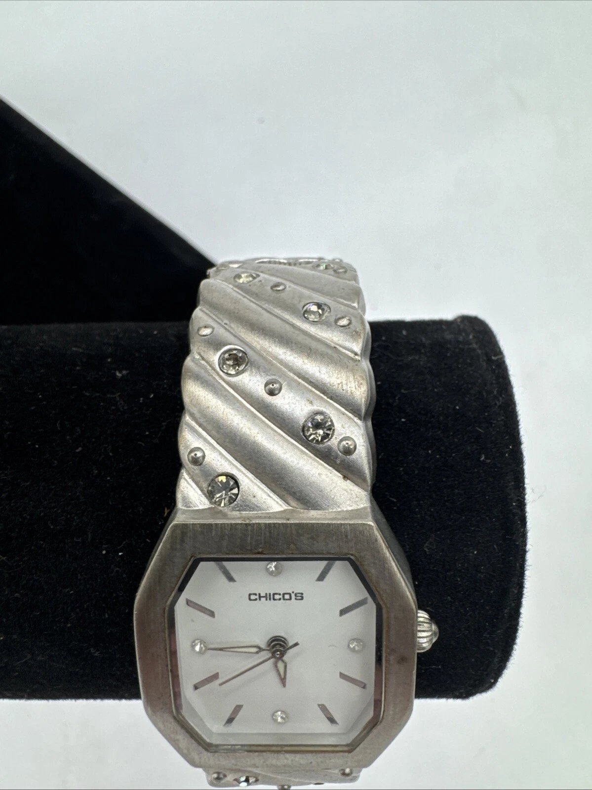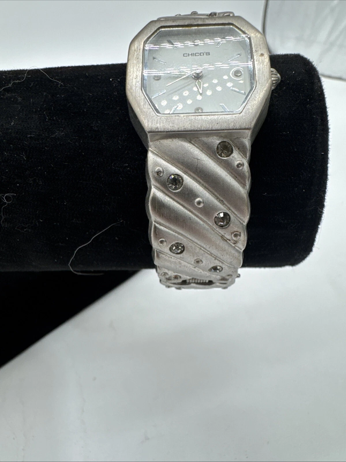 Chico's Silver Tone Rhinestone Hinged Cuff Watch New Battery