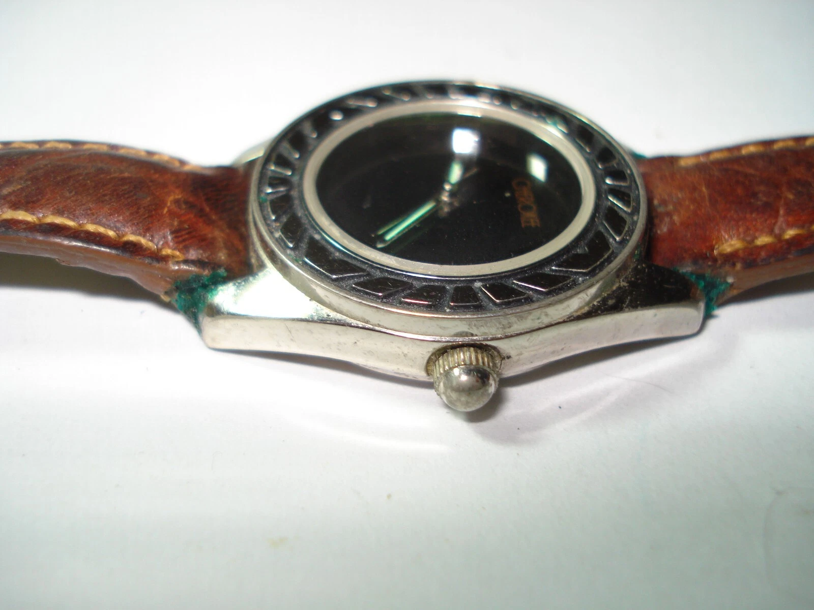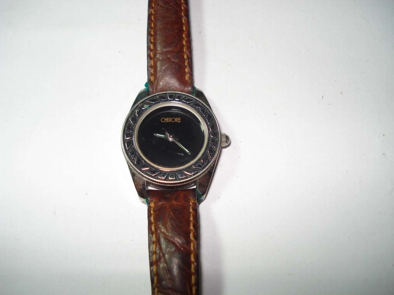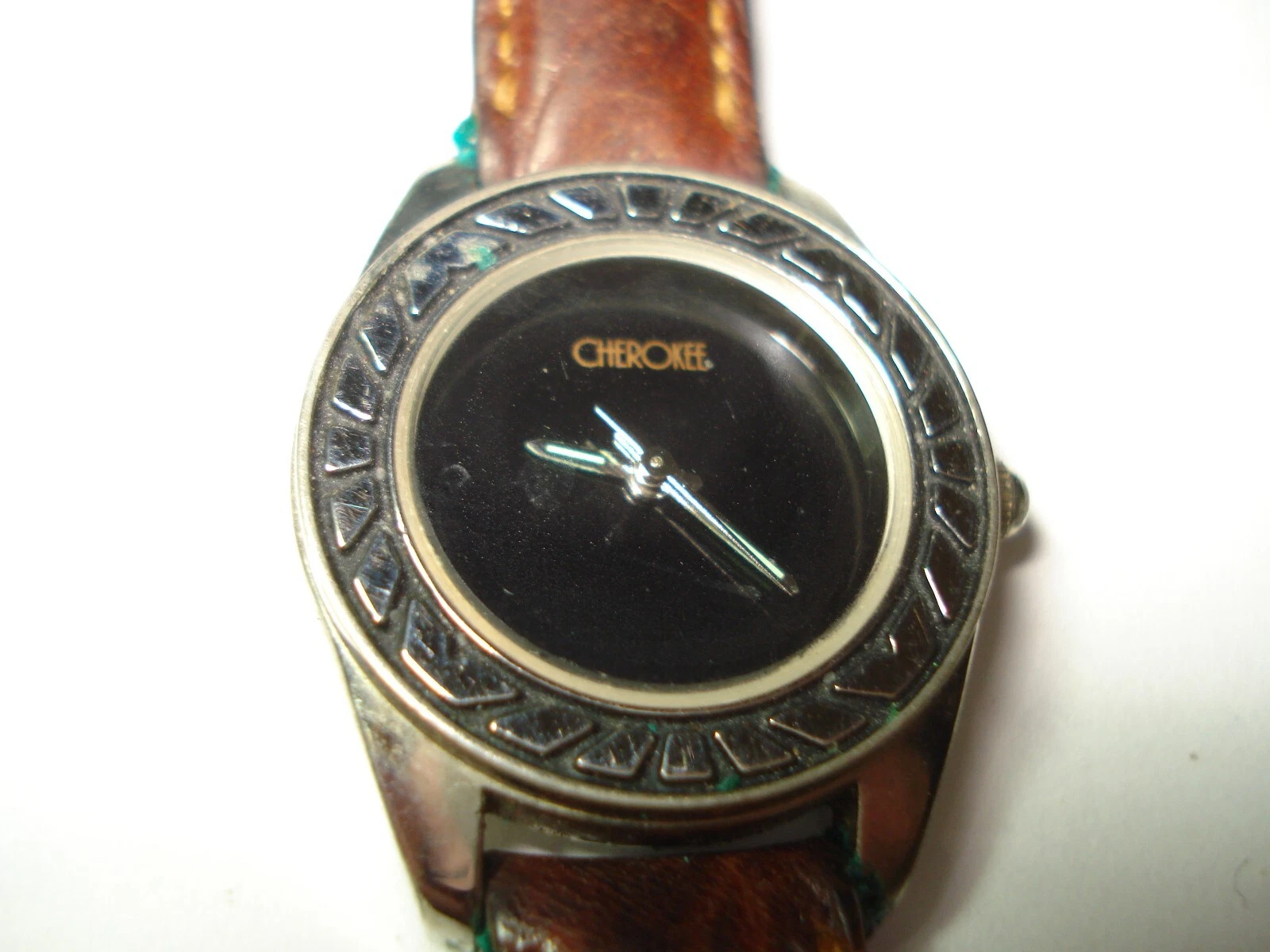 RARE VINTAGE CHEROKEE ART DECO DESIGN SILVER WATCH NEW BATTERY LEATHER BAND