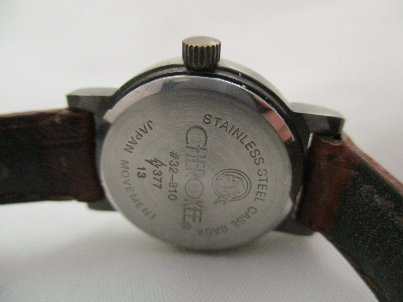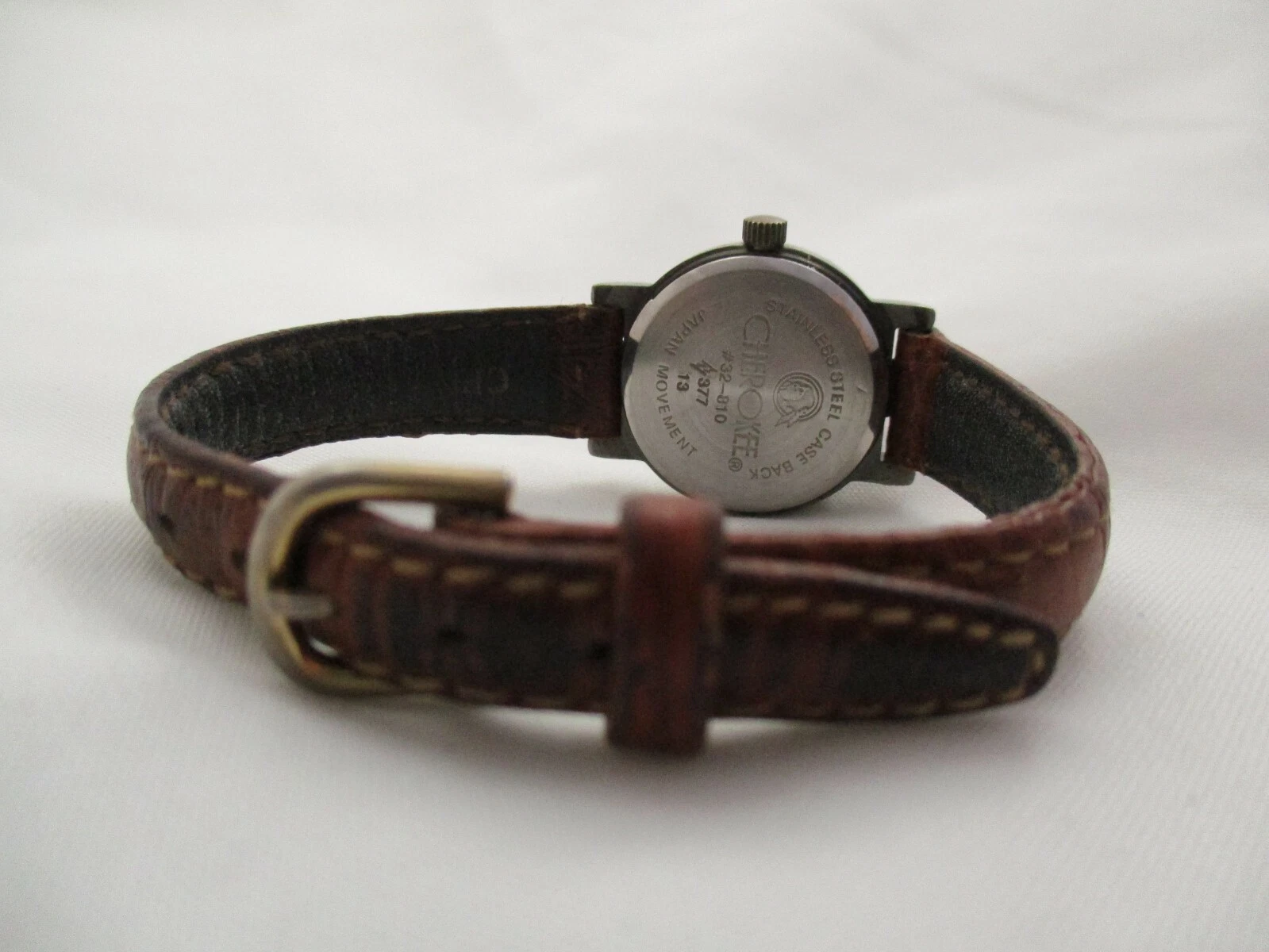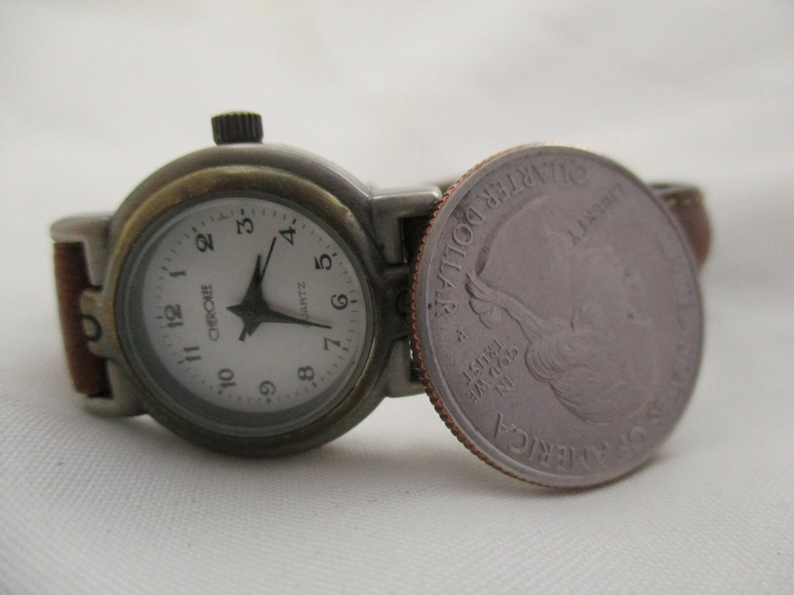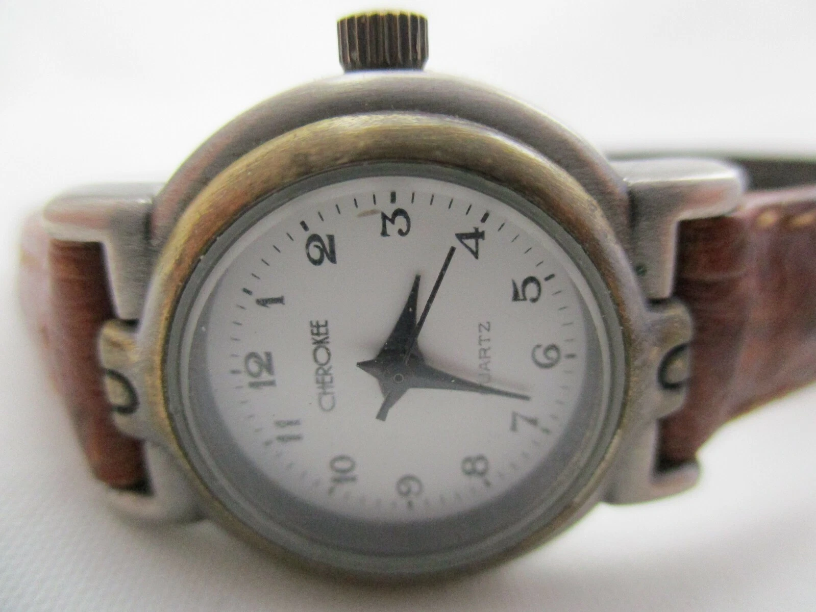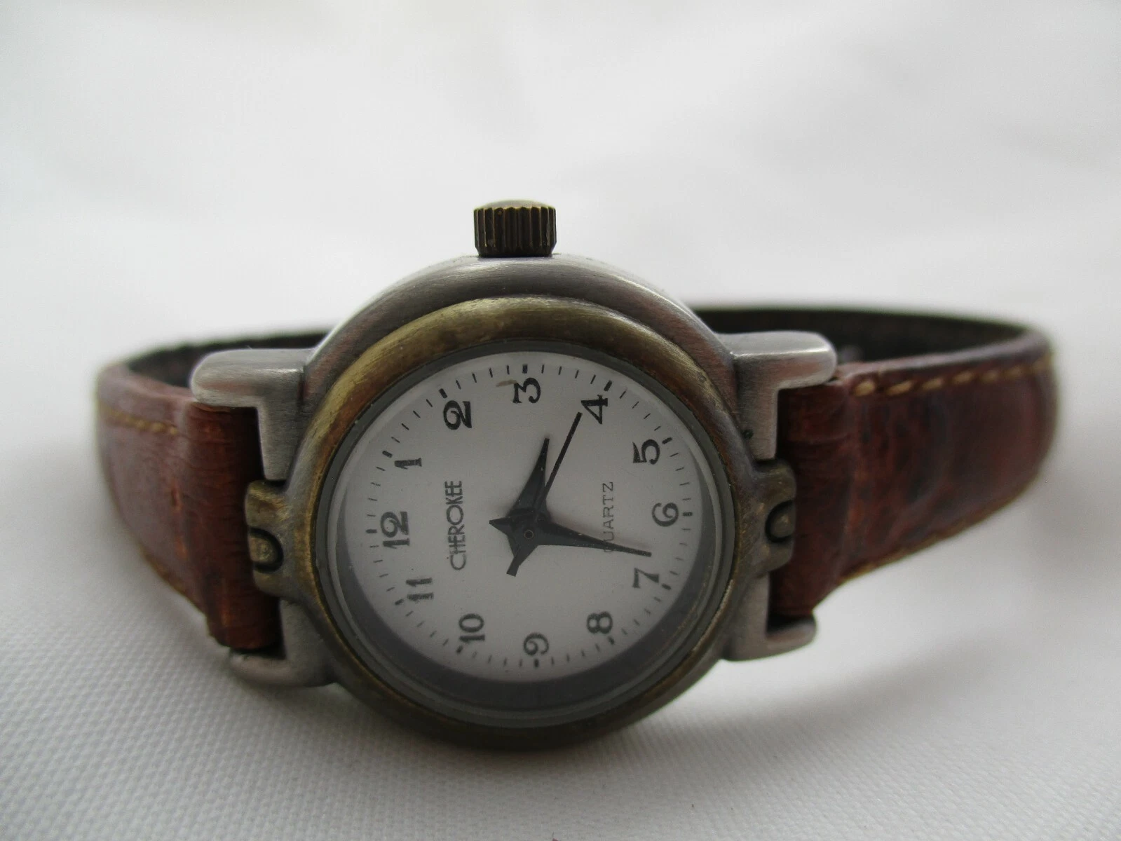Cherokee Analog Wristwatch Brown Buckle Band Silver Tone Round White Face