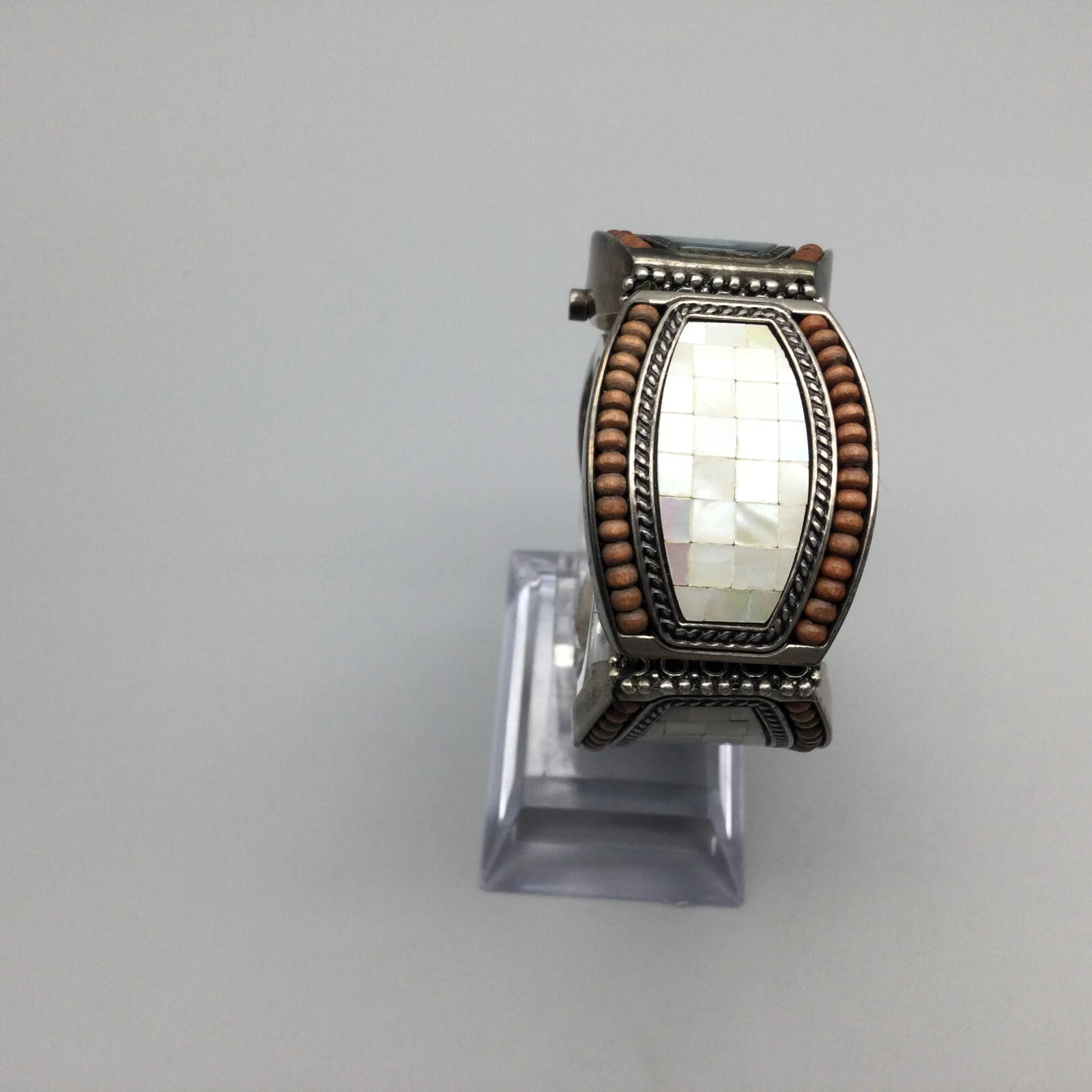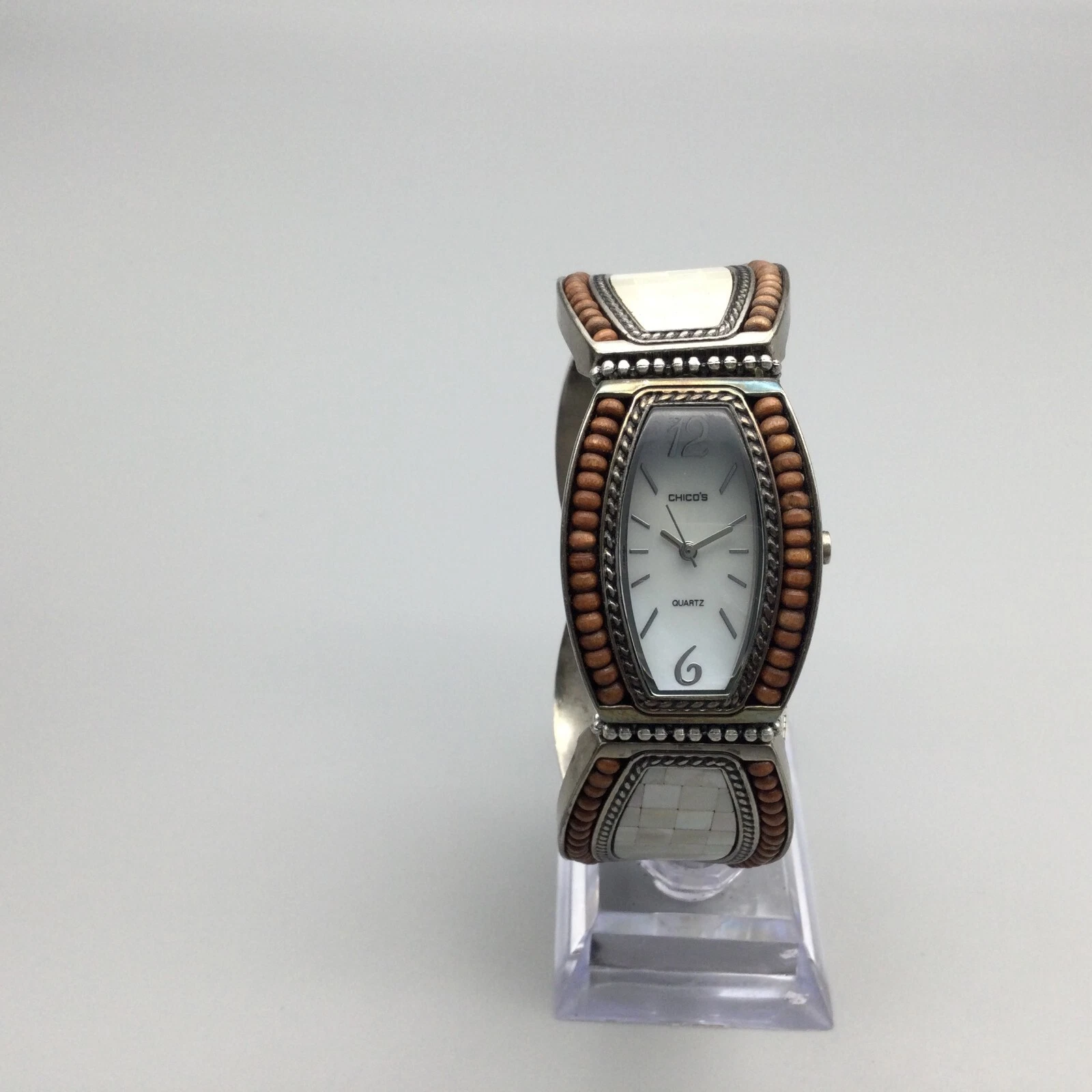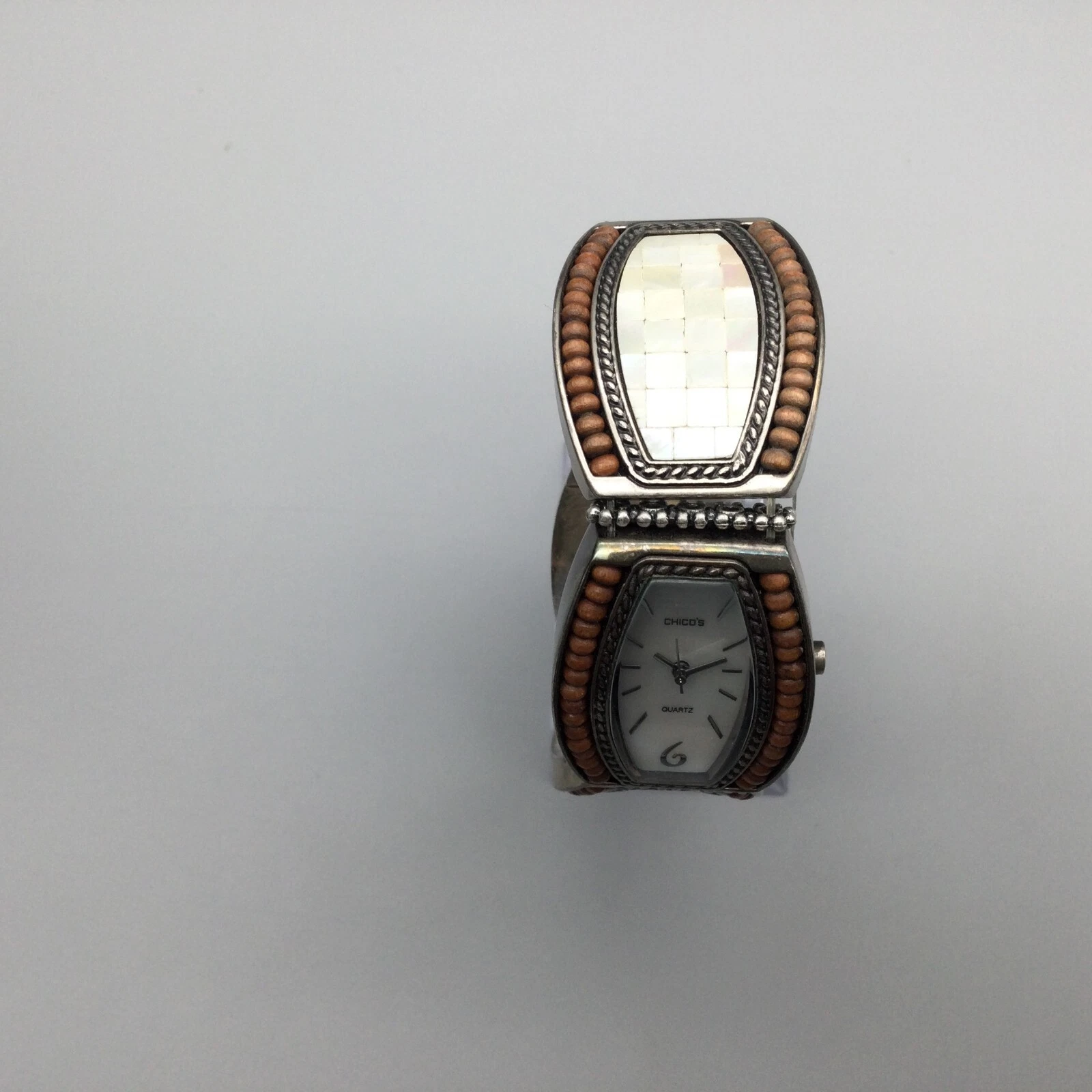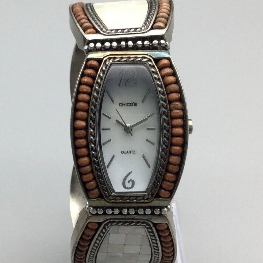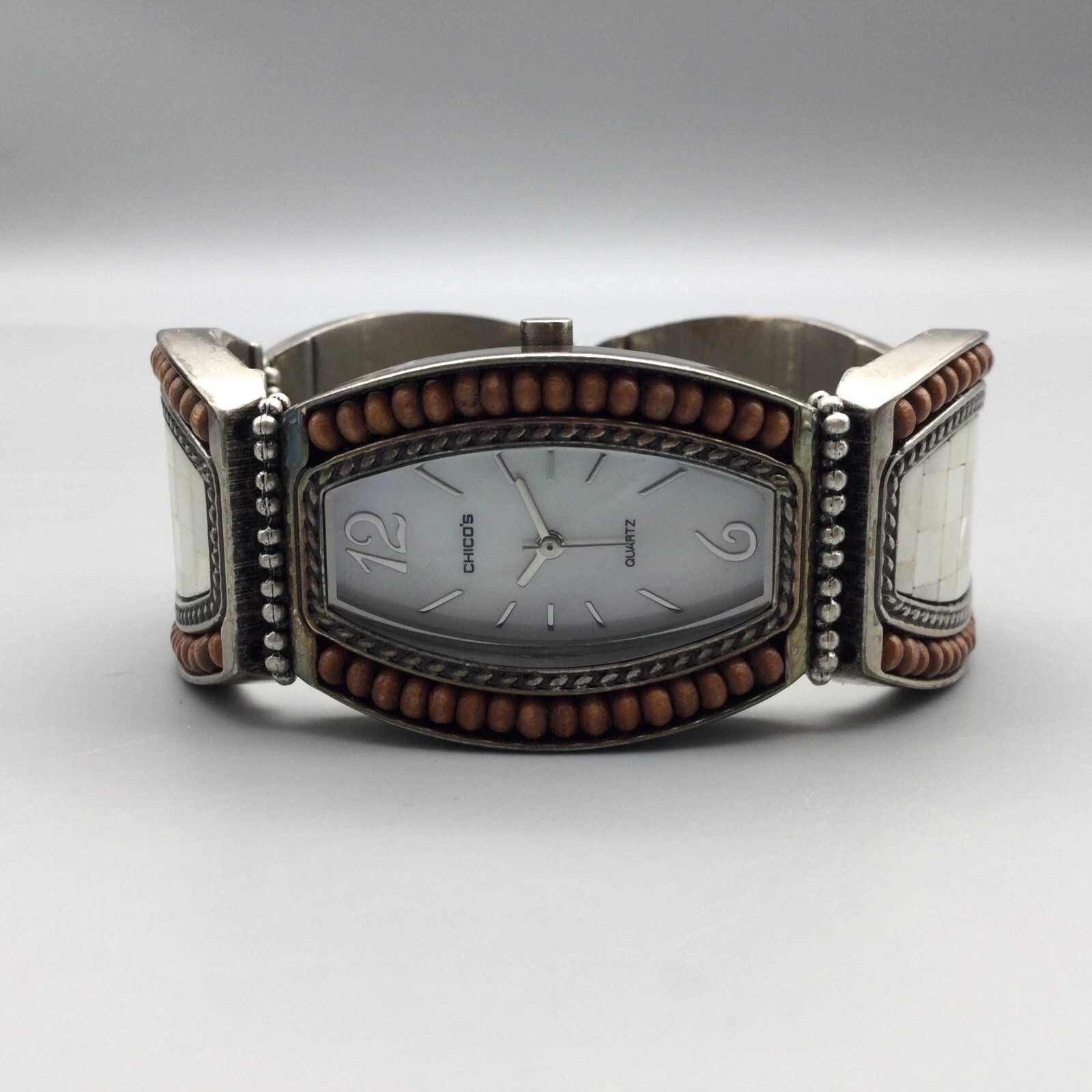 Chico's Watch Women 27mm Silver Tone MOP Mosaic Hinged Open Cuff New Battery