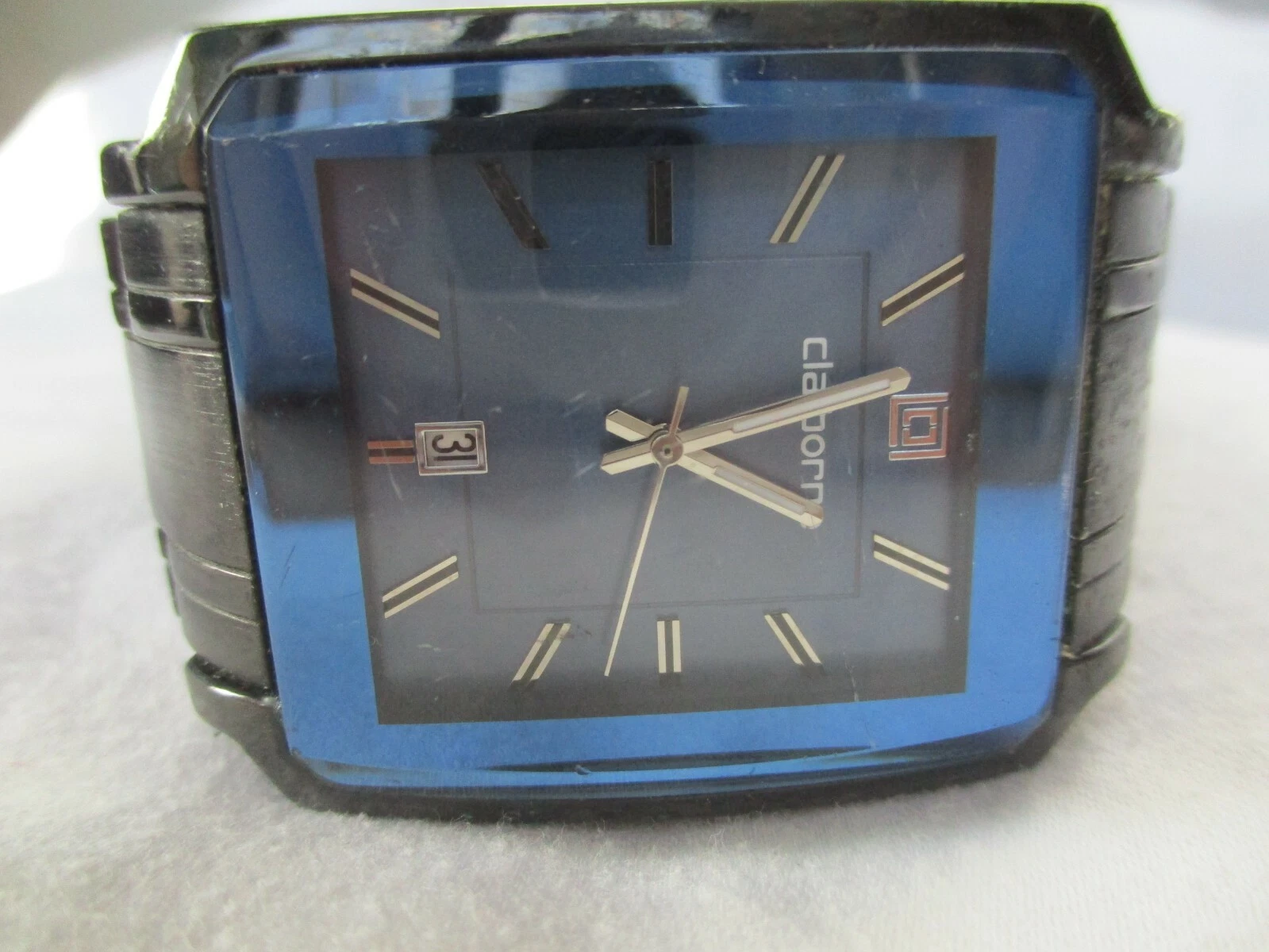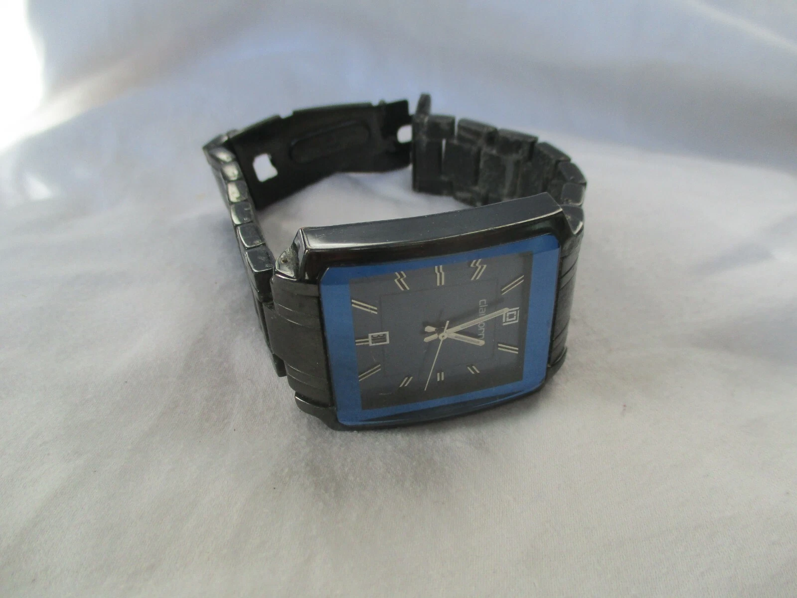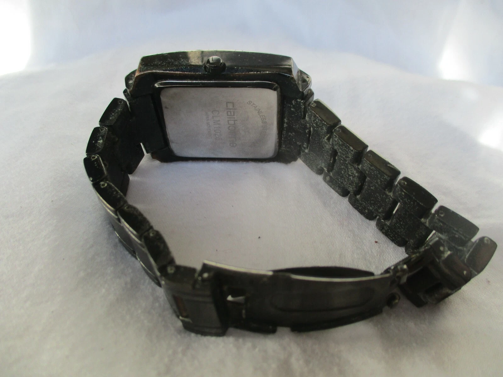 Claiborne Watch Black Stainless Steel Band Rectangular Blue Face Date Indicator