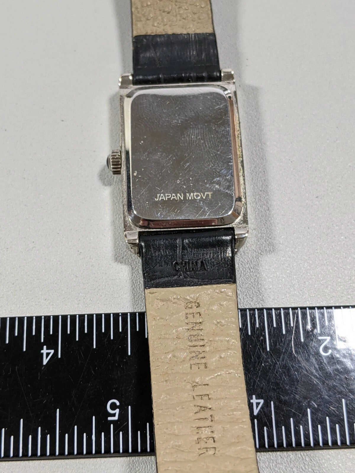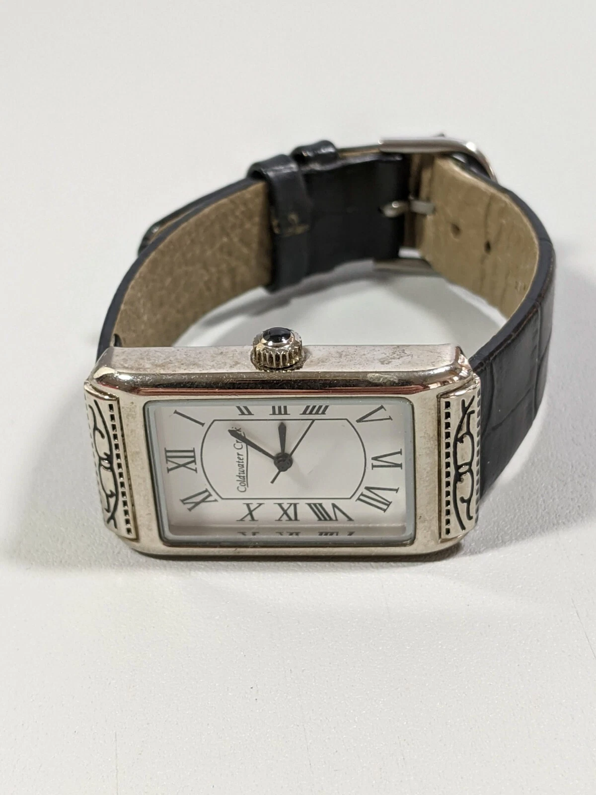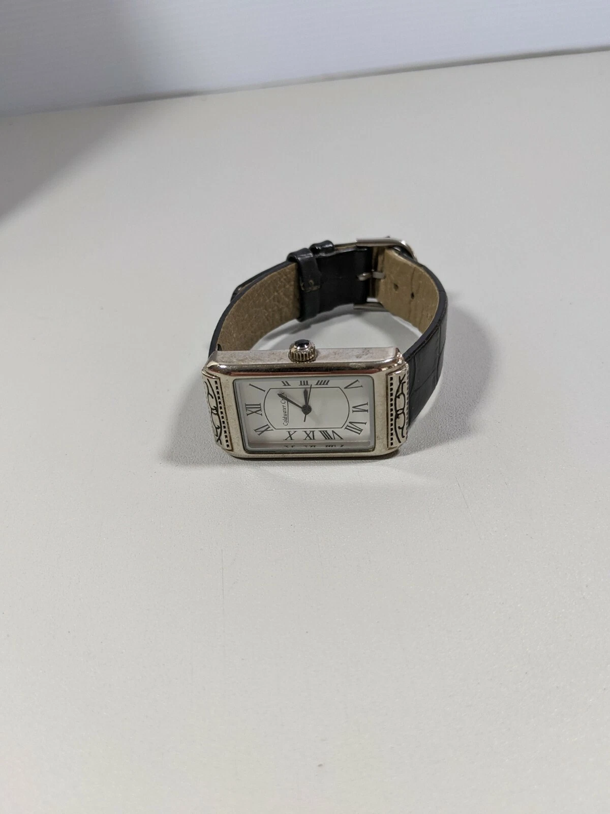 Coldwater Creek Silver Tone Rectangle Case White Dial Black Leather Band Watch