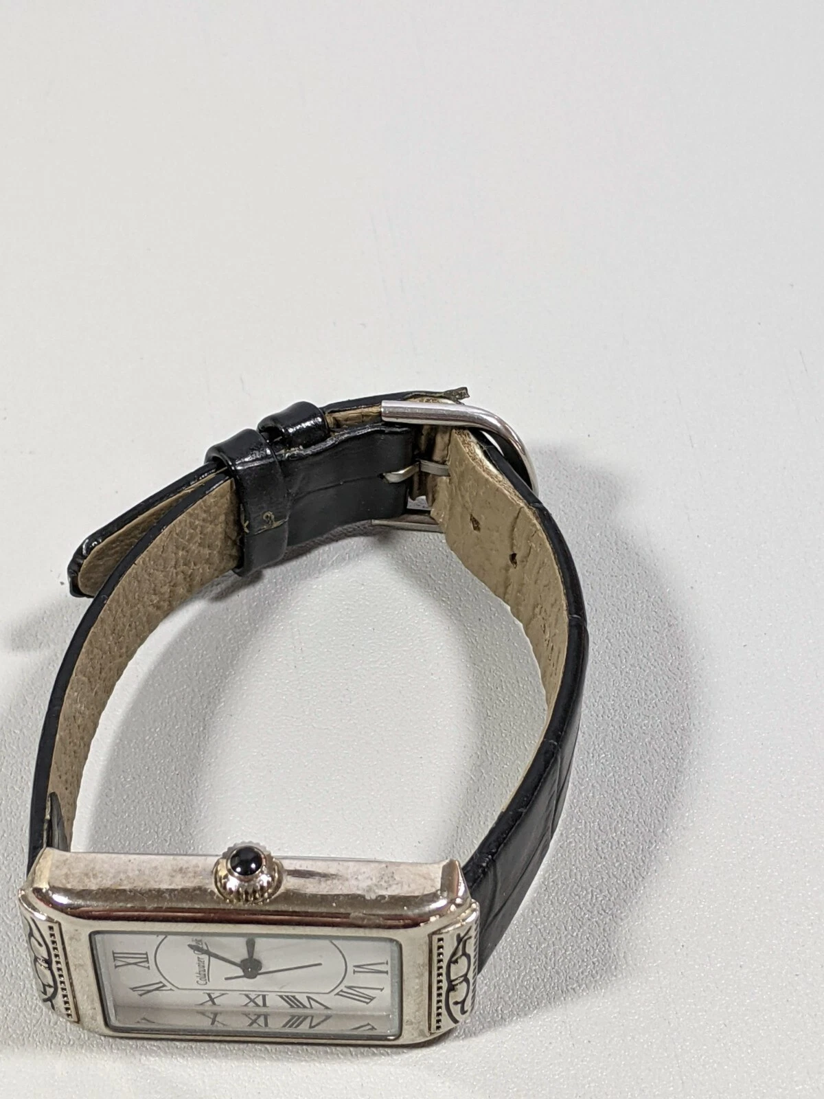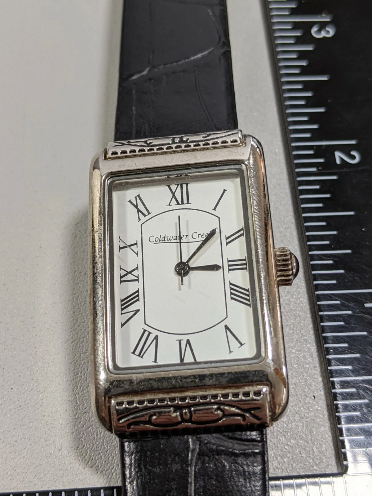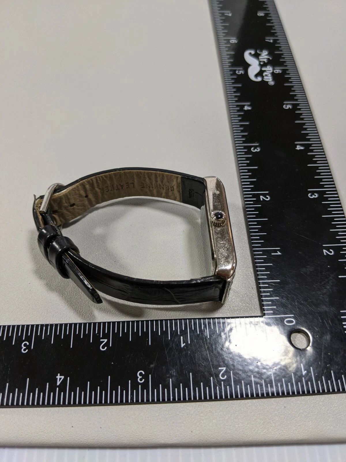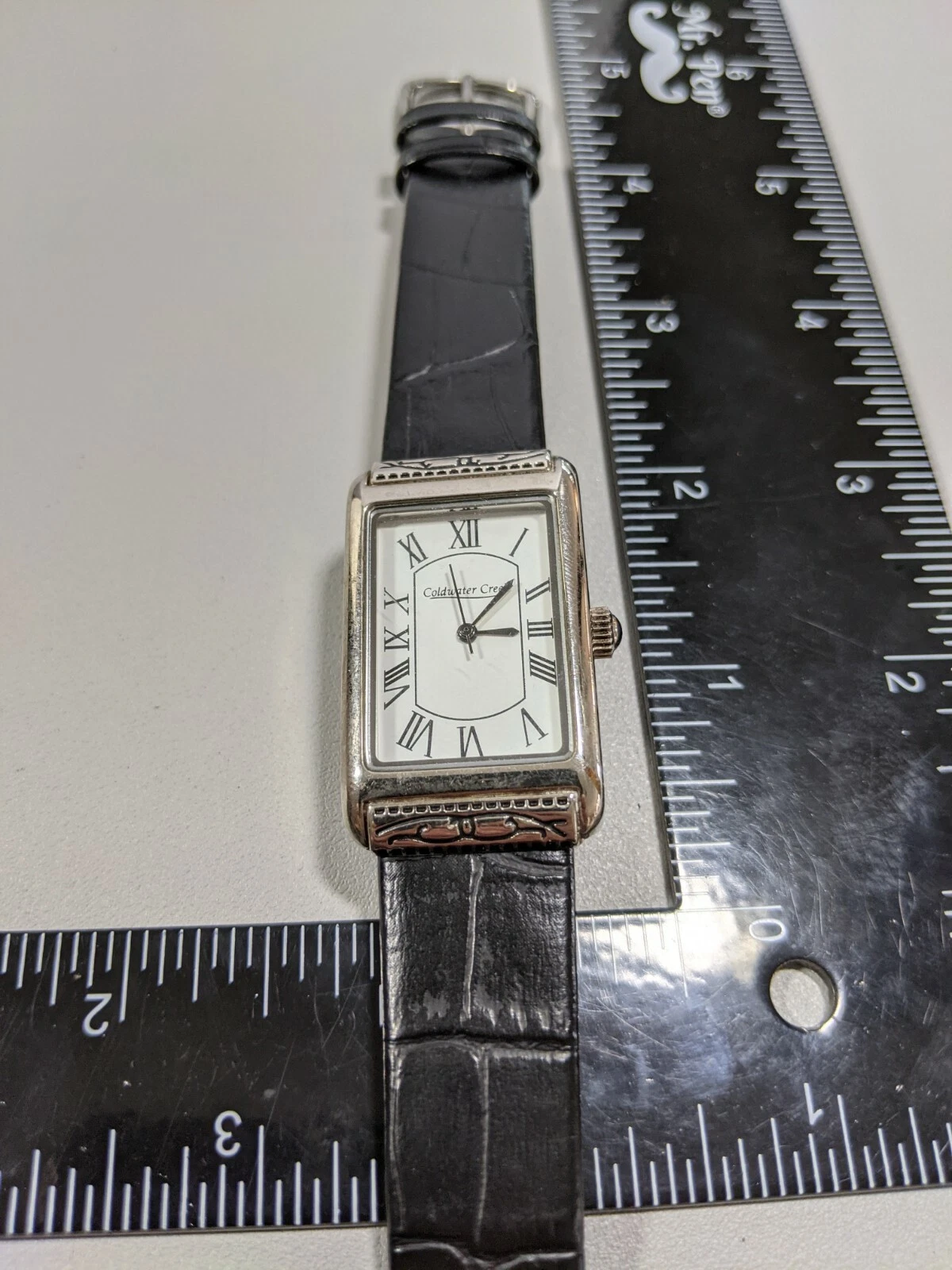 Coldwater Creek Silver Tone Rectangle Case White Dial Black Leather Band Watch