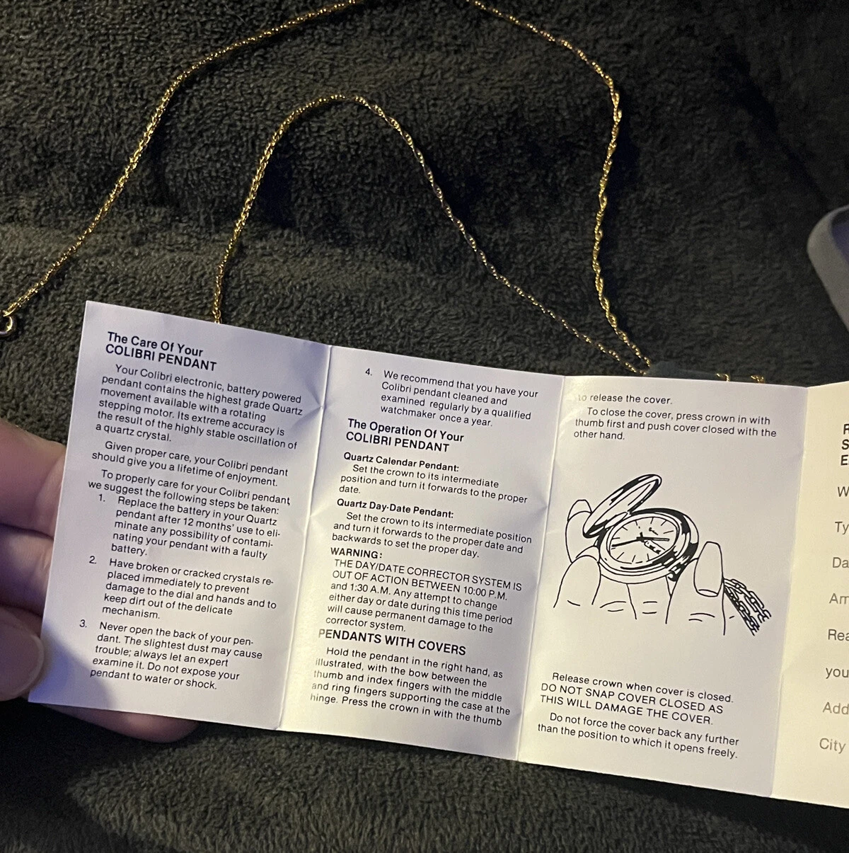 Colibri Incabloc 17 Jewel Quartz Necklace Pocket Watch Gorgeous &Vintage