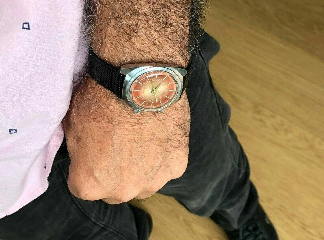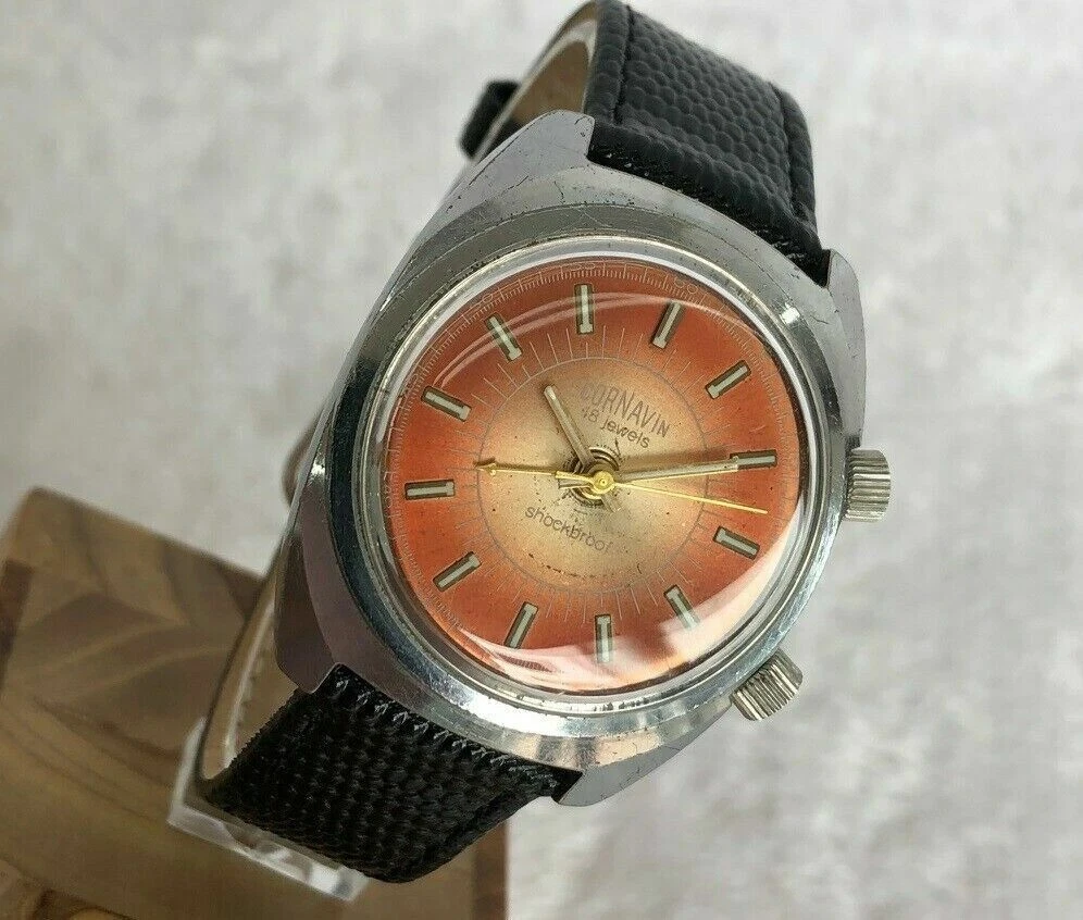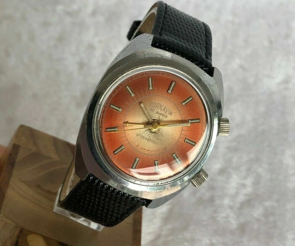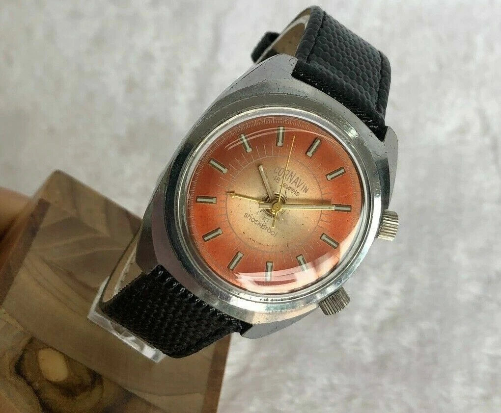 CORNAVIN SHOCKBROOF ALARM 34mm TROPICAL DIAL VINTAGE STAINLESS STEEL MEN WATCH