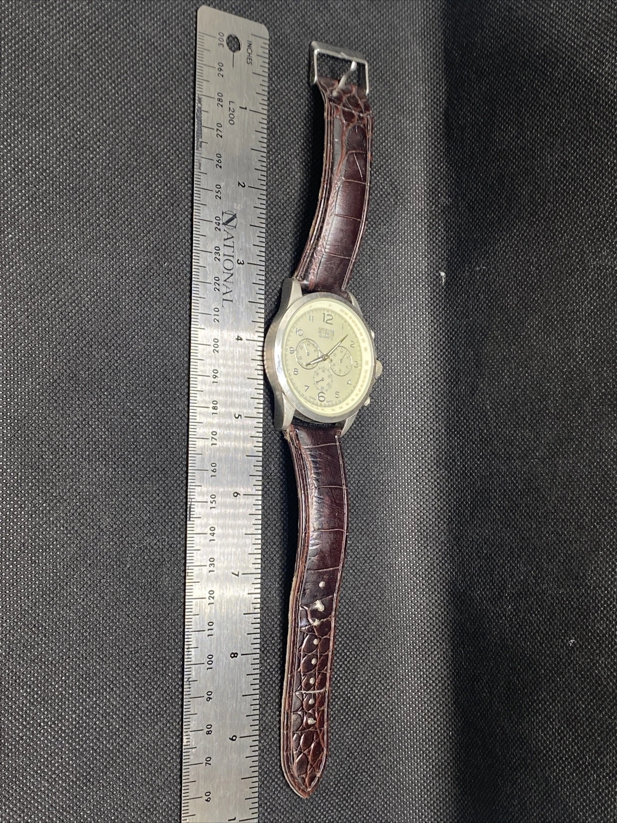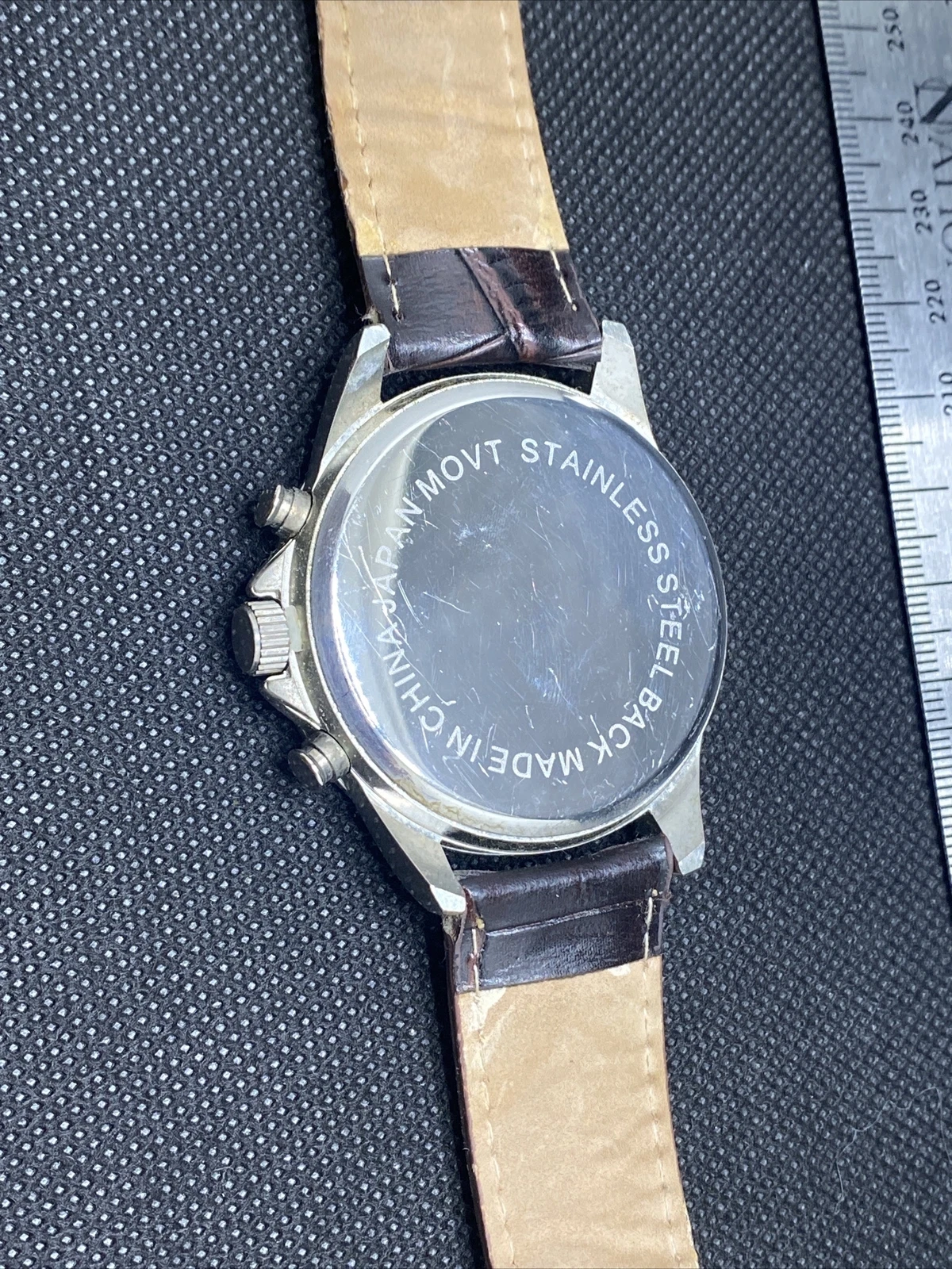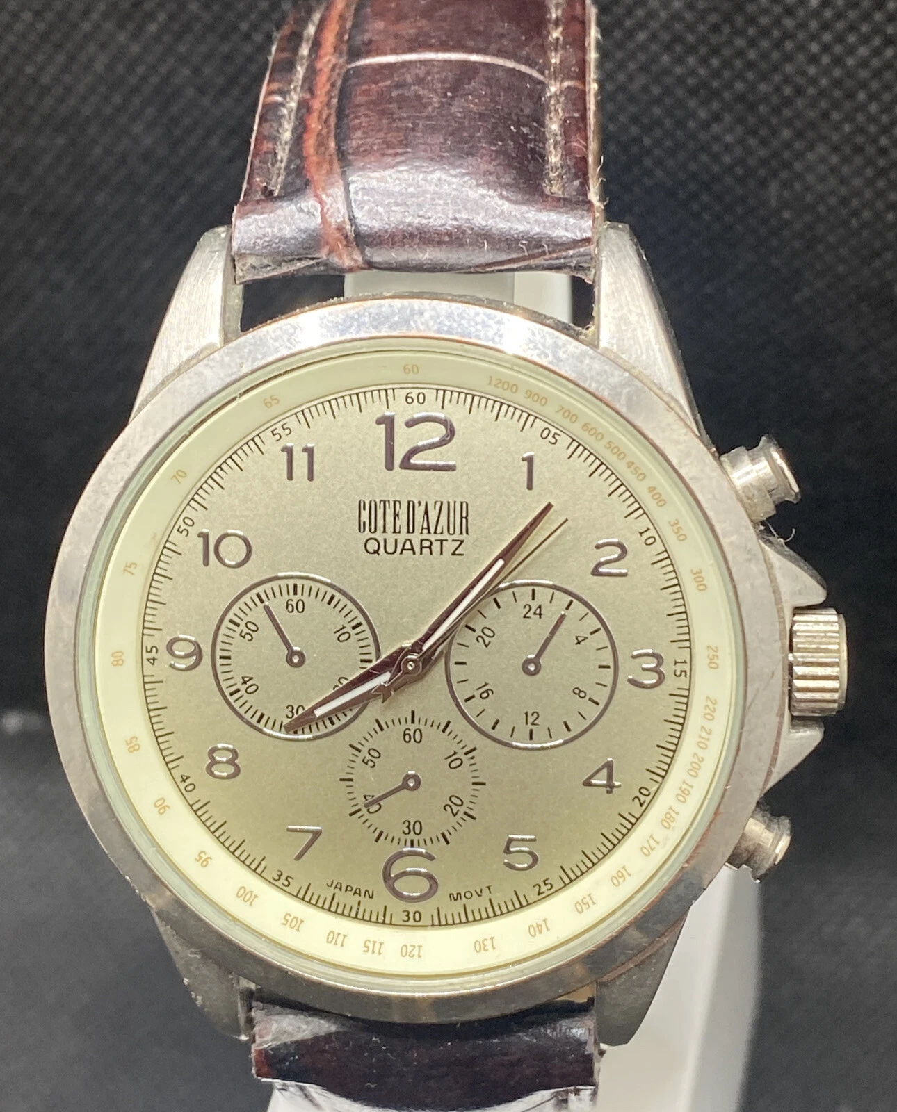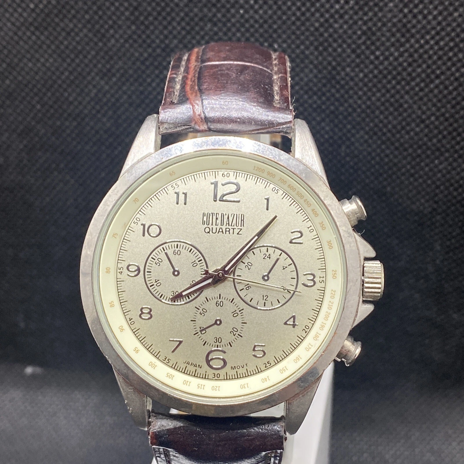 Cote D'Azur Mens Watch Silver Tone With Brown Faux leather Band With New Battery