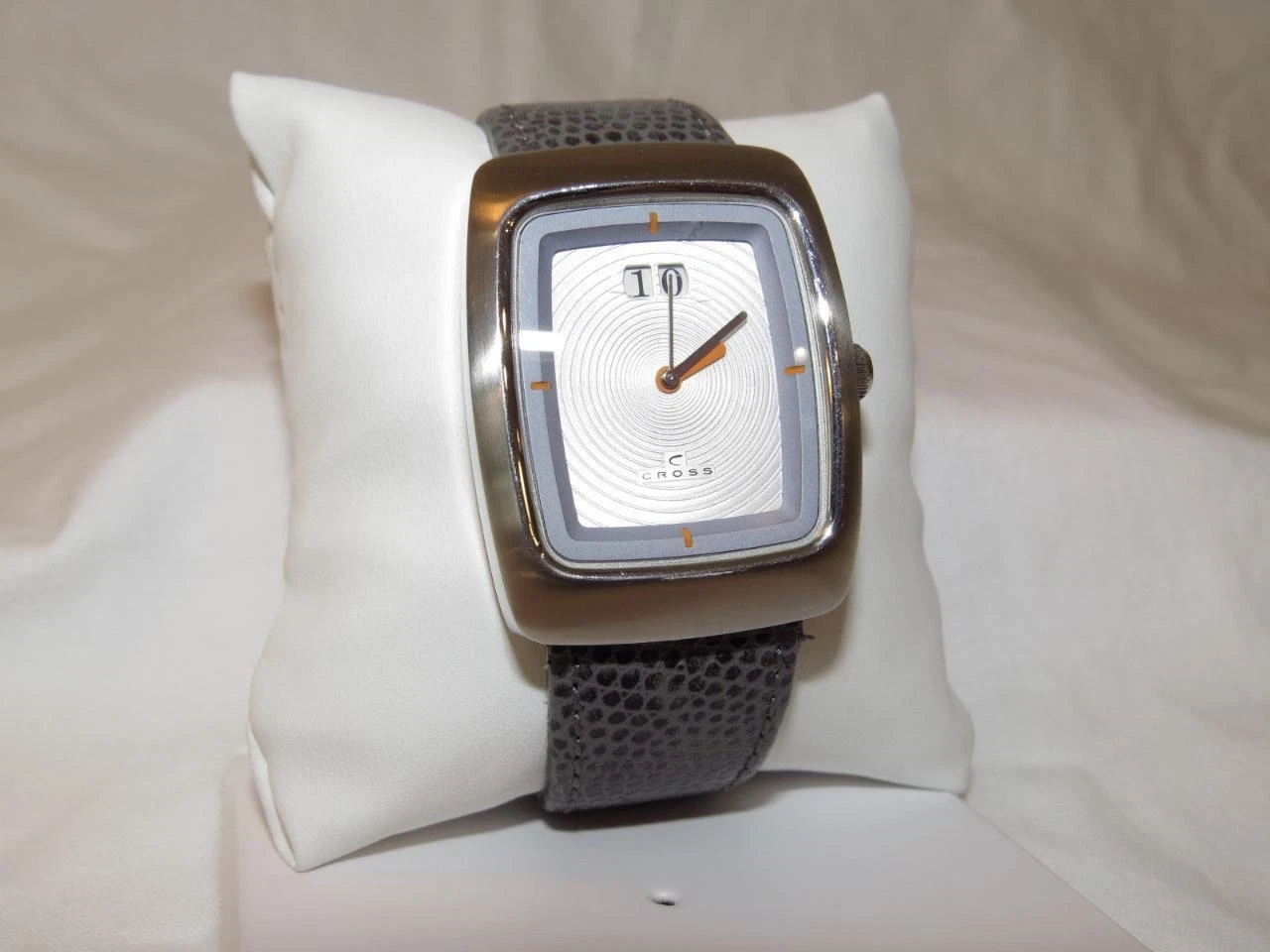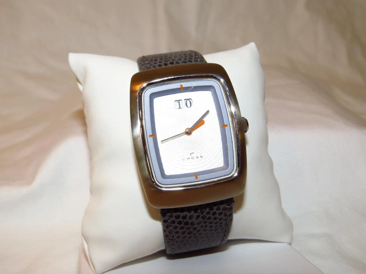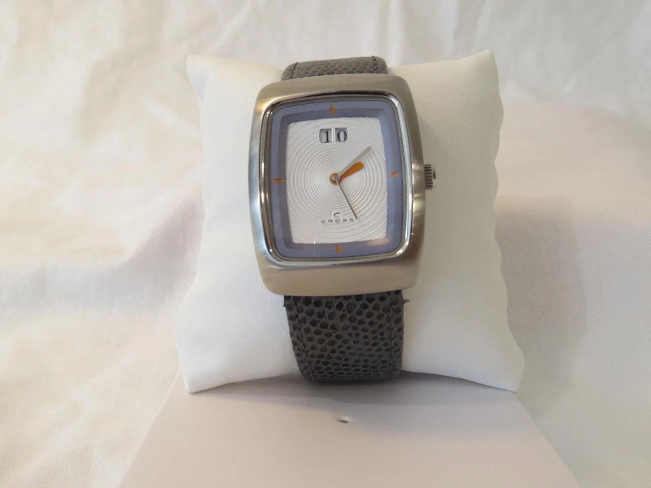 Men's CROSS Stainless Steel Watch Grey Lizard Grain Band NOS Date Orange accents