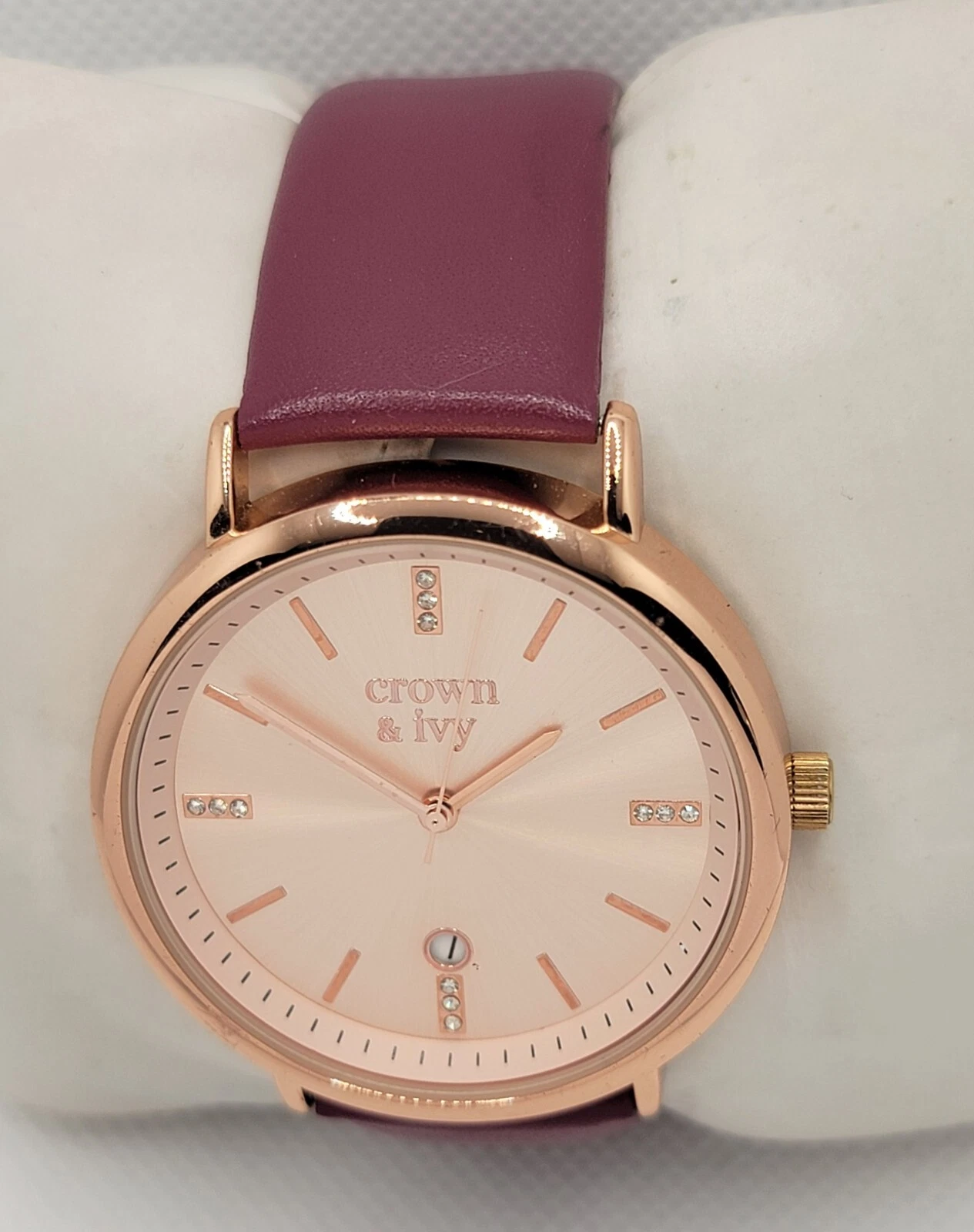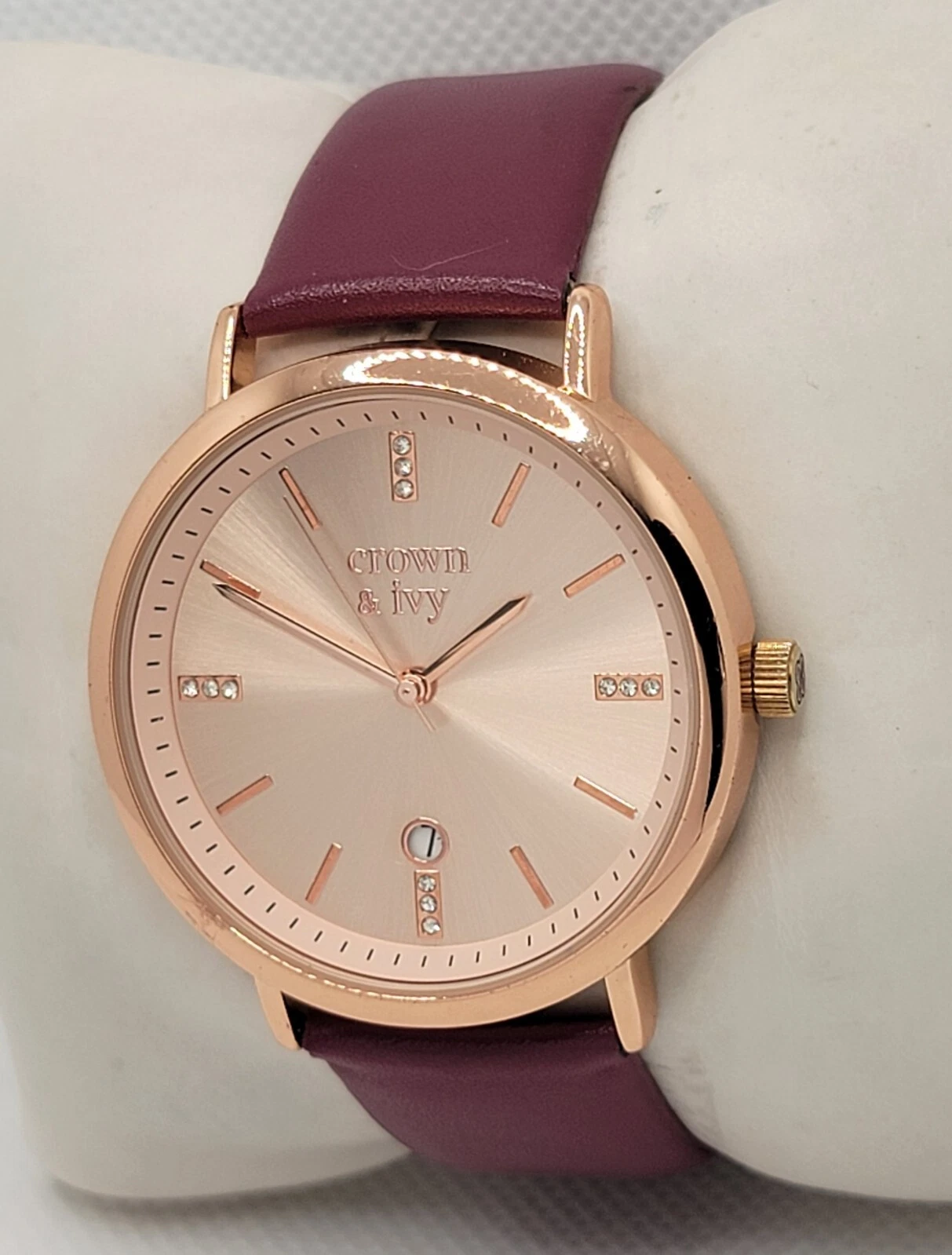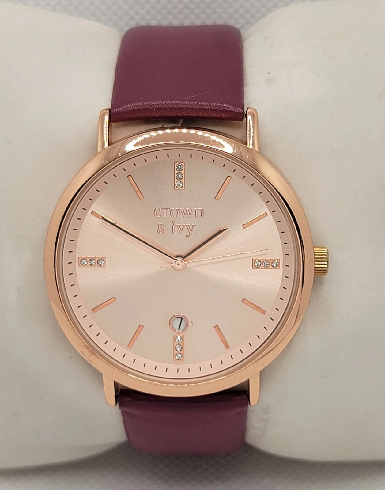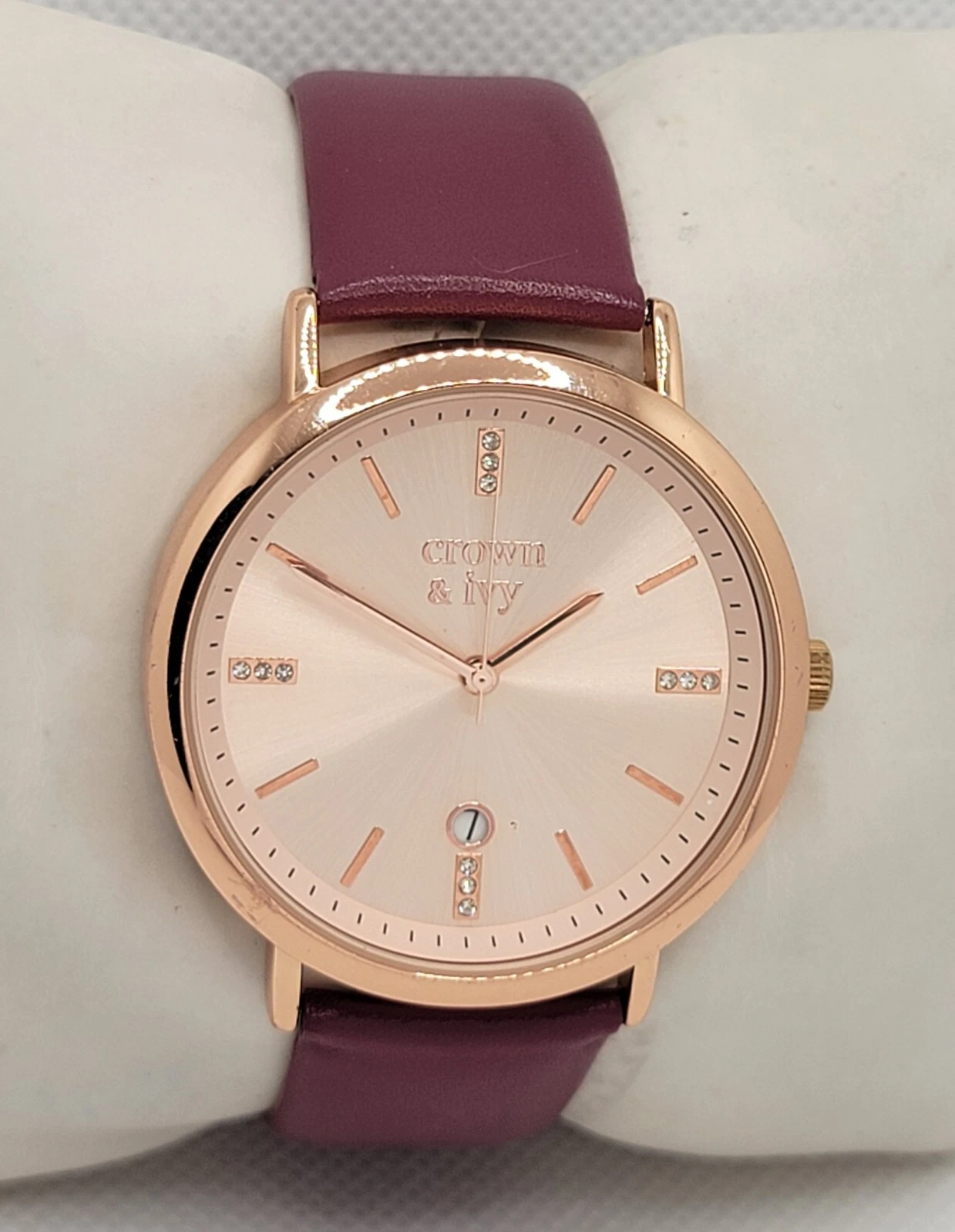 Ladies Crown & Ivy Round Rose Gold Tone Dial Leather Band Watch H6