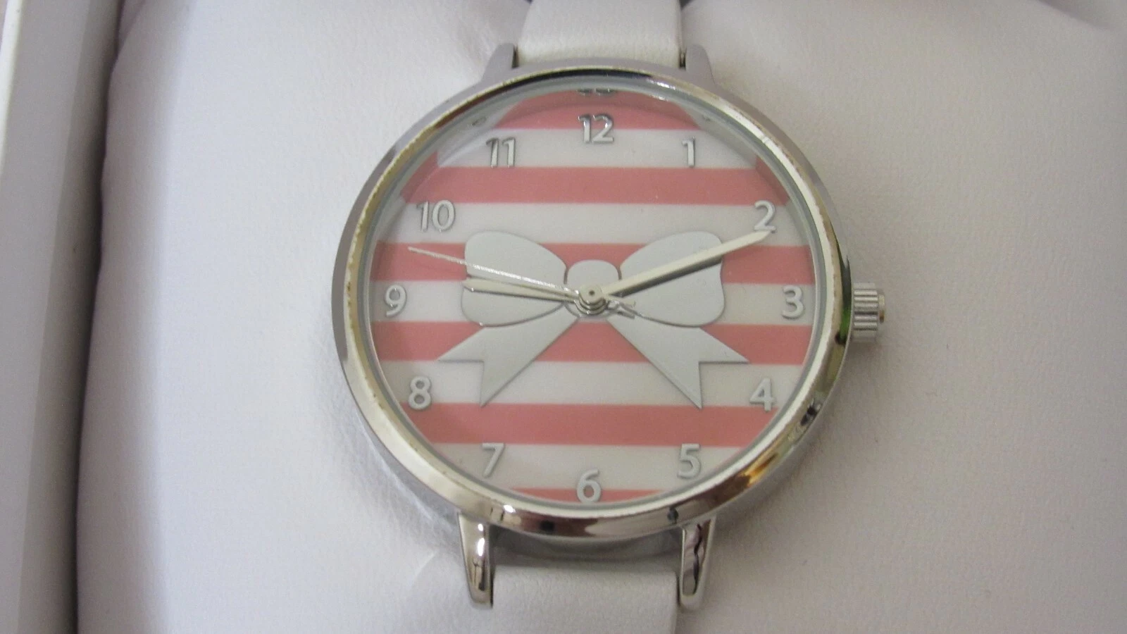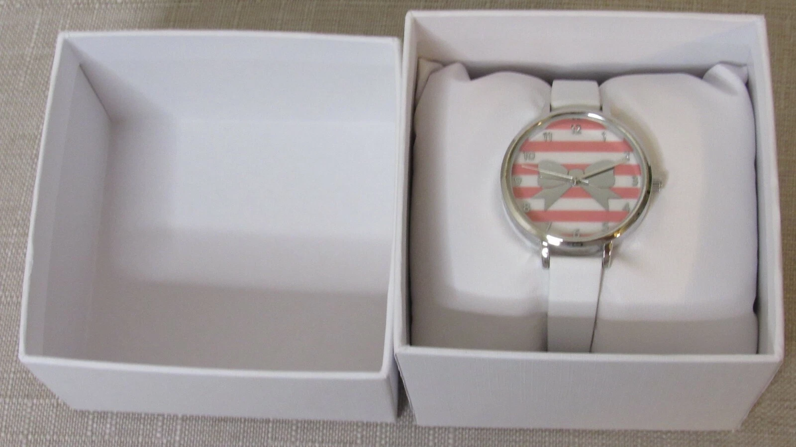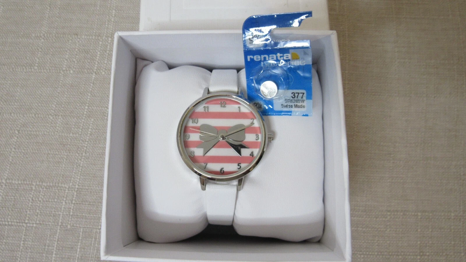 Crown & Ivy Women's White Leather Strap Pink Stripe Bow Silver Tone Watch NIB!