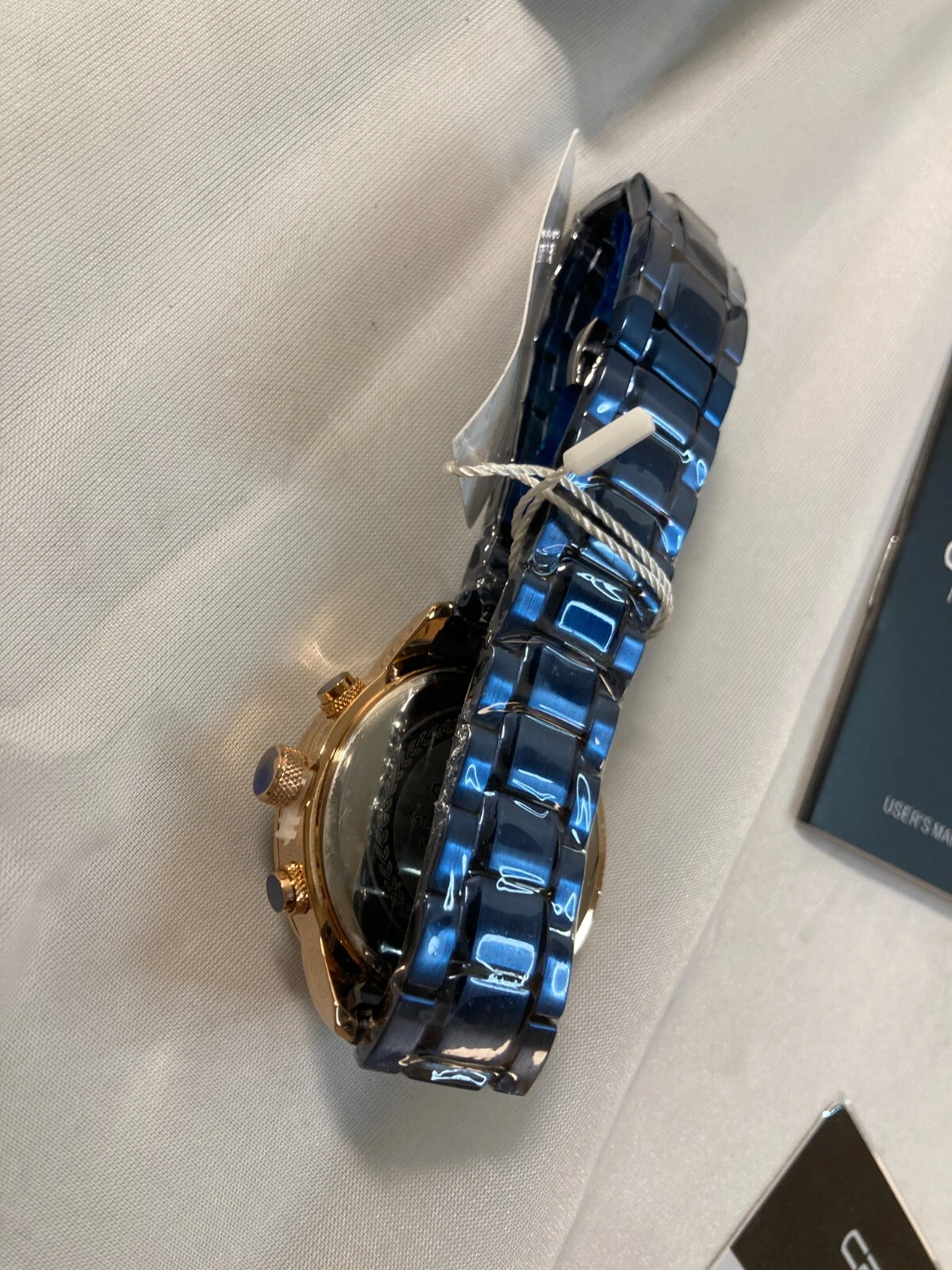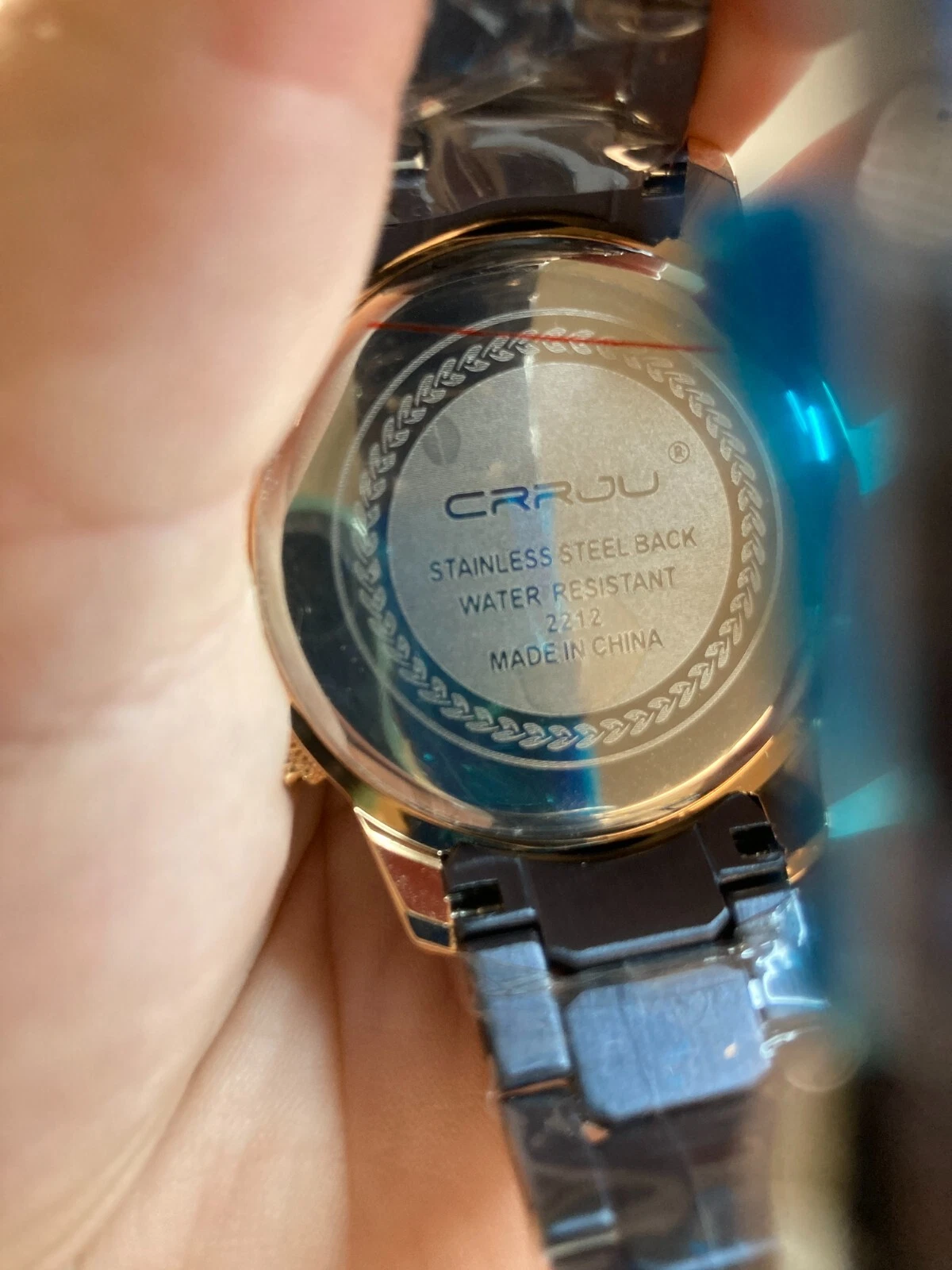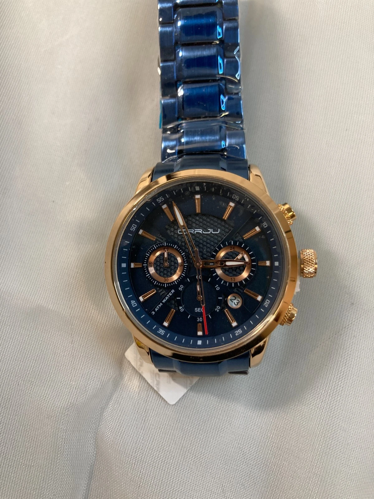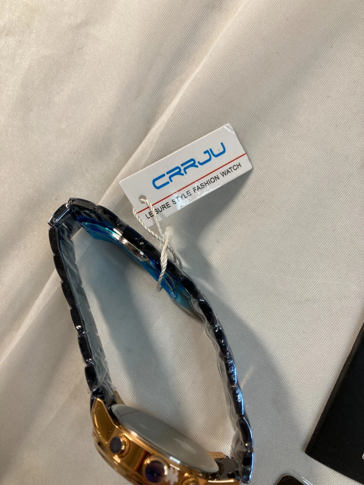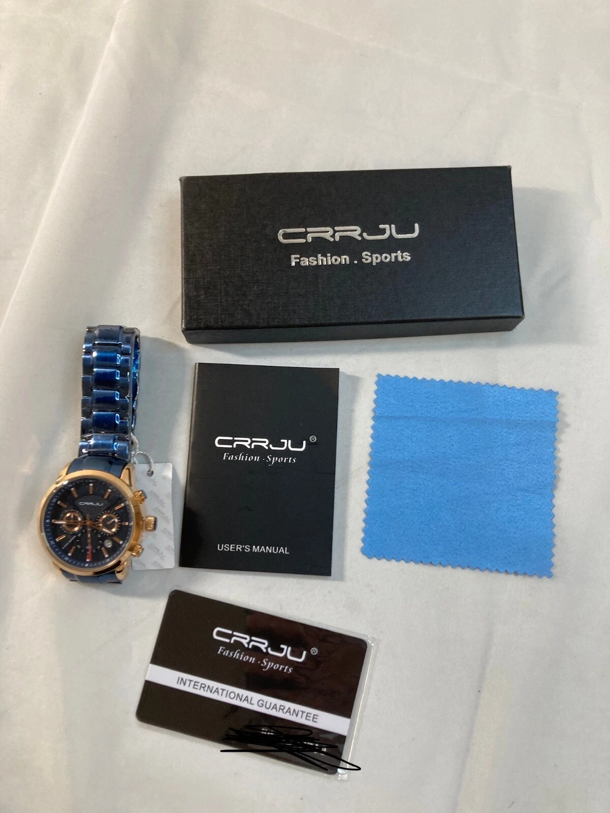 CRRJU Mens Golden Blue Leisure Style Stainless Steel Water Resistant Wristwatch