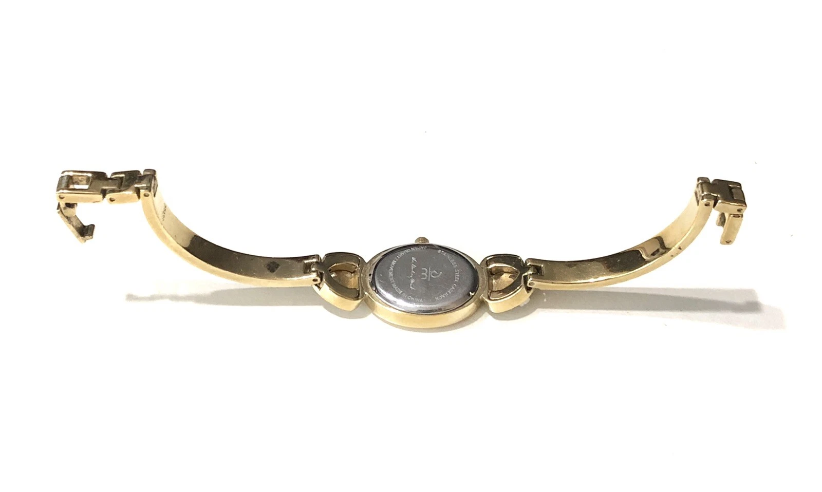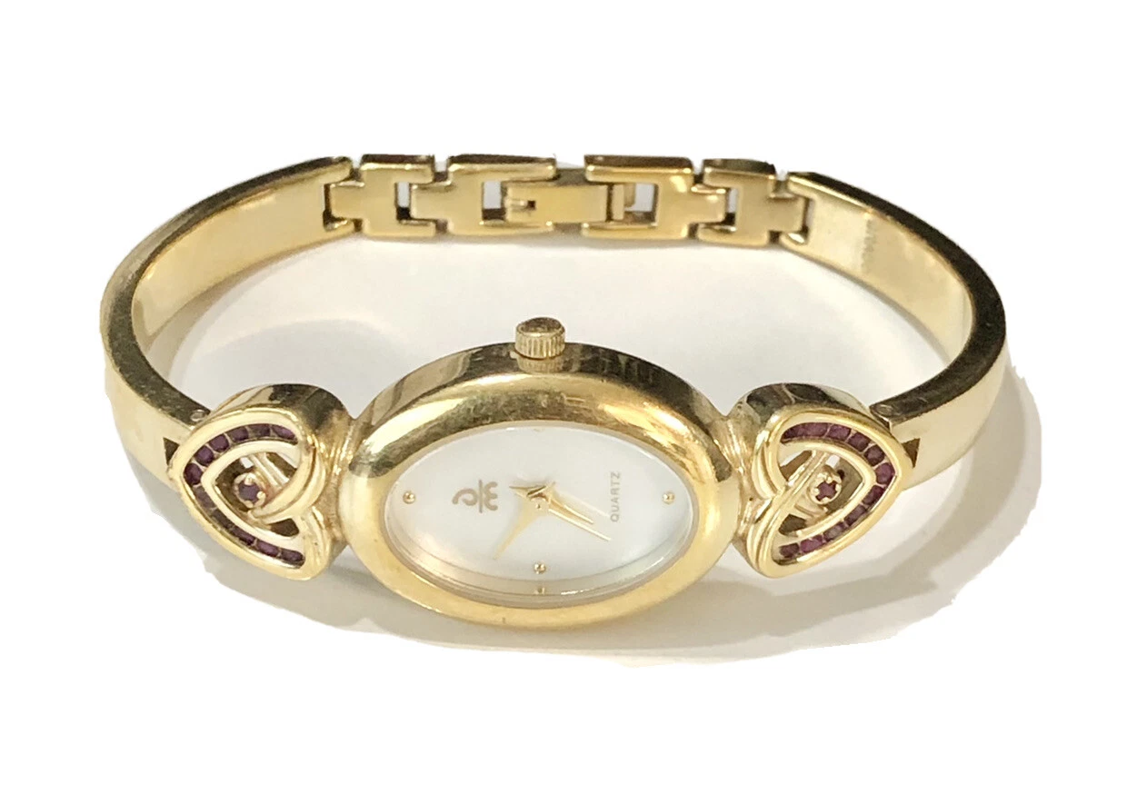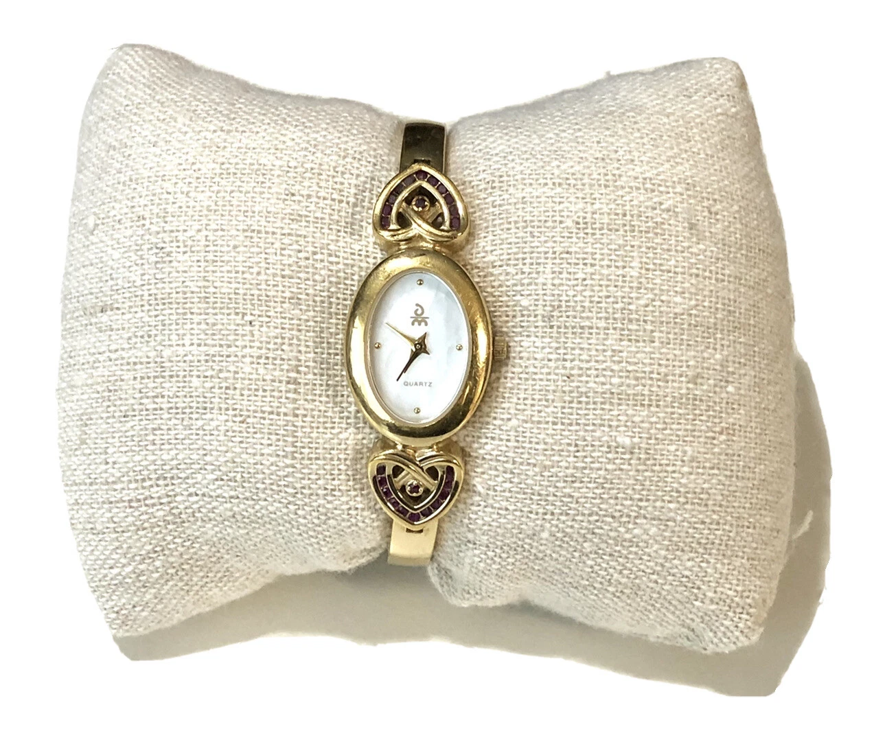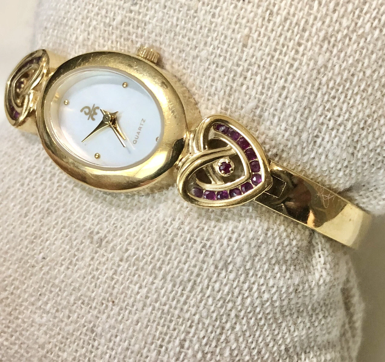 DANBURY MINT LADIES WATCH MOTHER OF PEARL HEART RUBY GOLD TONE 6.25”