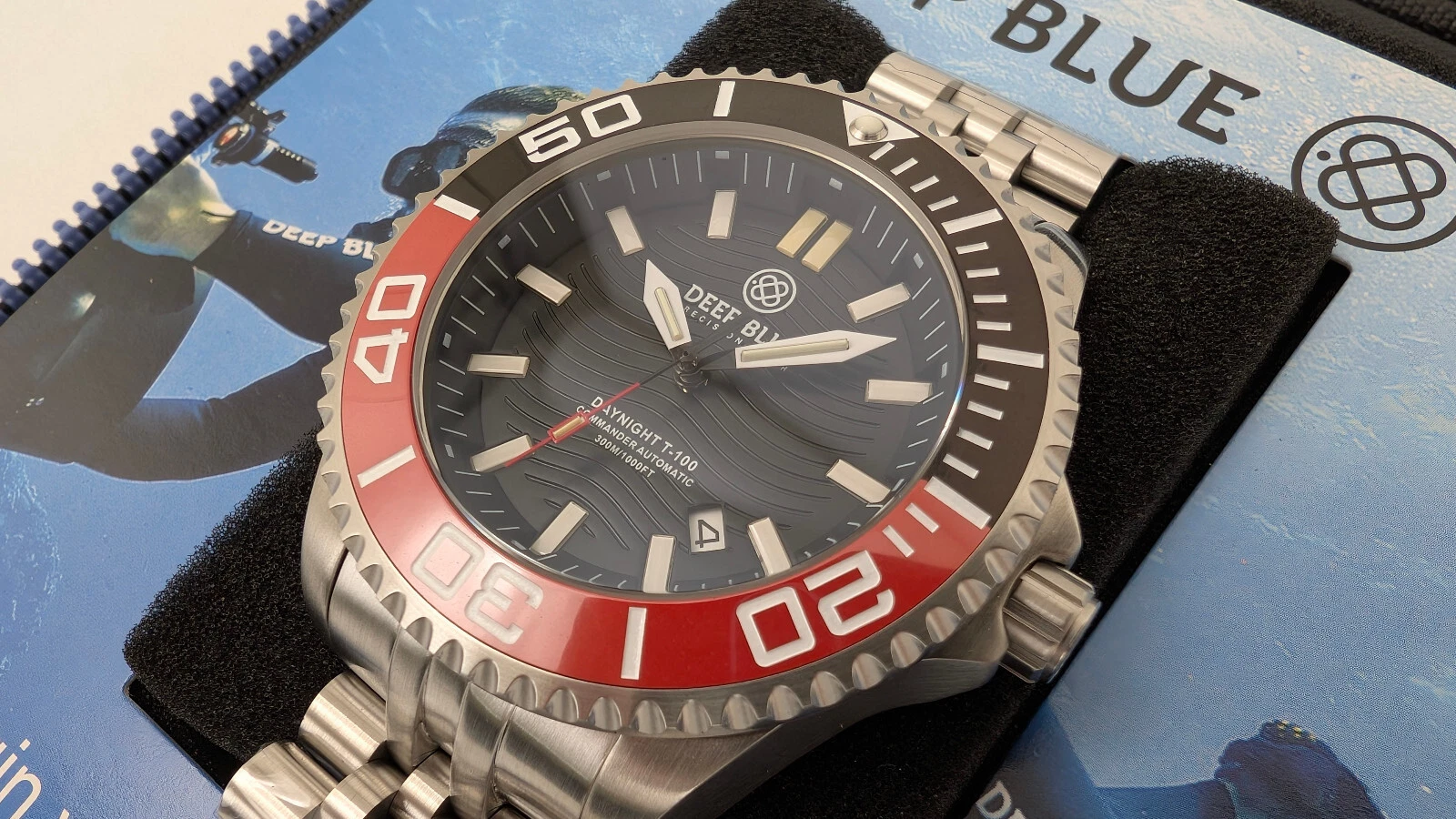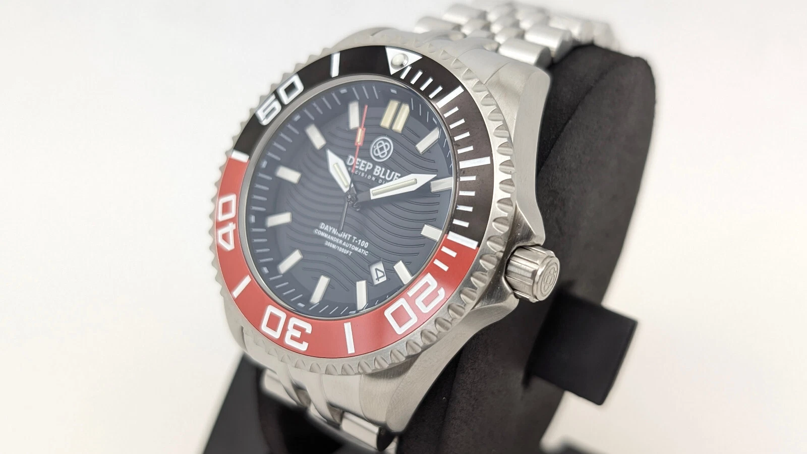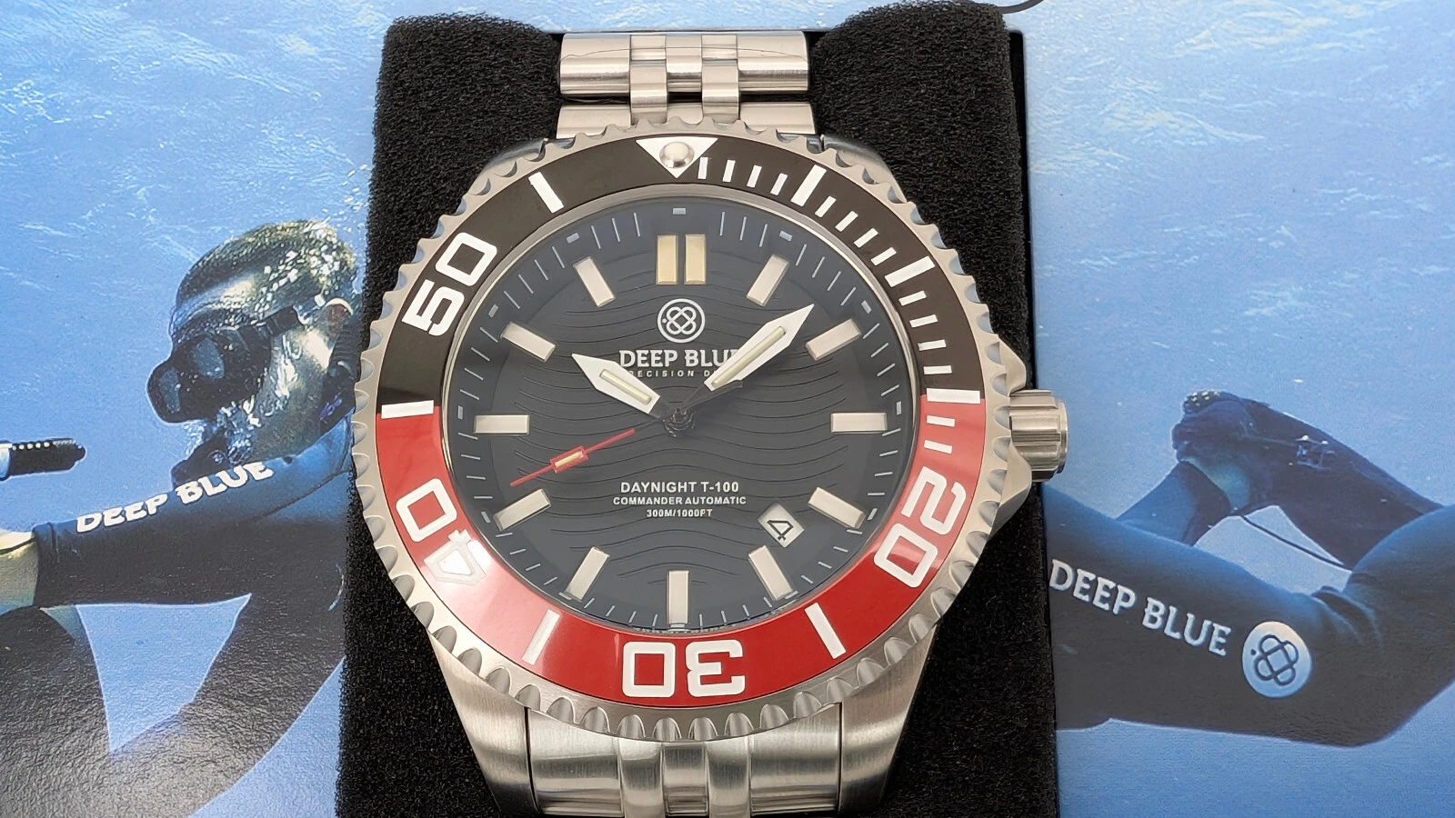 Deep Blue DayNight Commander T-100 Automatic Men's Diver Watch Black-Red Bezel