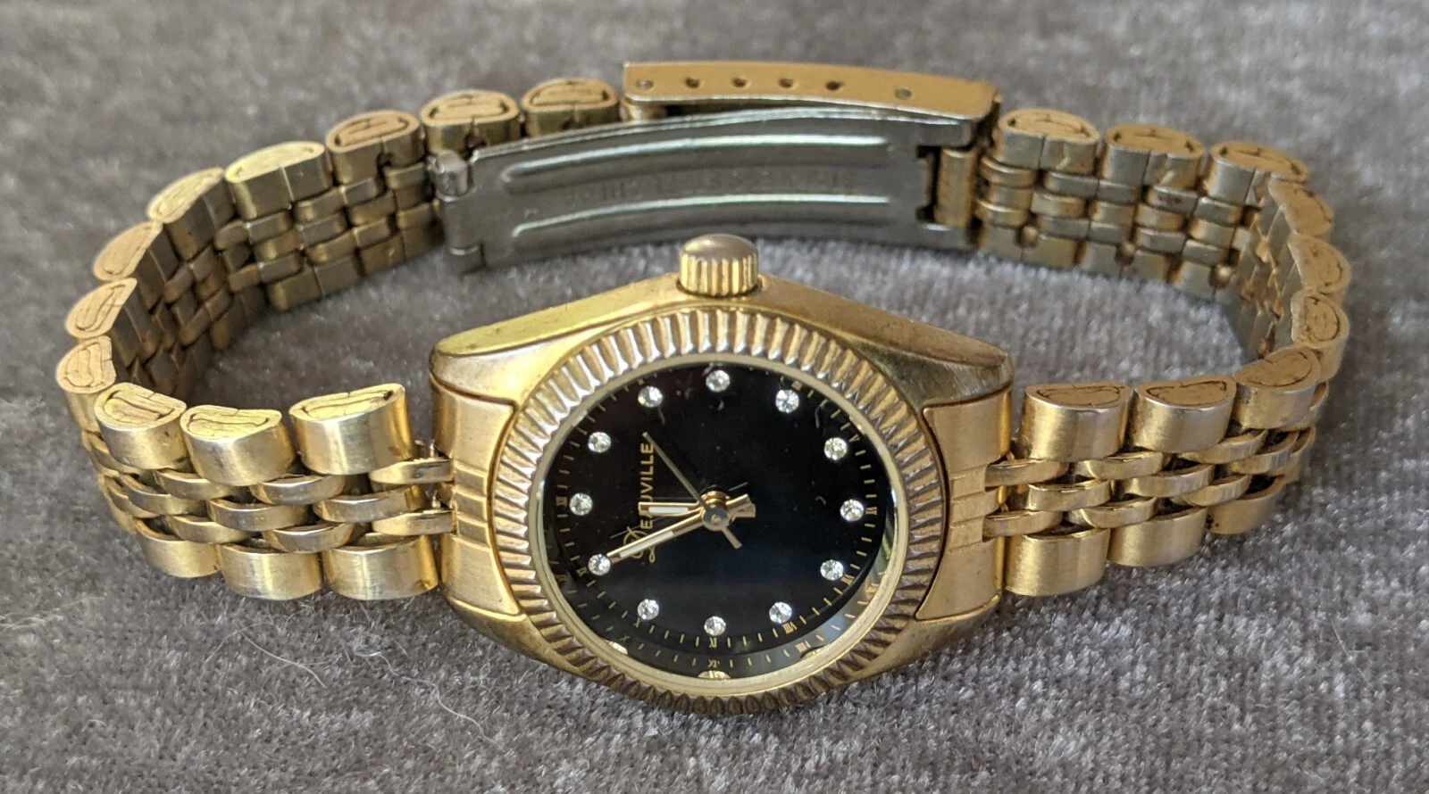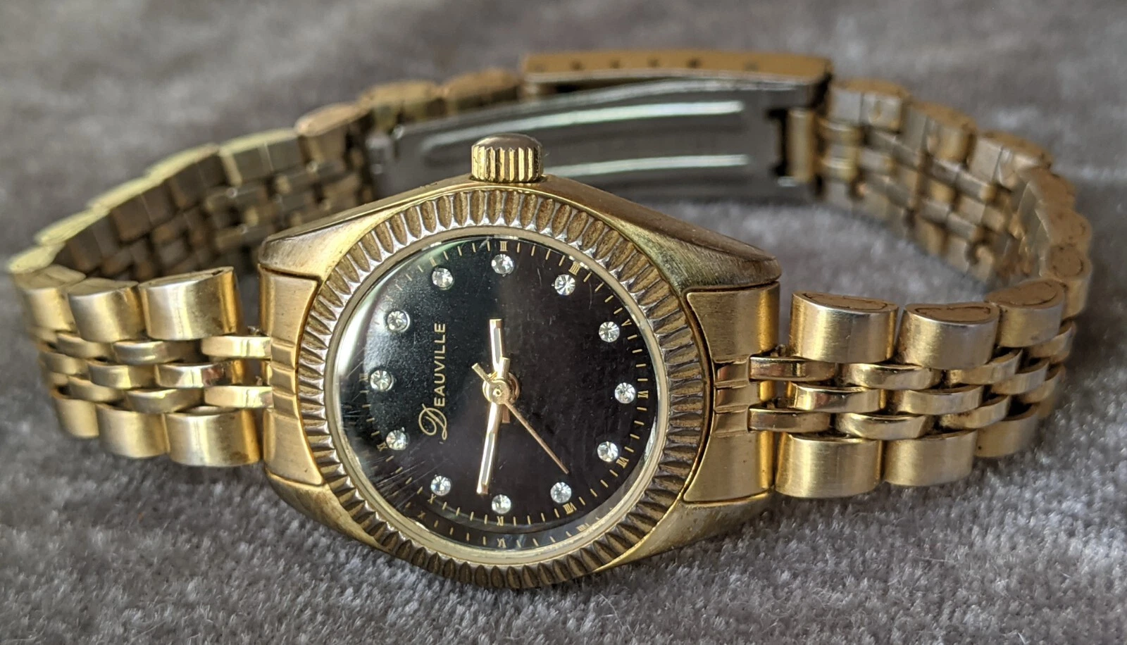 Classic Deauville Women's Gold Tone Quartz Watch Black Dial Jeweled Markers