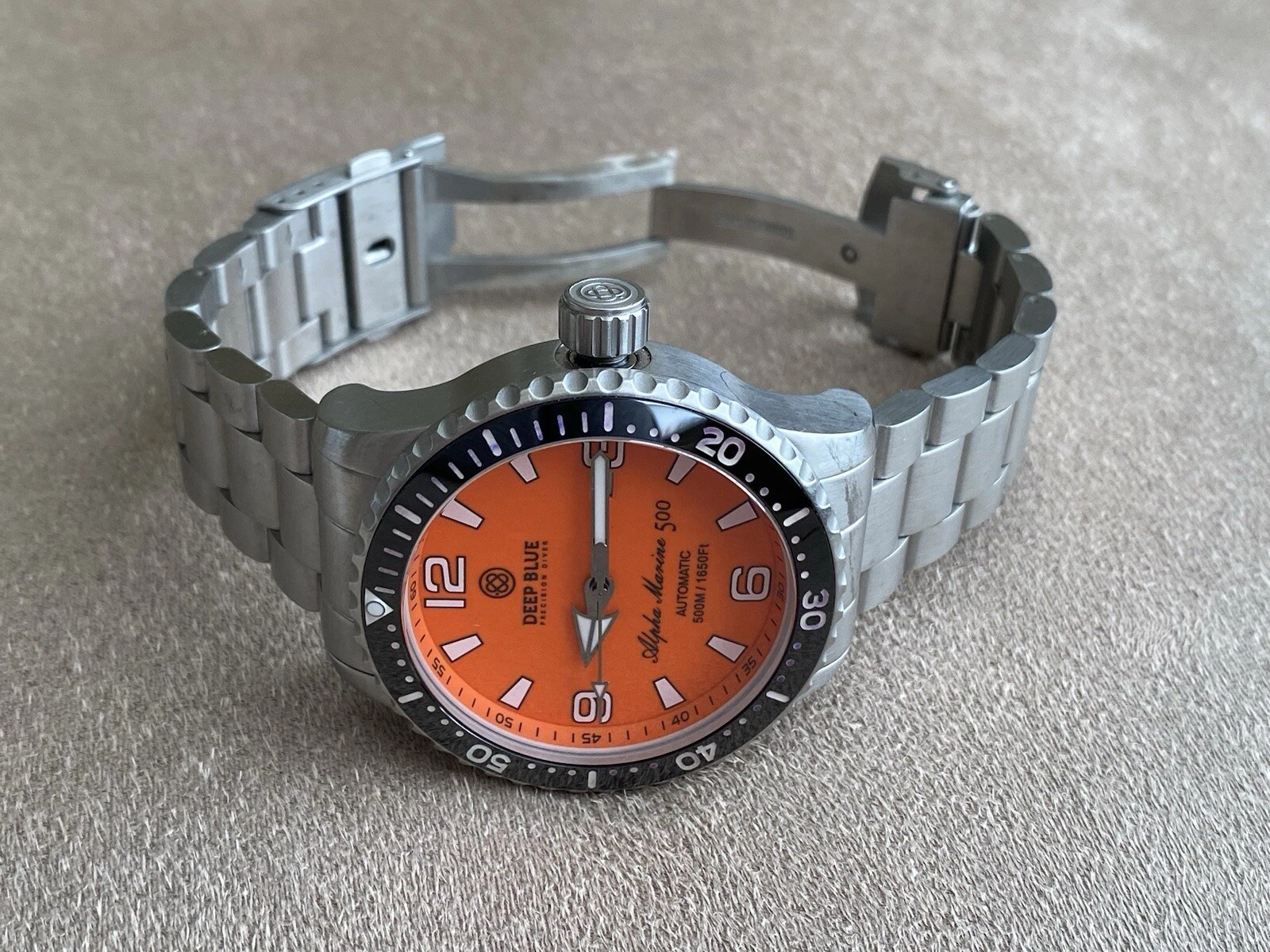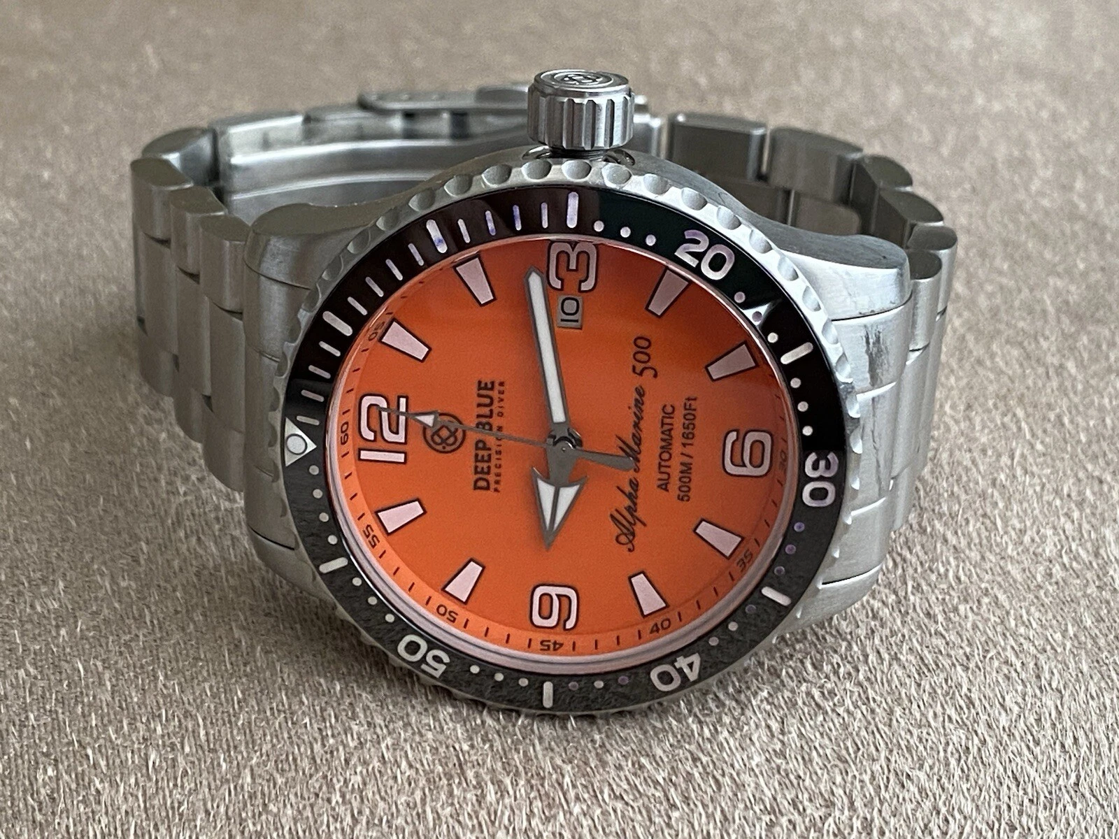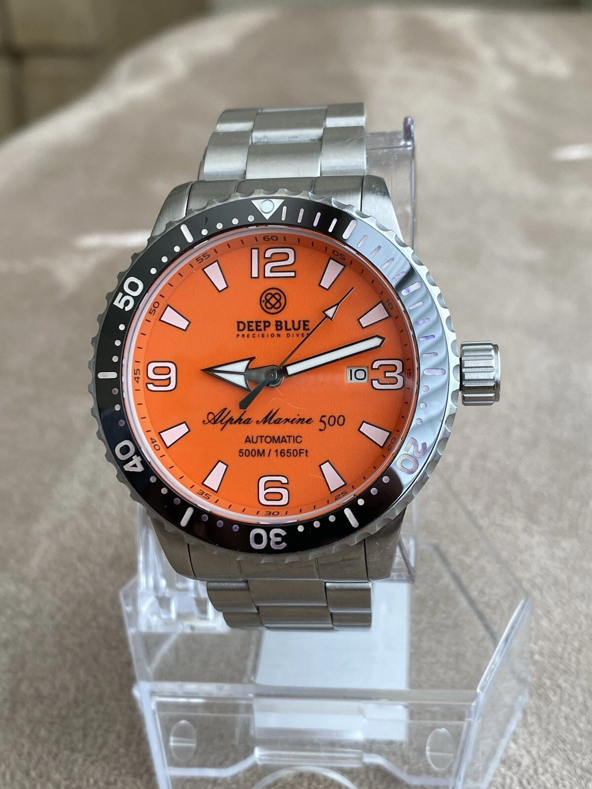 Deep Blue Alpha Marine 500 Orange Dial Swiss Automatic Men's Watch 7.5"