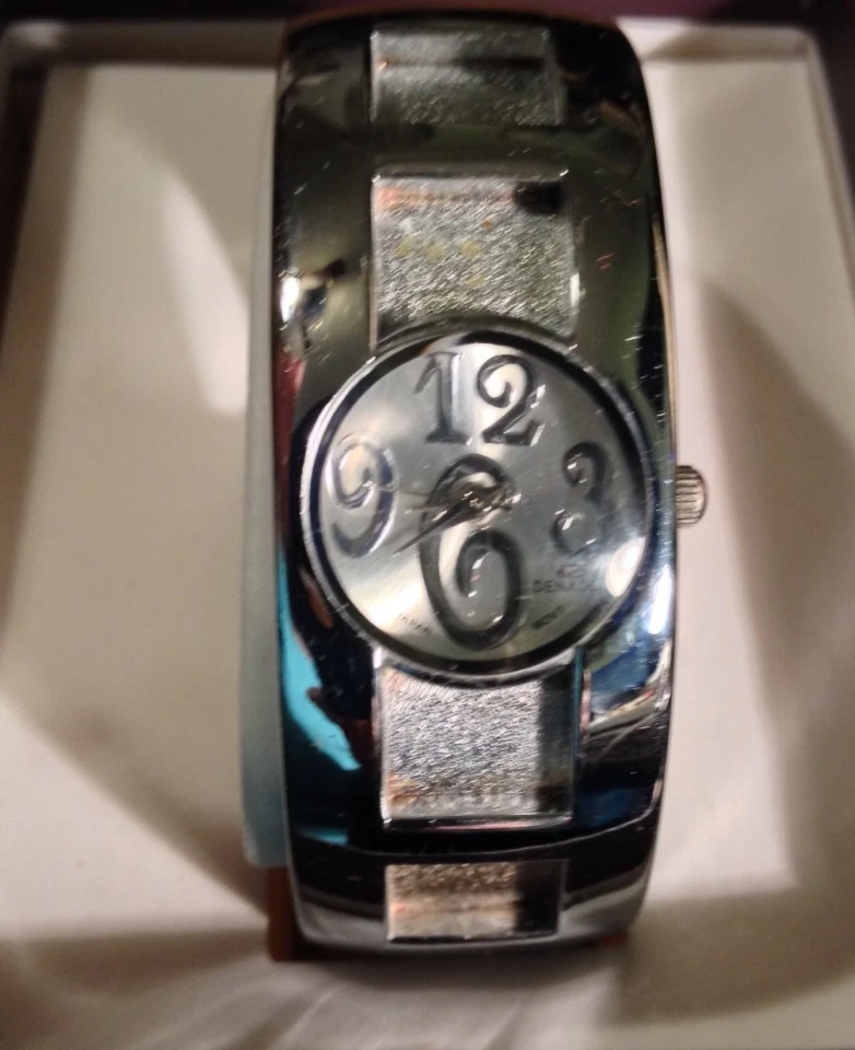 Ladies Heavy Silvertone Bangle Bracelet Style Denacci Wristwatch