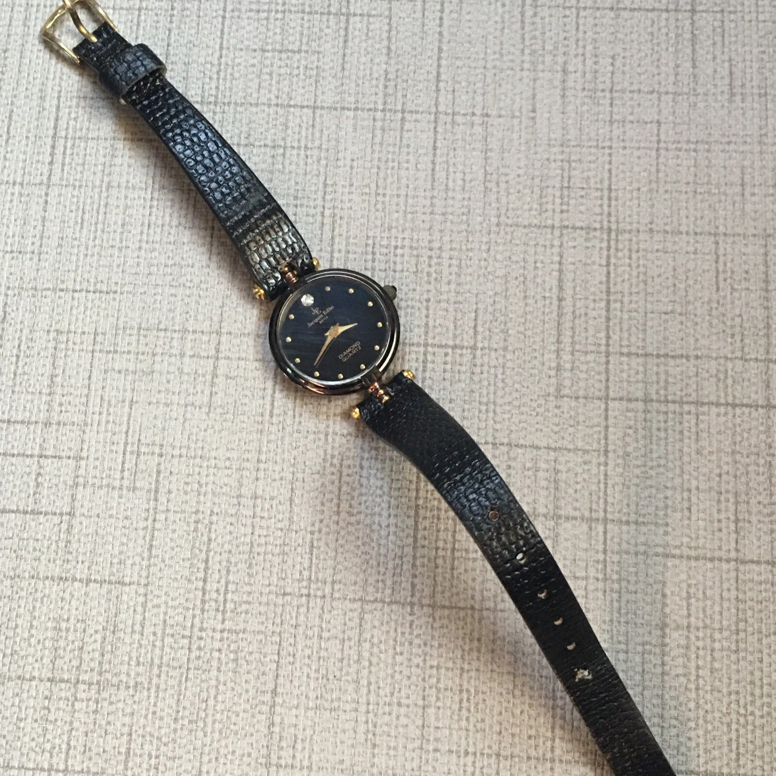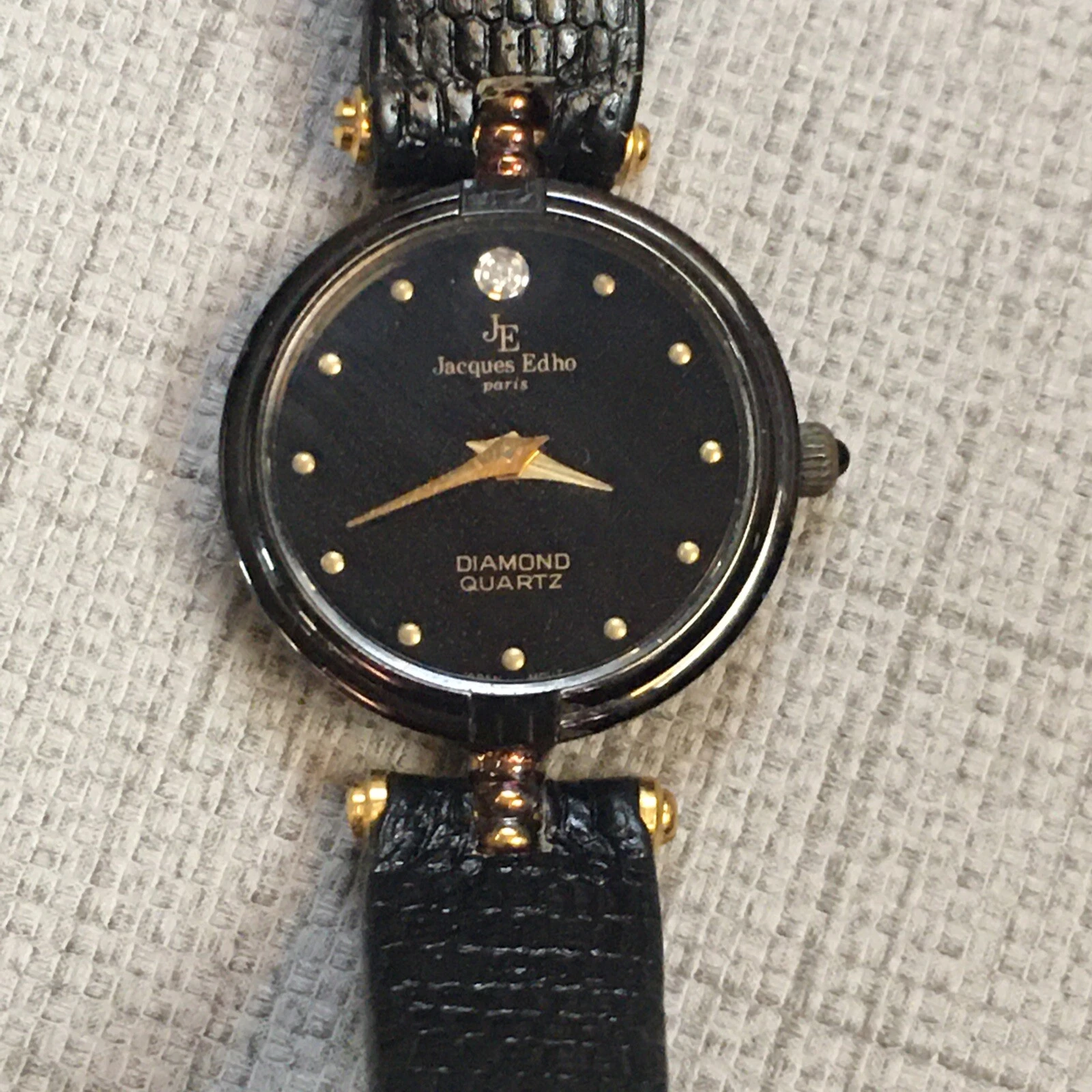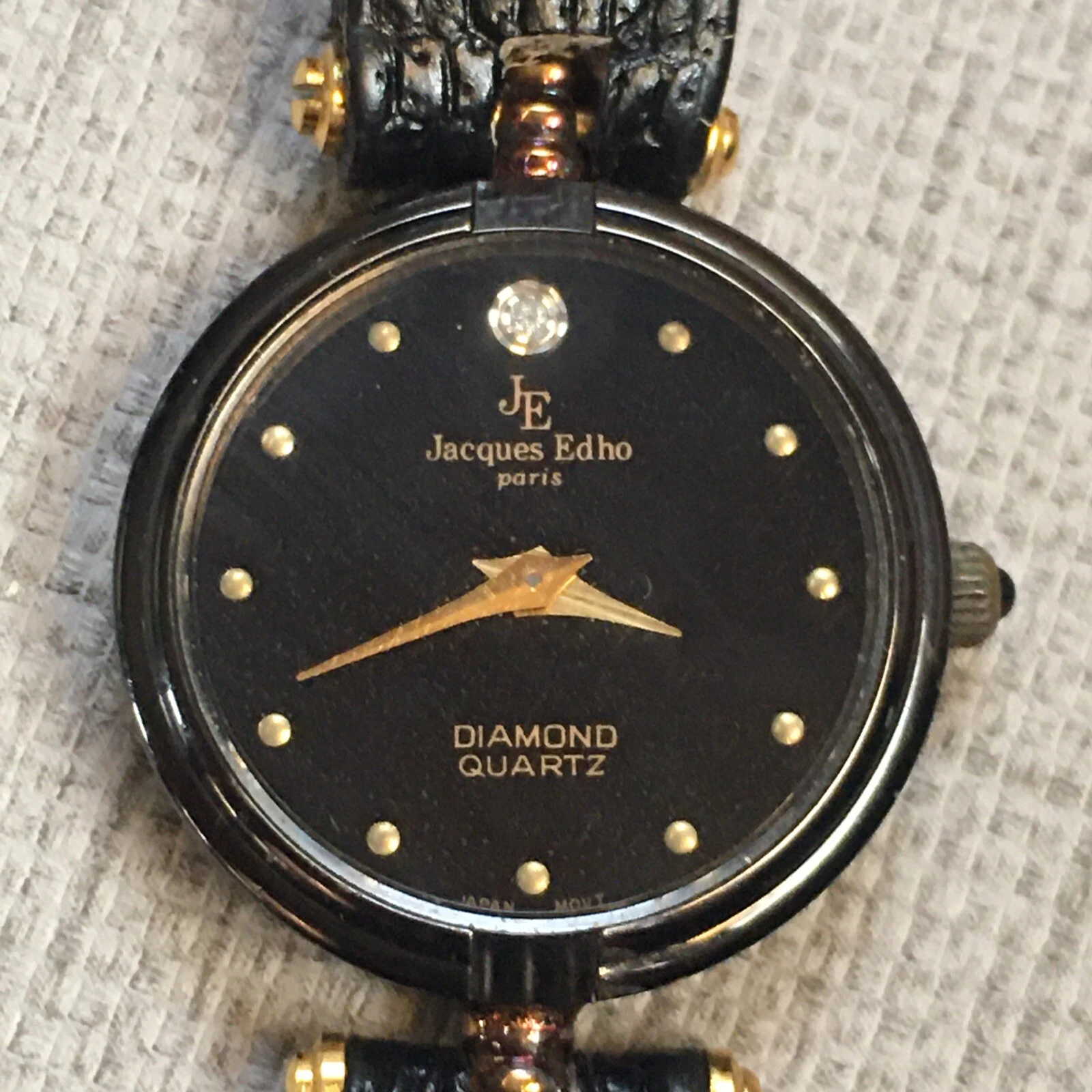 Jacques Edho Paris Diamond Quartz Wristwatch 18K Gold Plate Black Leather Band