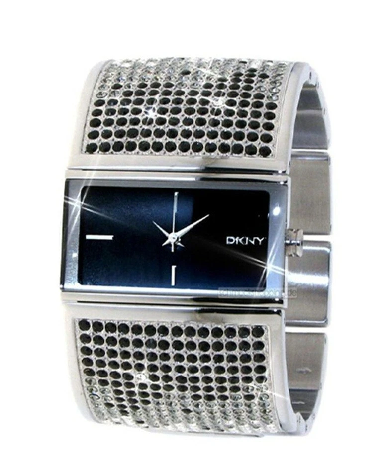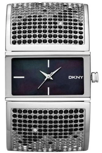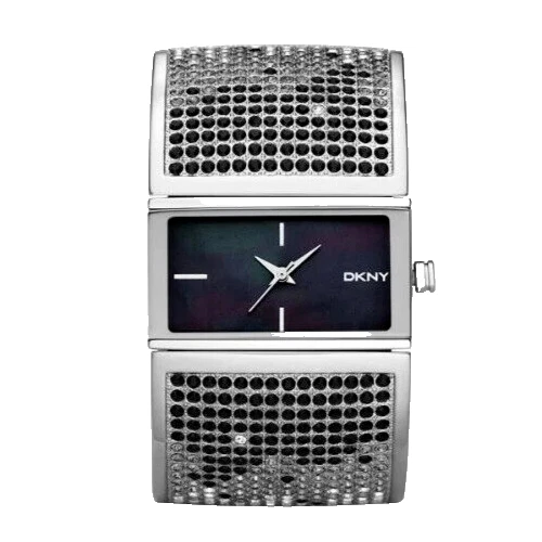 DKNY NY8043 Women Rectangle Watch Silver Steel Bracelet Black Dial Crystals