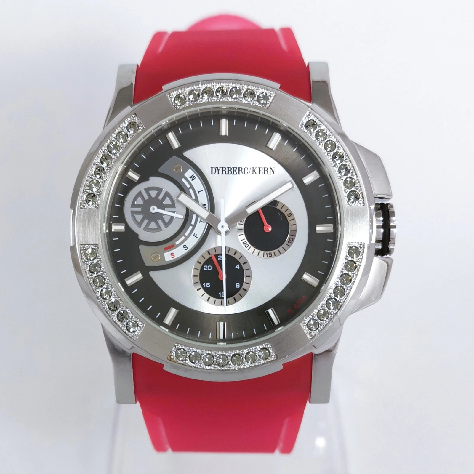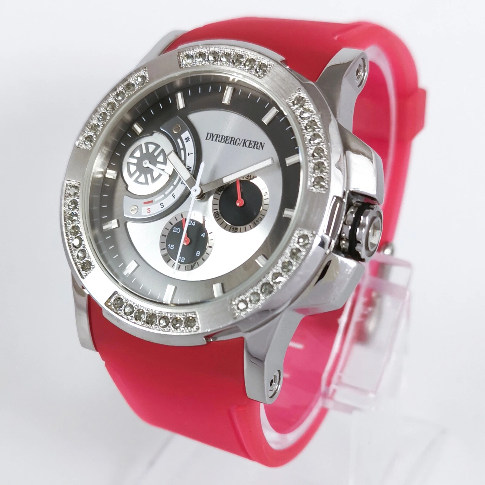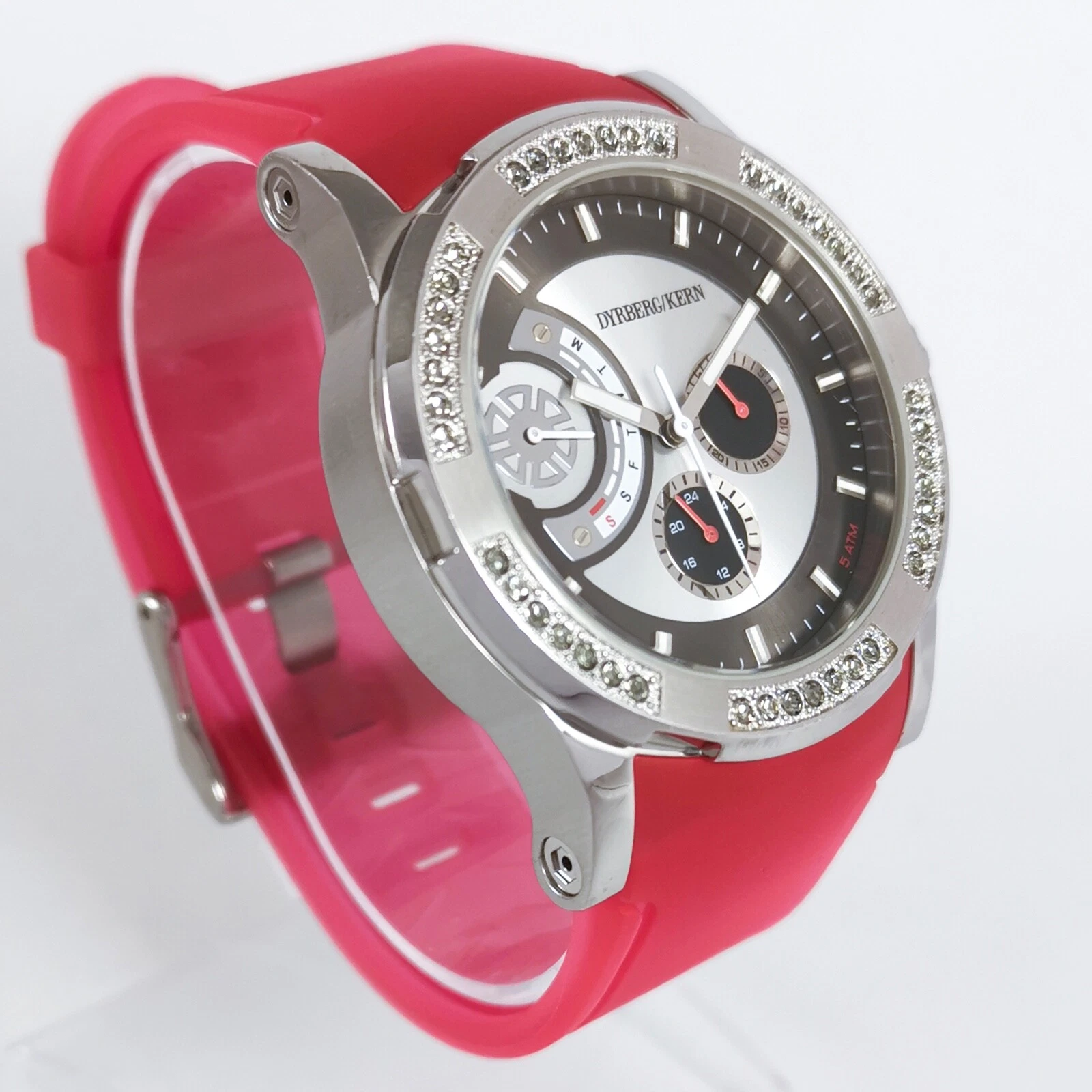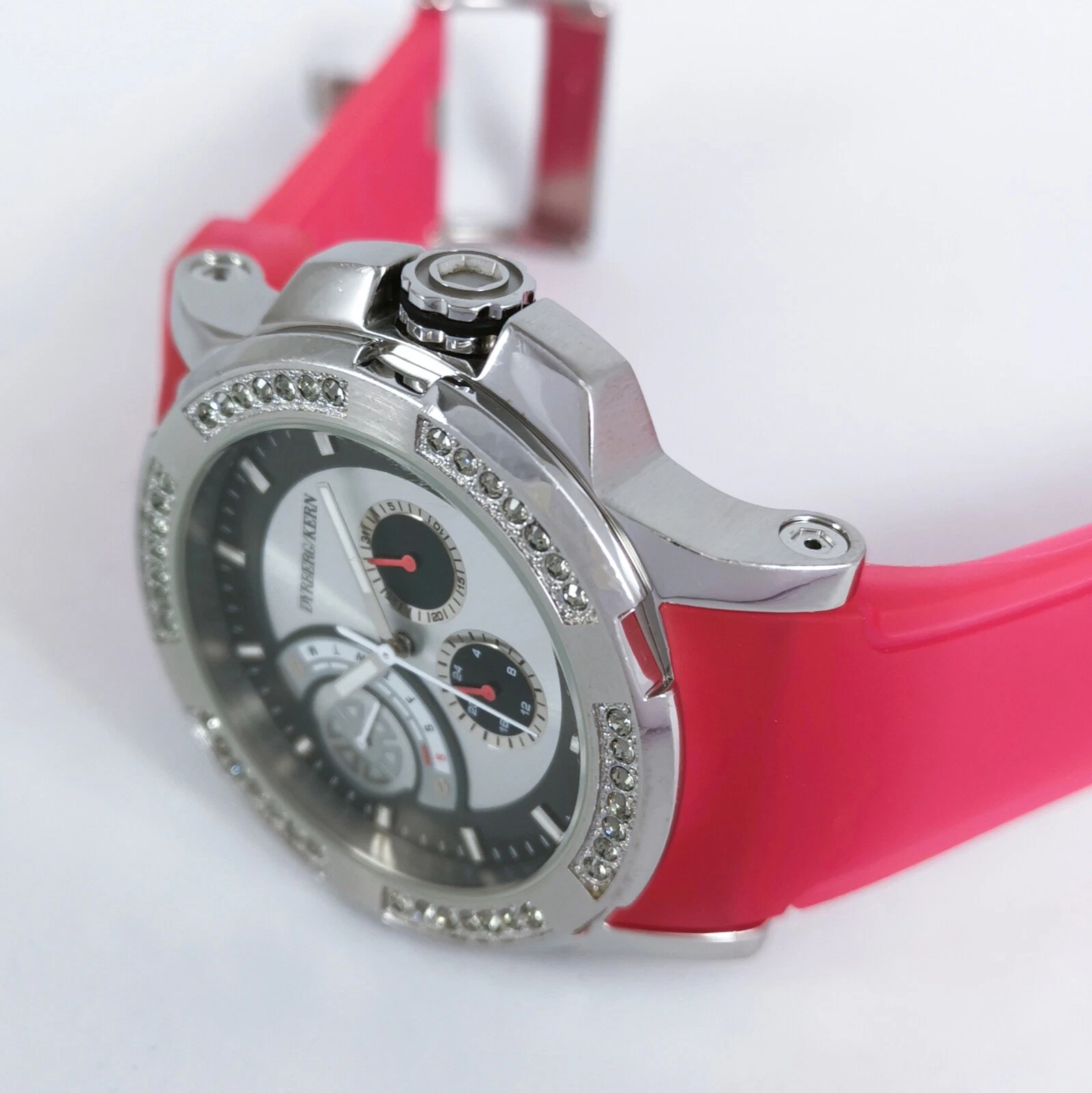 Dyrberg/Kern Silver Pink Rubber Strap Diamonds Quartz Women's Wrist Watch