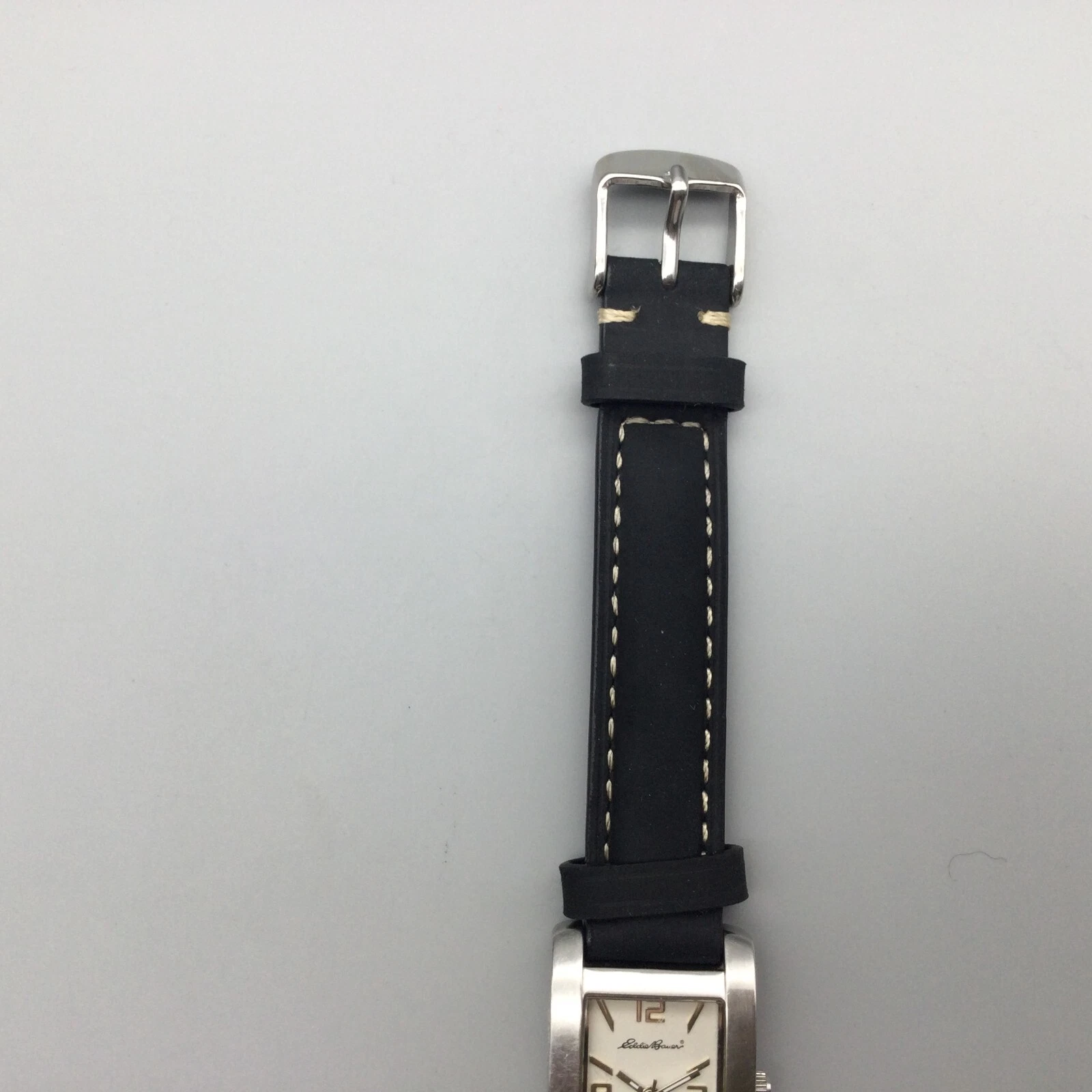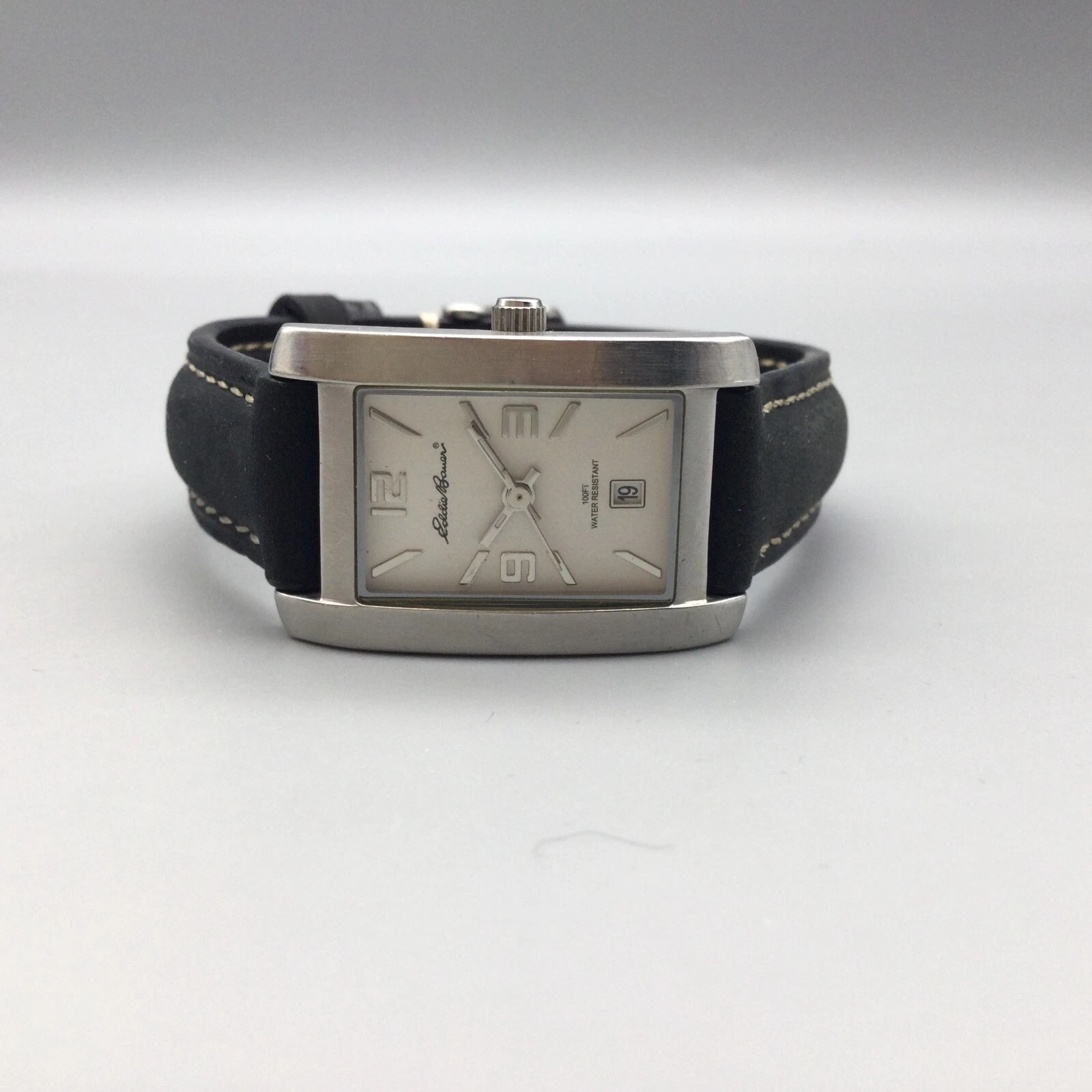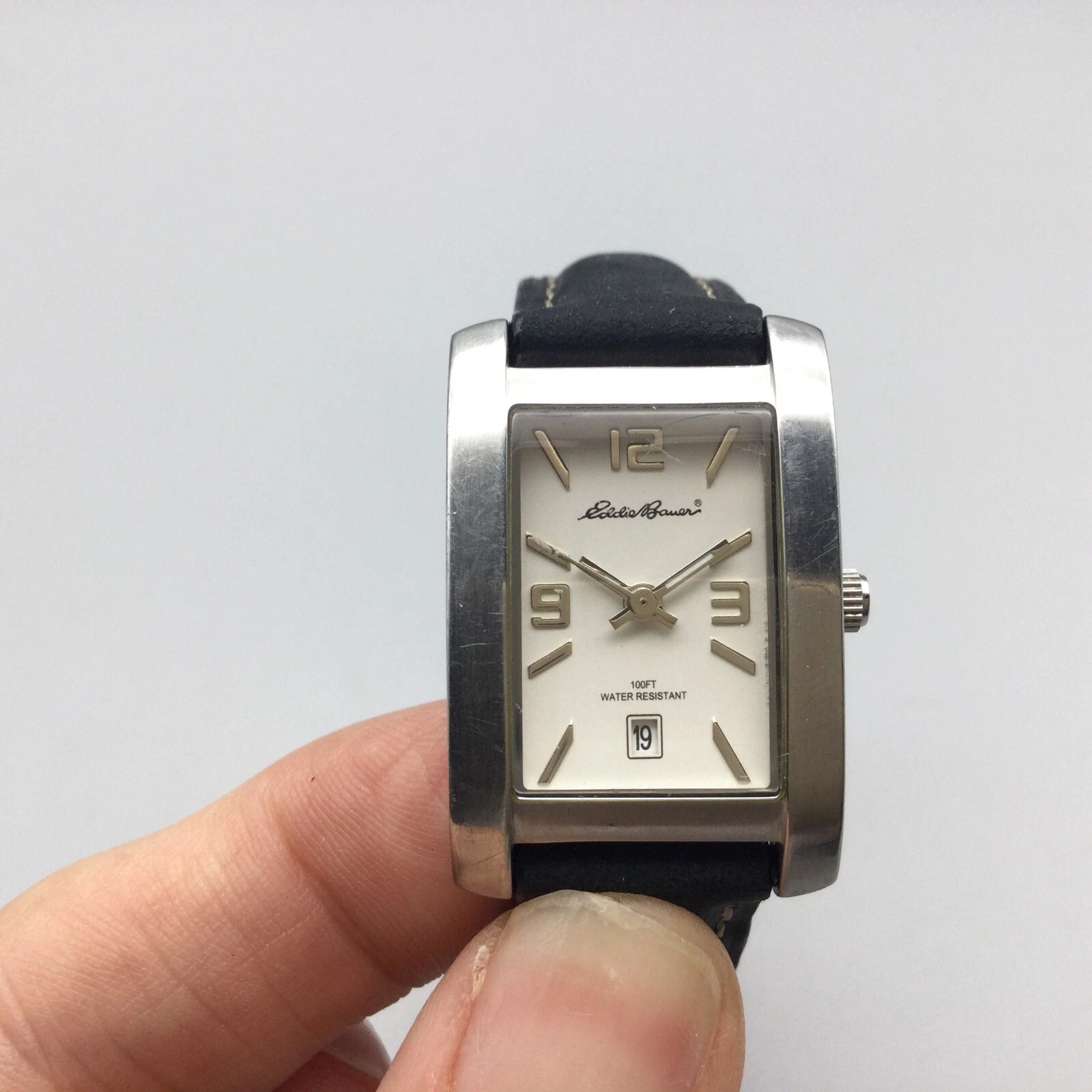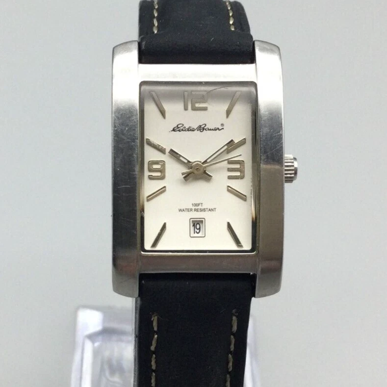 Eddie Bauer Tank Watch Women 21mm Silver Tone Date Leather Band New Battery