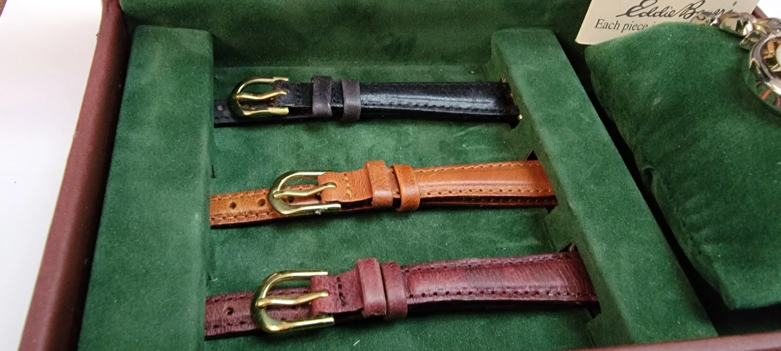 Vintage Eddie Bauer Women's Two Tone Watch w/ Extra Leather Bands NEEDS BATTERY