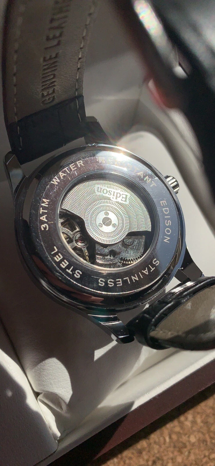 Men's Automatic Edison Skeleton Watch Blue Dial Glass Back RRP £550