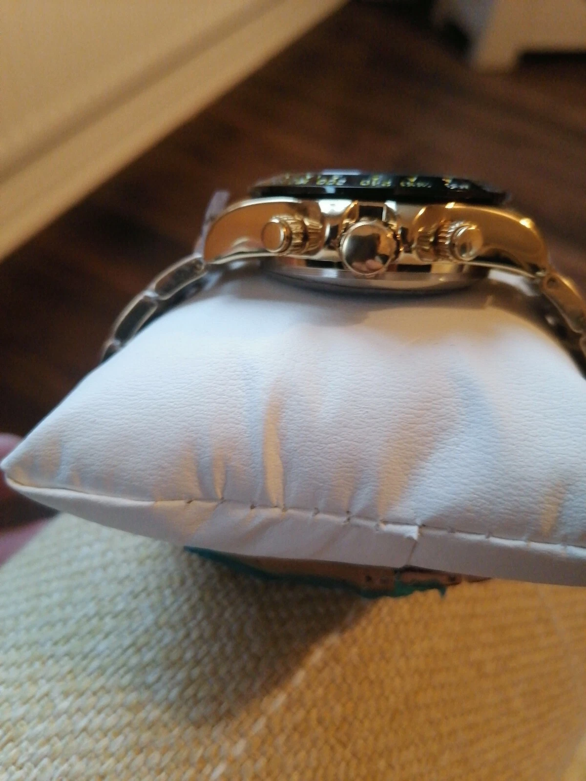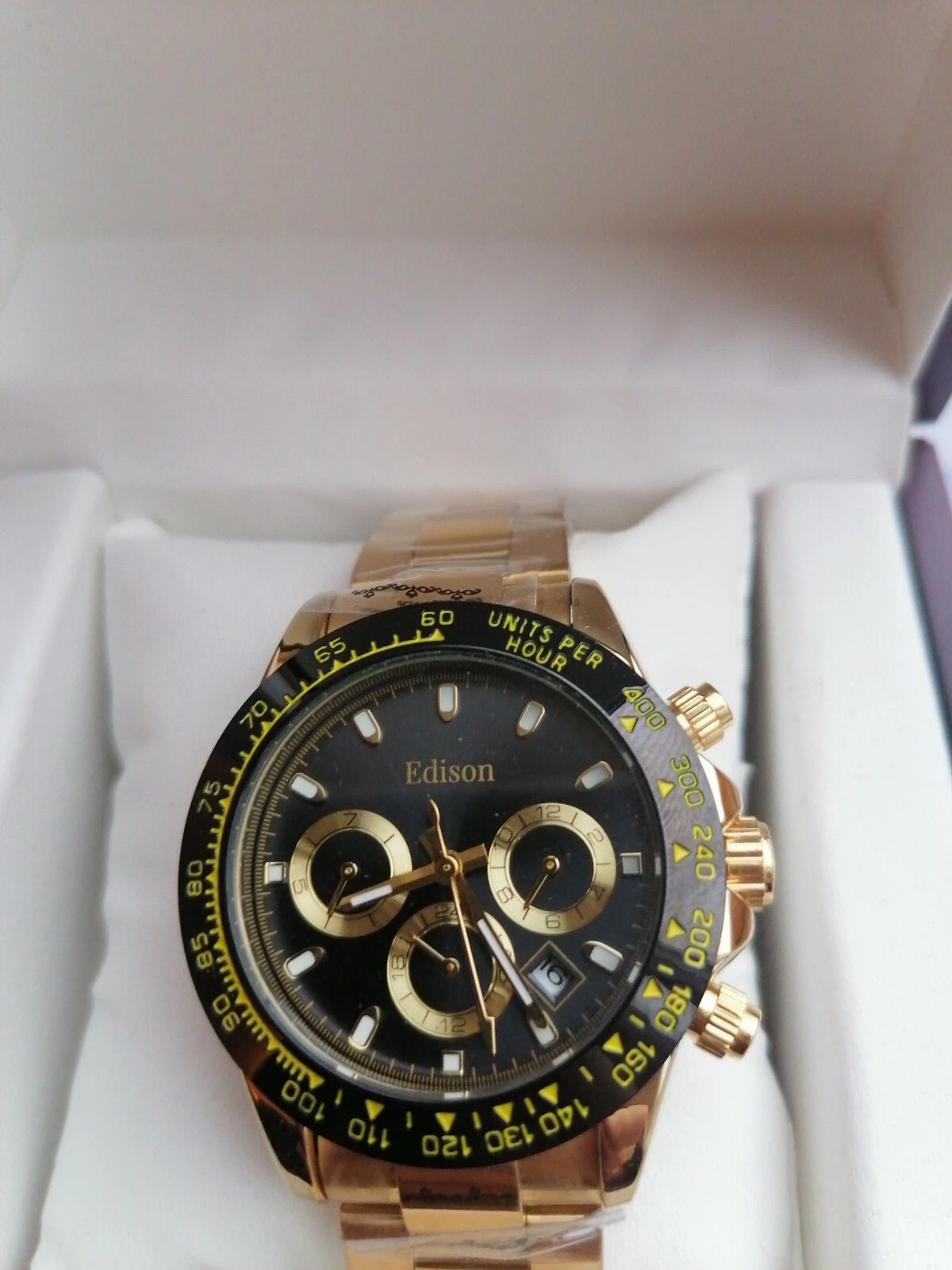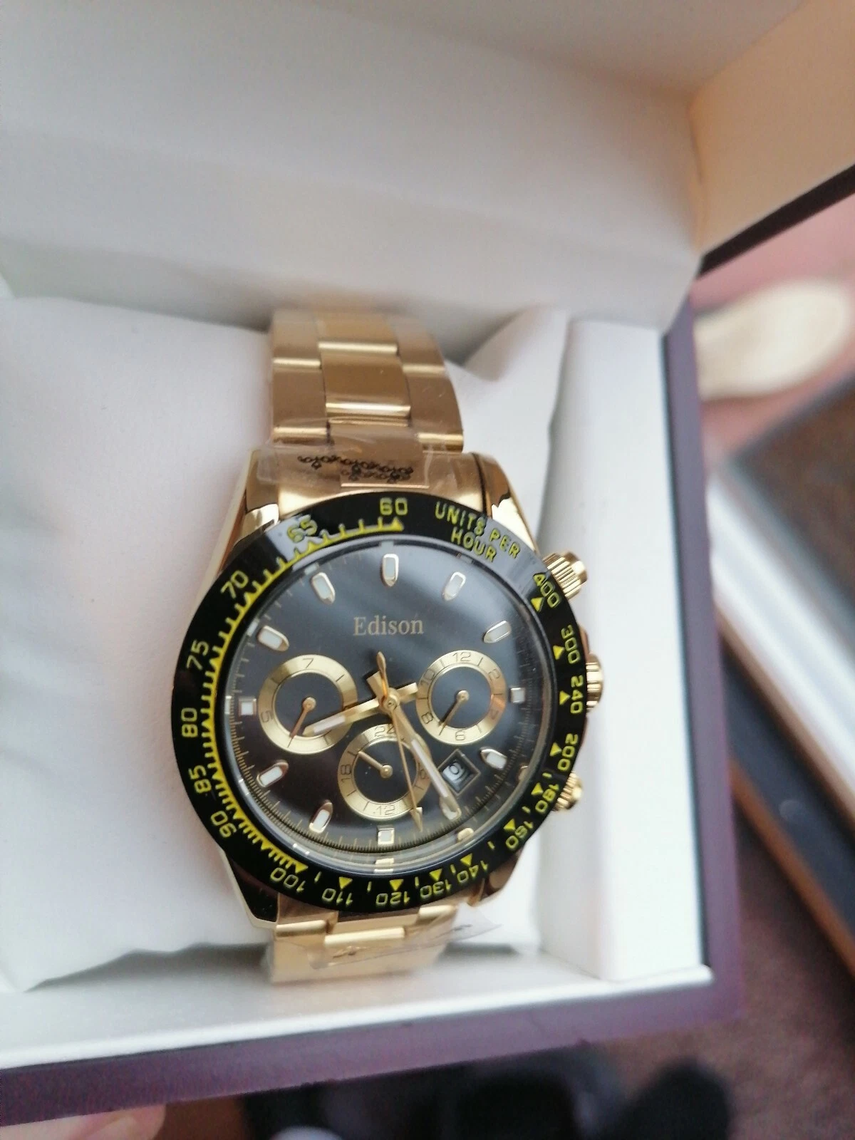 MEN’S EDISON AUTOMATIC WATCH, GOLD COLOUR STAINLESS STEEL STRAP, BLACK DIAL,