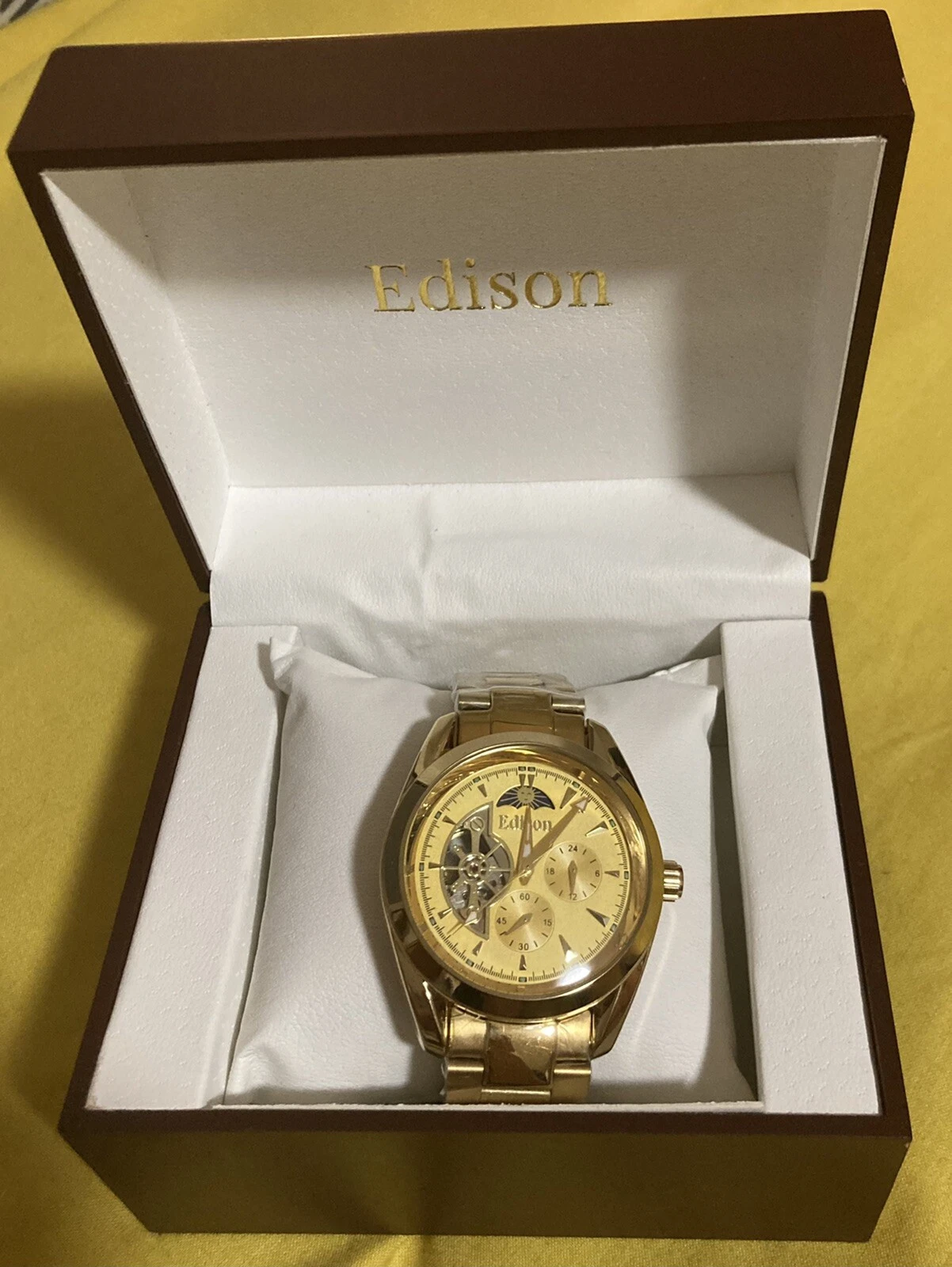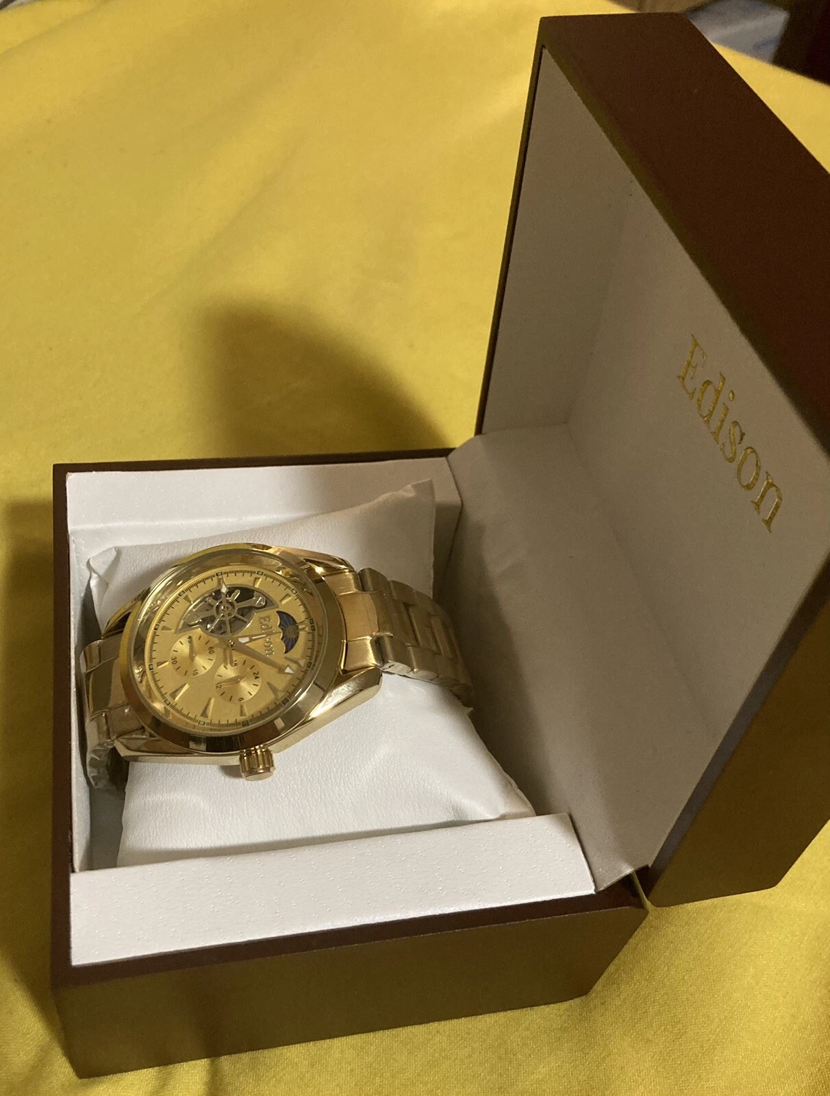 MENS EDISON AUTOMATIC WATCH MOONPHASE GOLD COLOUR STAINLESS STEEL STRAP BOX