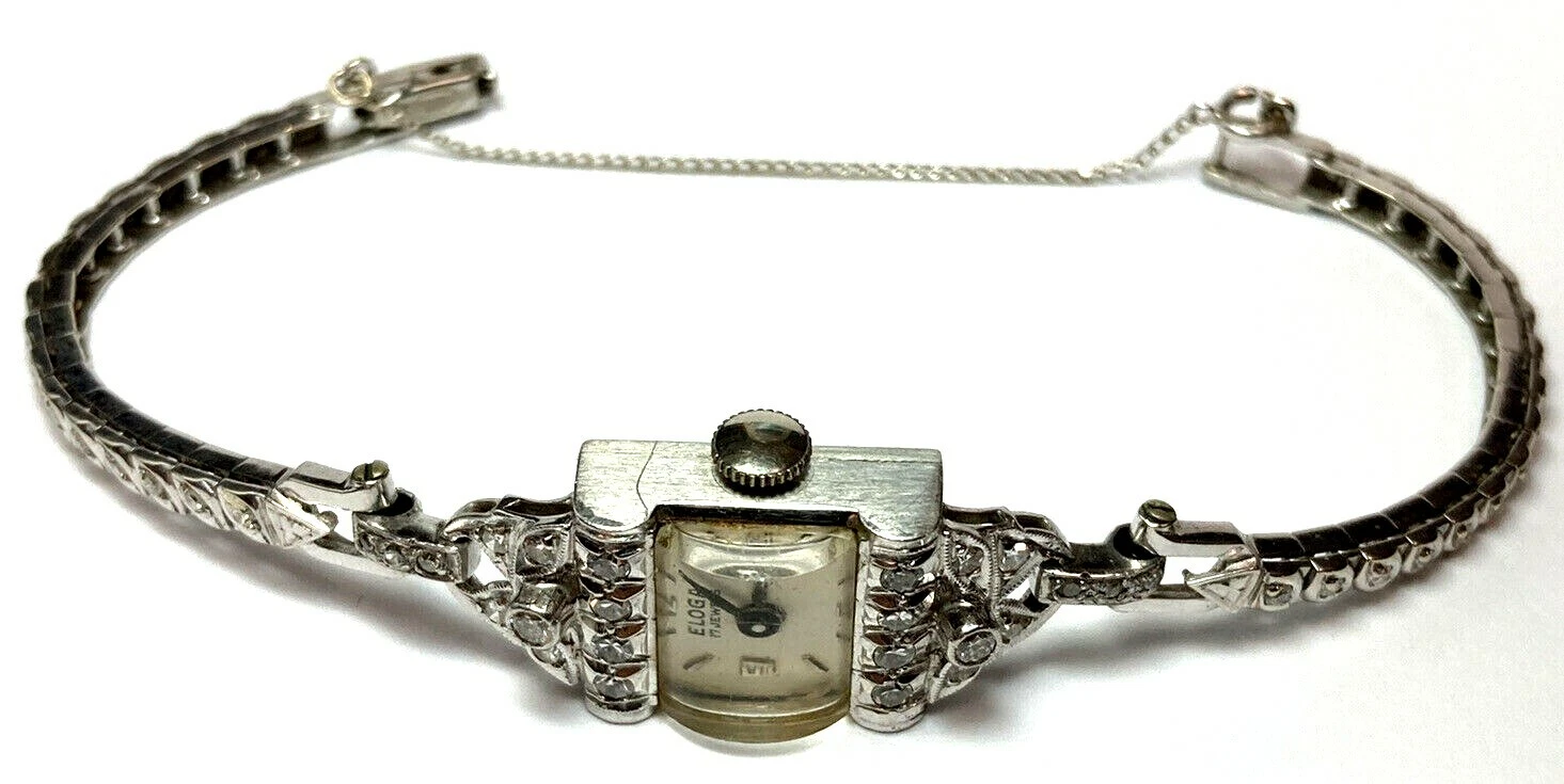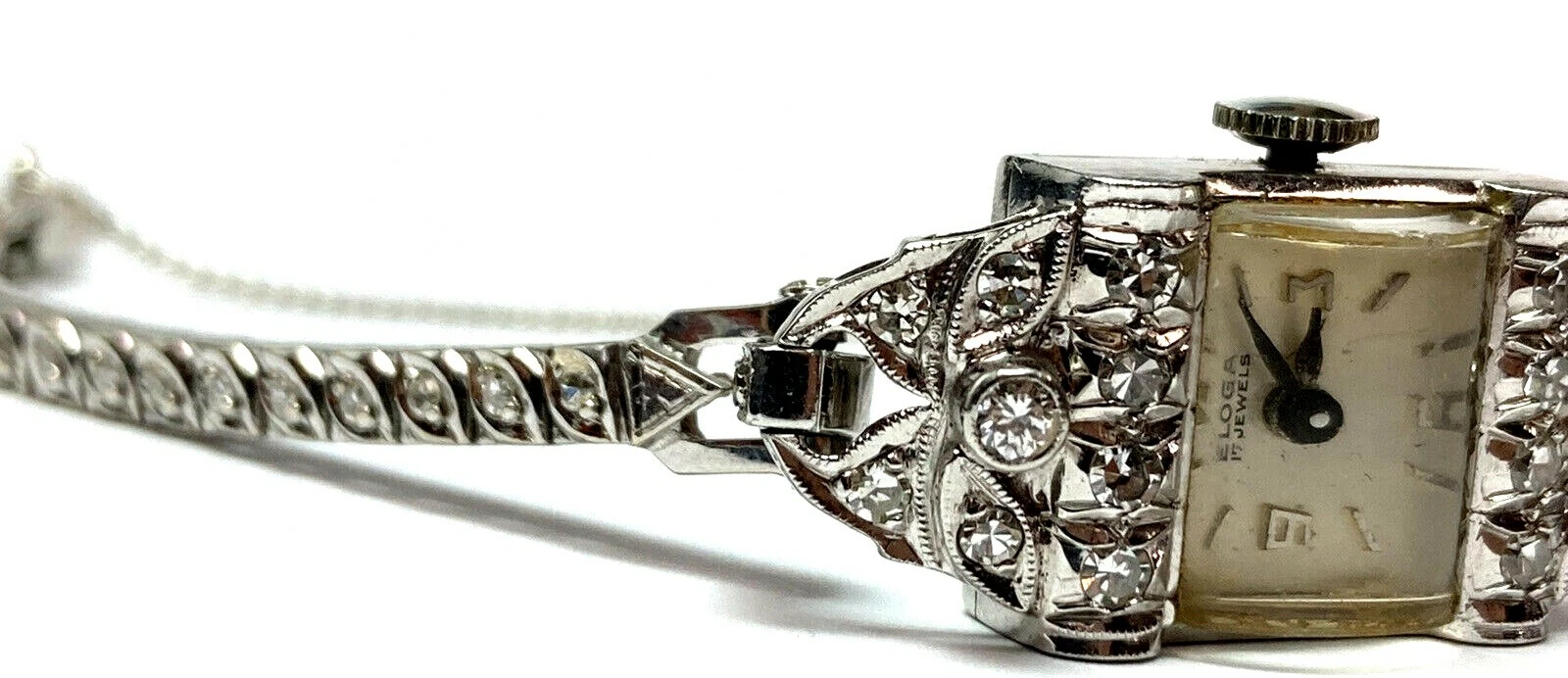 Eloga Solid 14k White Gold Art Deco Ladies Diamond Wrist Watch