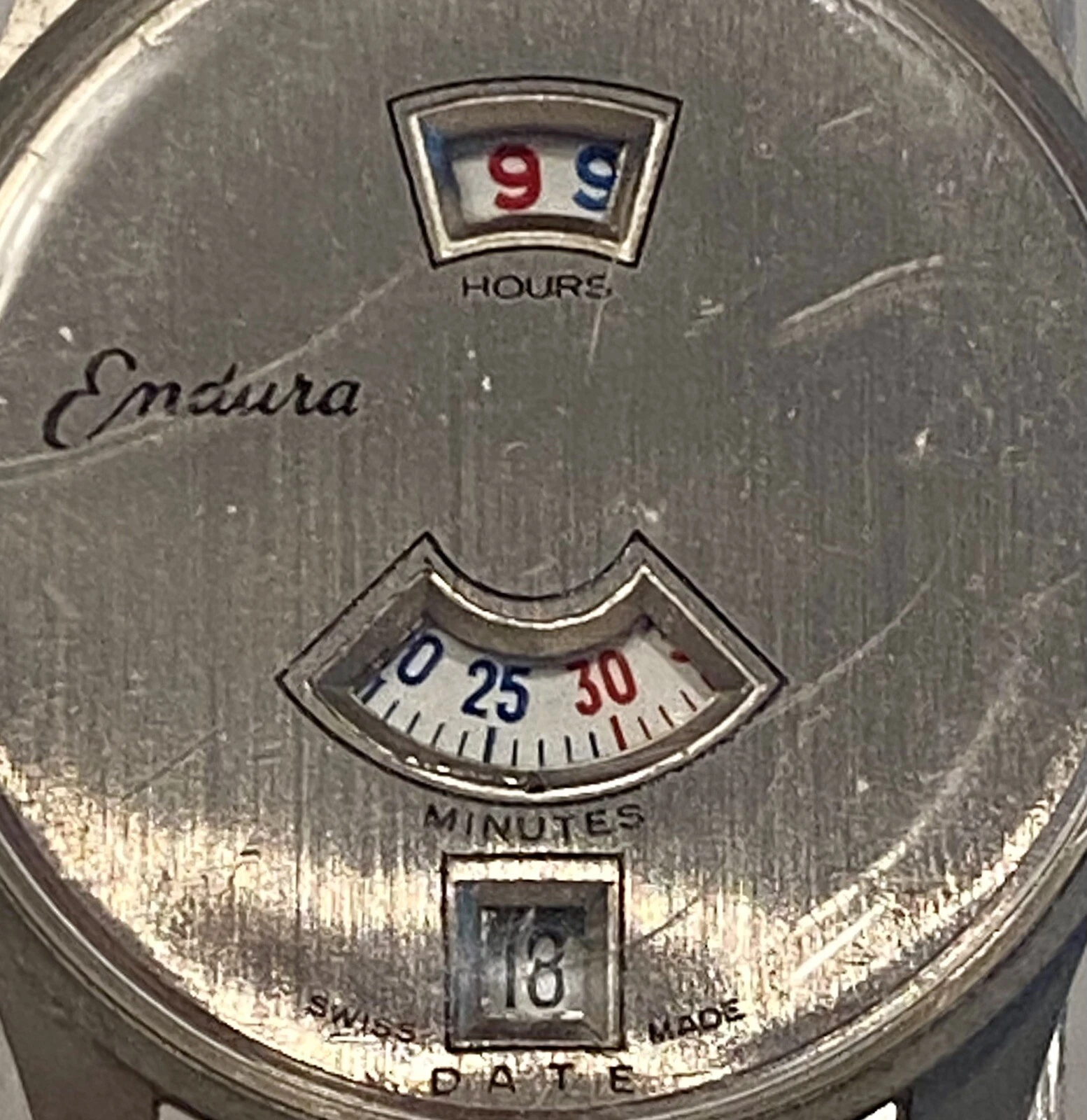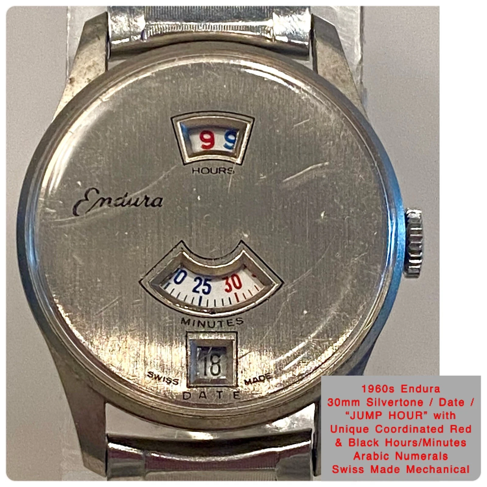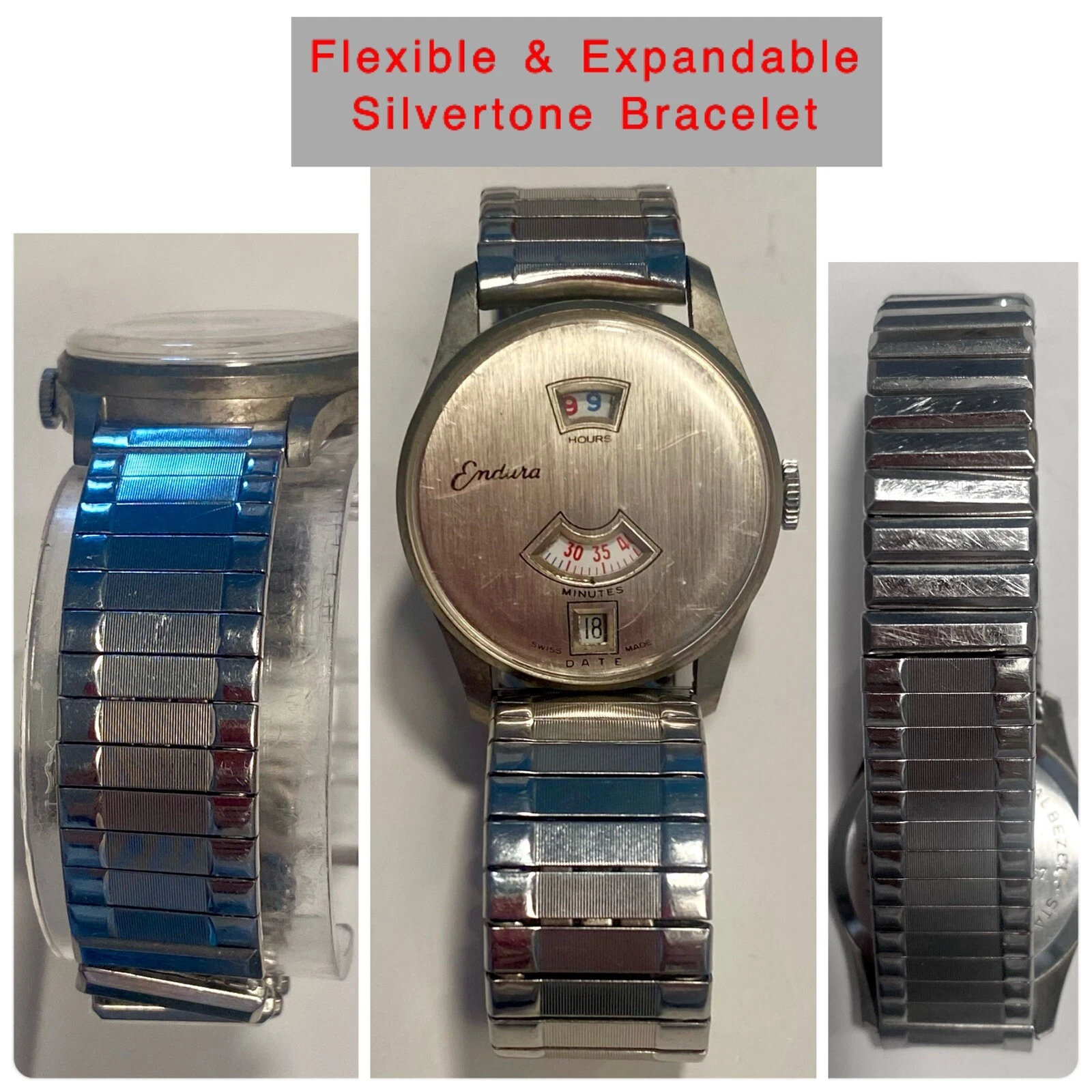 Vintage 1960s JUMP HOUR w/ Date Mechanical 30mm Silvertone Bracelet ENDURA Watch