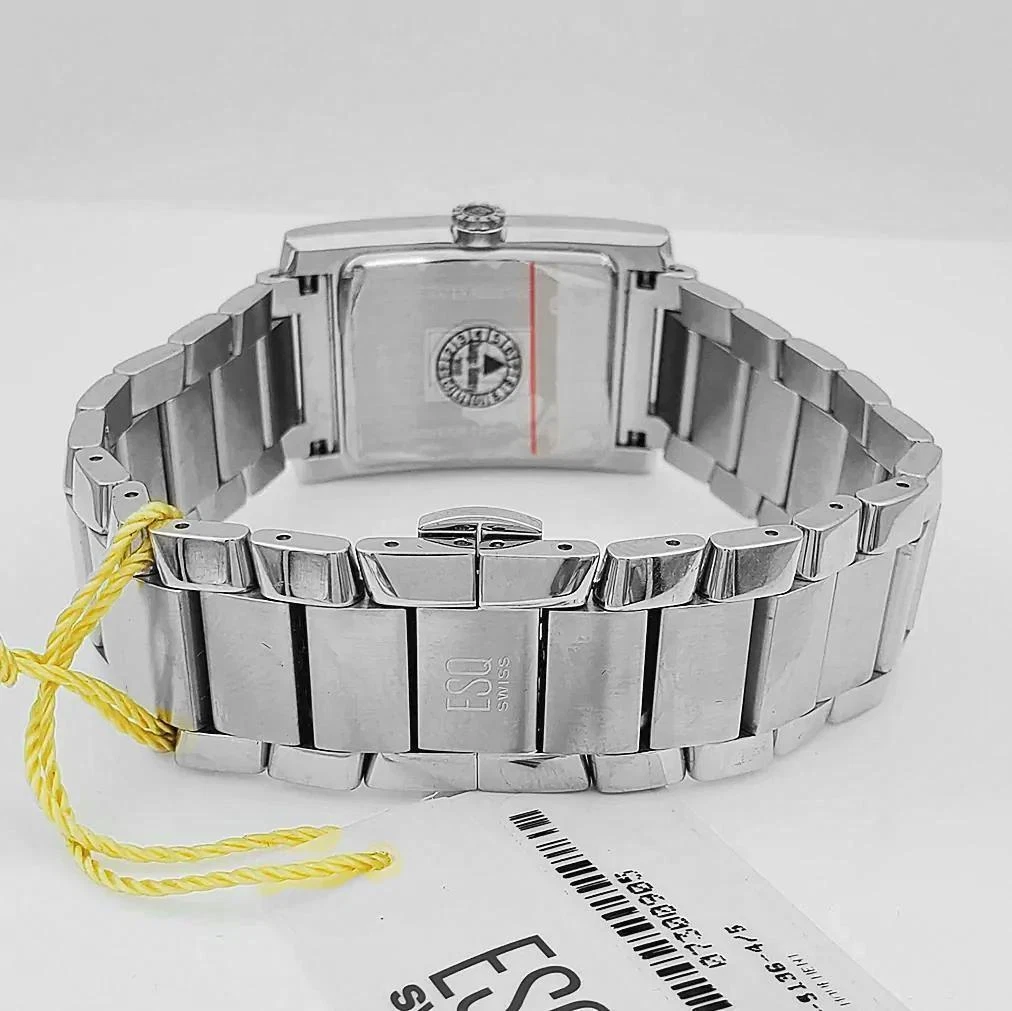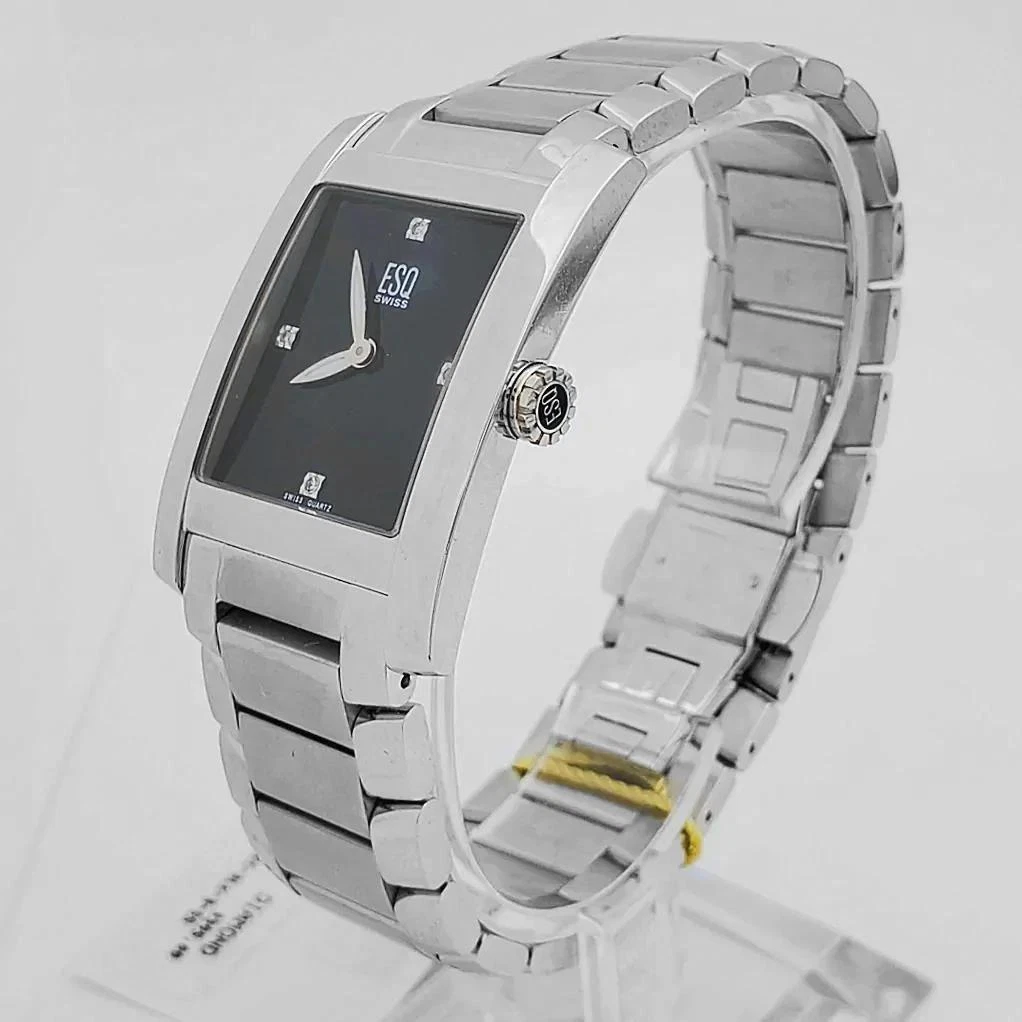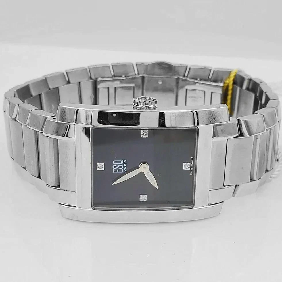 Ladies ESQ Swiss Movado Venture Stainless Steel Watch with Black Diamond Dial.