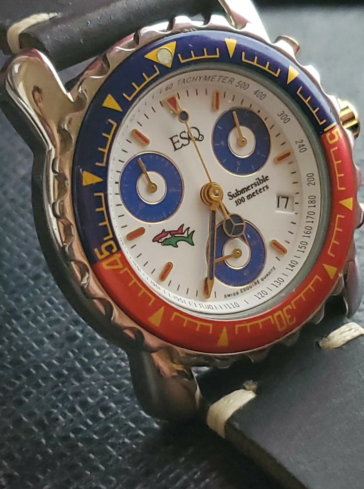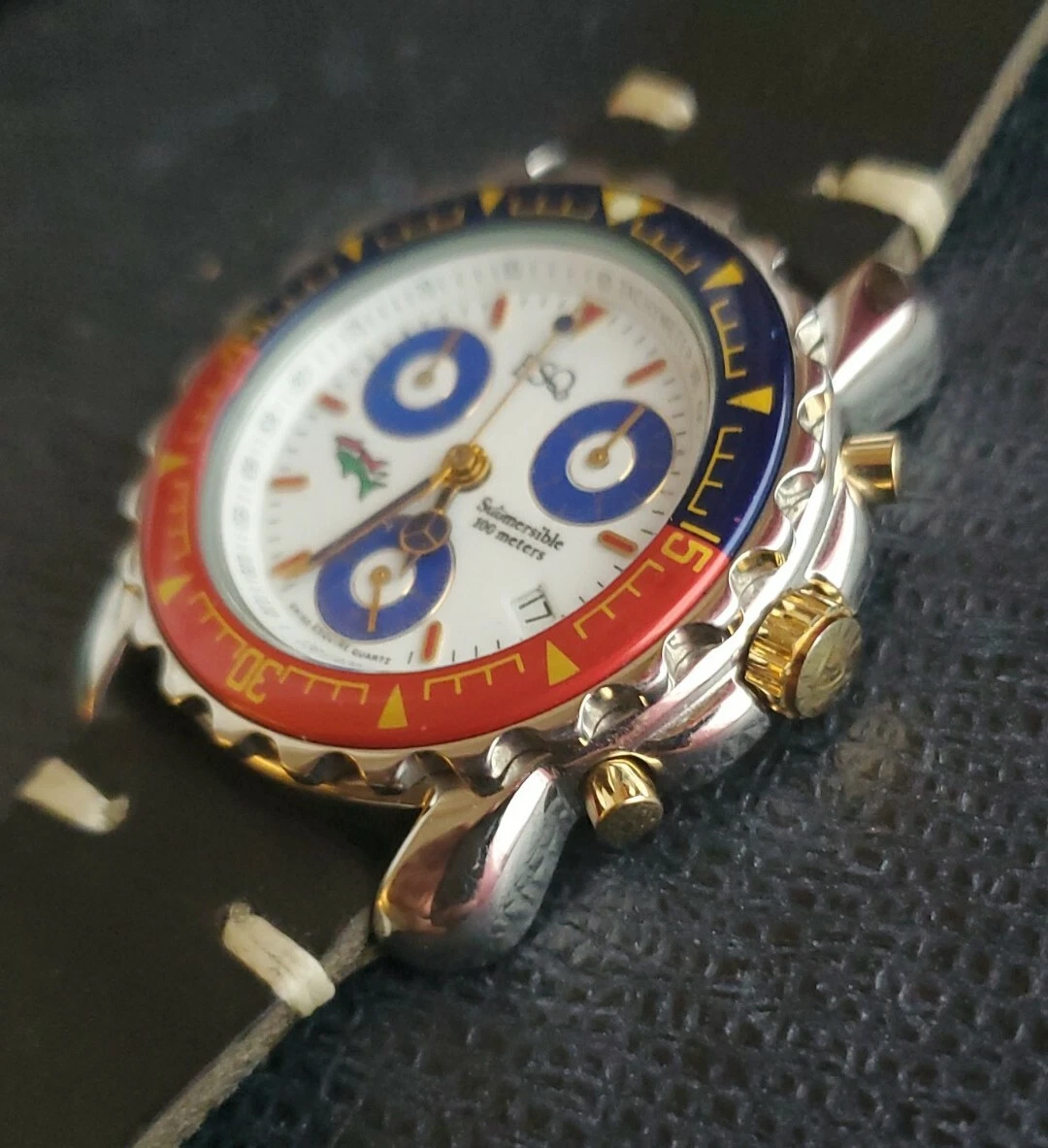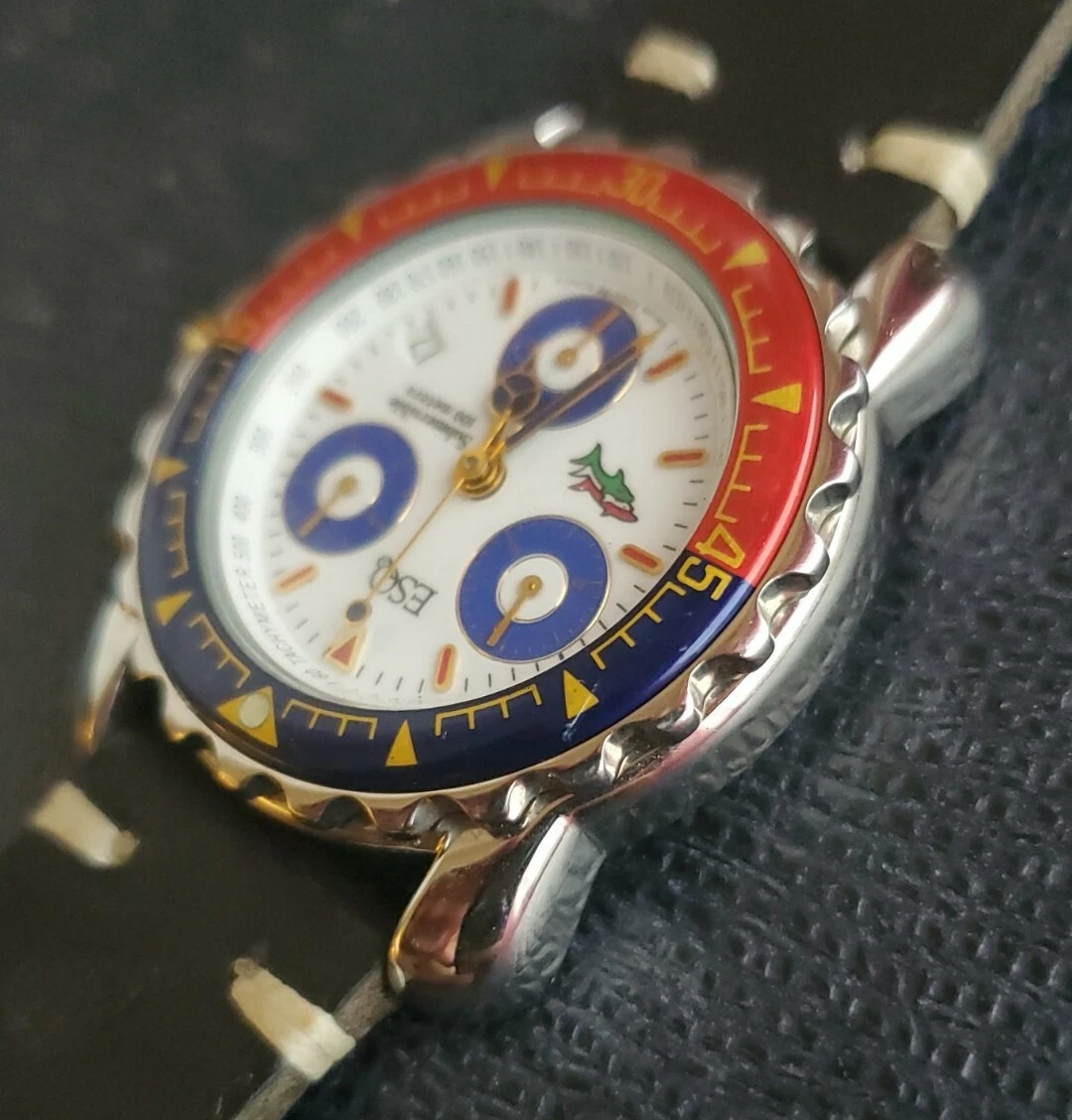 Vintage Movado ESQ Chrono Swiss Quartz Rare Clown Dial,Pepsi Bezel & New Band.